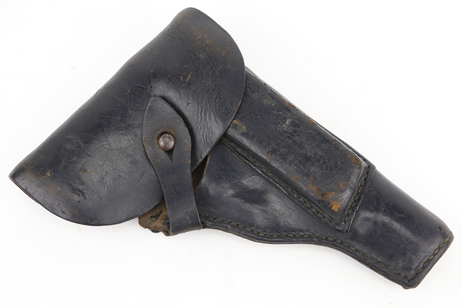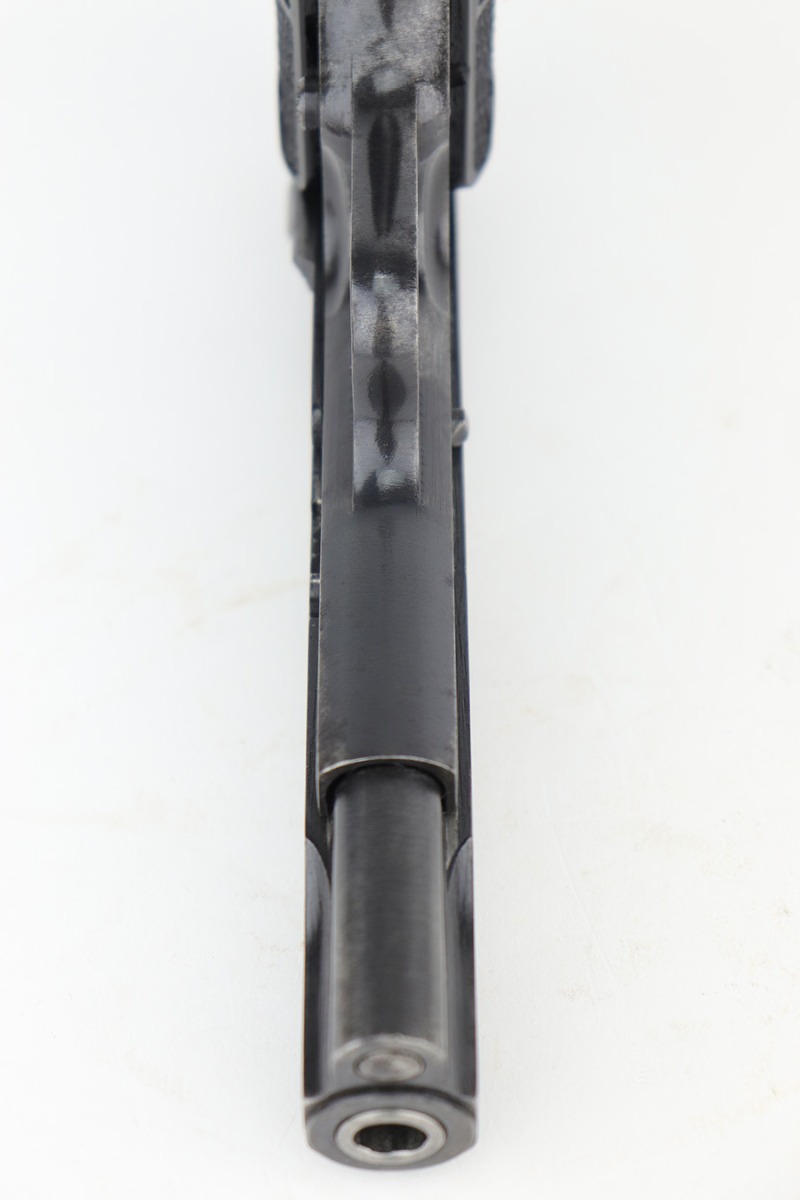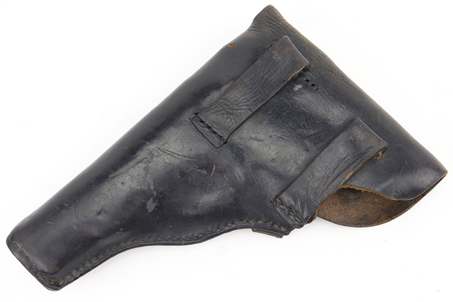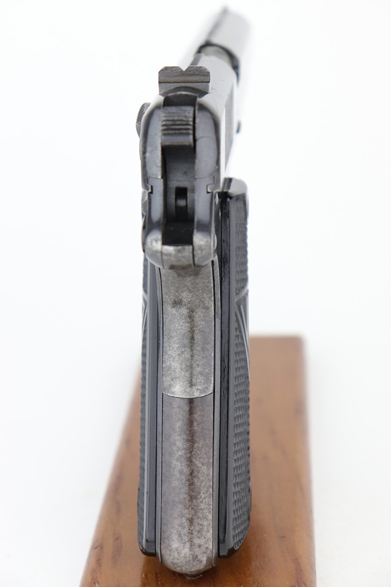 6/19/23 – This is a very nice example of a Radom VIS 35 issued to the Nazi military during WW2. This one is of the earlier 3-lever variation. It is all matching and has the proper “Waffen 77” and “Eagle 623” military acceptance proofs. It comes as a rig with one proper waffen-proofed magazine and a nice un-marked black leather holster (slightly cut down around the right belt loop. The gun itself has retained about 92% of its original finish. The majority of the finish loss is on the back strap, but there is also some minor thinning on the front half of the right side of the slide. There is light spotty oxidation on both grip straps, and some noticeable spots of oxidation and minor pitting here and there on both sides of the slide. Fitted with excellent period-correct black bakelite grips. The rifling in the bore is fairly worn with minor pitting and oxidation in the grooves.