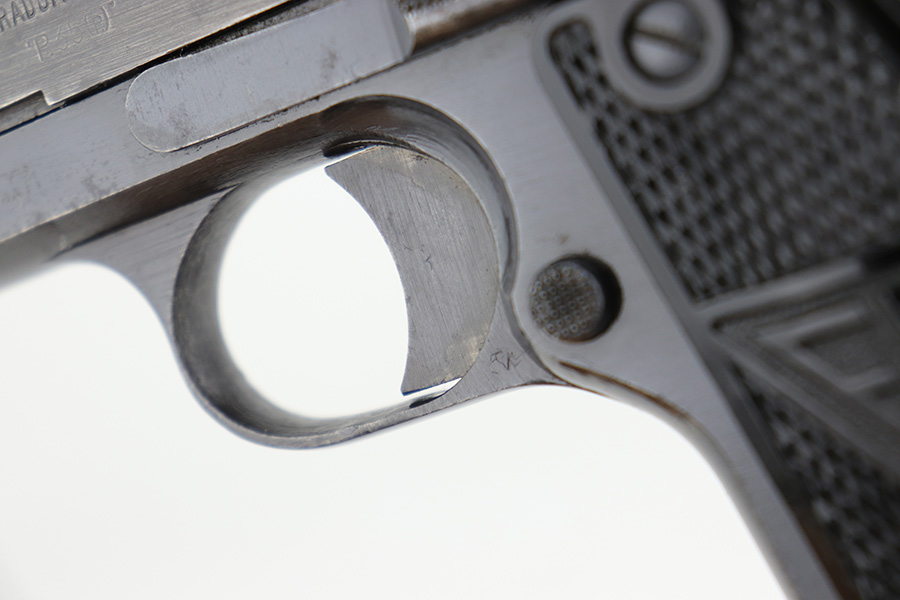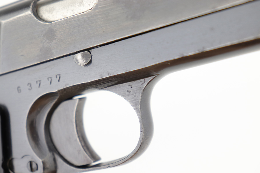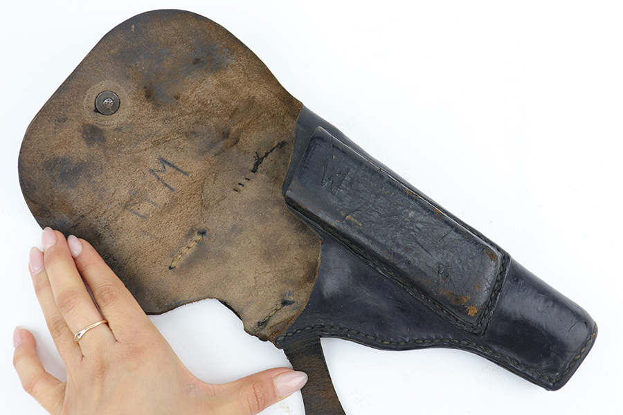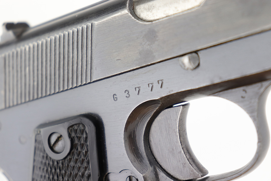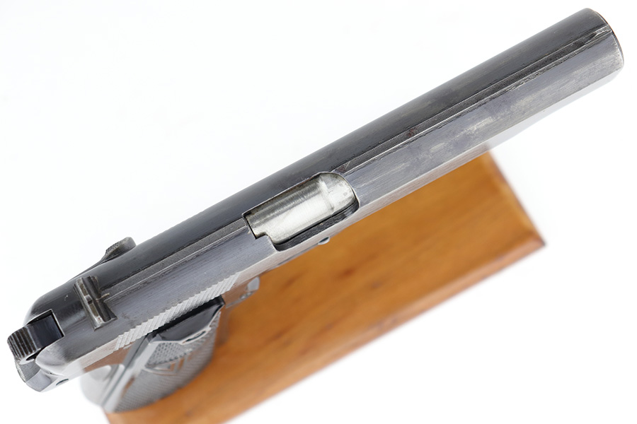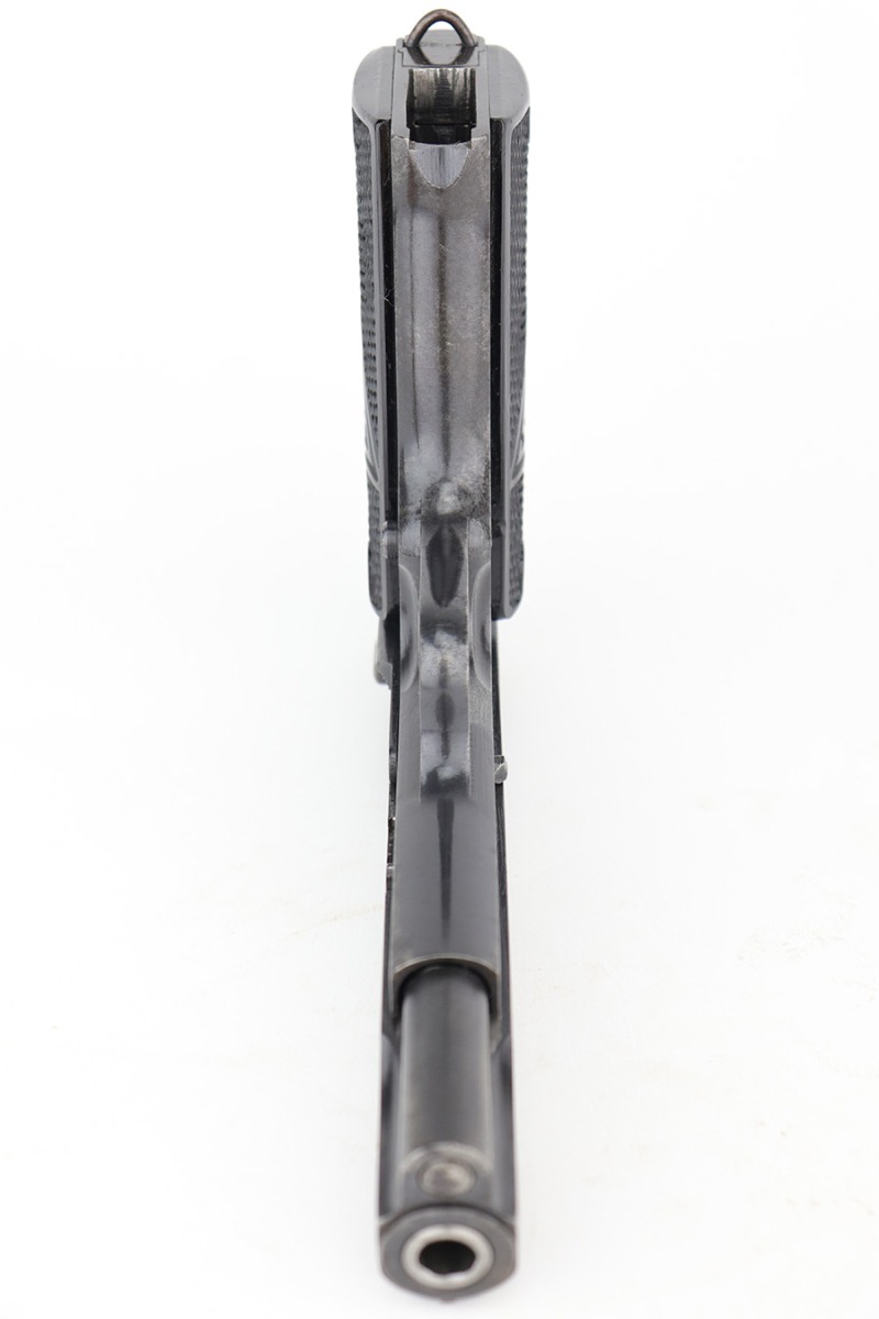 6/19/23 – This is a very nice example of a Radom VIS 35 issued to the Nazi military during WW2. This one is of the earlier 3-lever variation. It is all matching and has the proper “Waffen 77” and “Eagle 623” military acceptance proofs. It comes as a rig with one proper waffen-proofed magazine and a nice un-marked black leather holster (slightly cut down around the right belt loop. The gun itself has retained about 92% of its original finish. The majority of the finish loss is on the back strap, but there is also some minor thinning on the front half of the right side of the slide. There is light spotty oxidation on both grip straps, and some noticeable spots of oxidation and minor pitting here and there on both sides of the slide. Fitted with excellent period-correct black bakelite grips. The rifling in the bore is fairly worn with minor pitting and oxidation in the grooves.