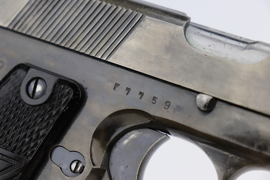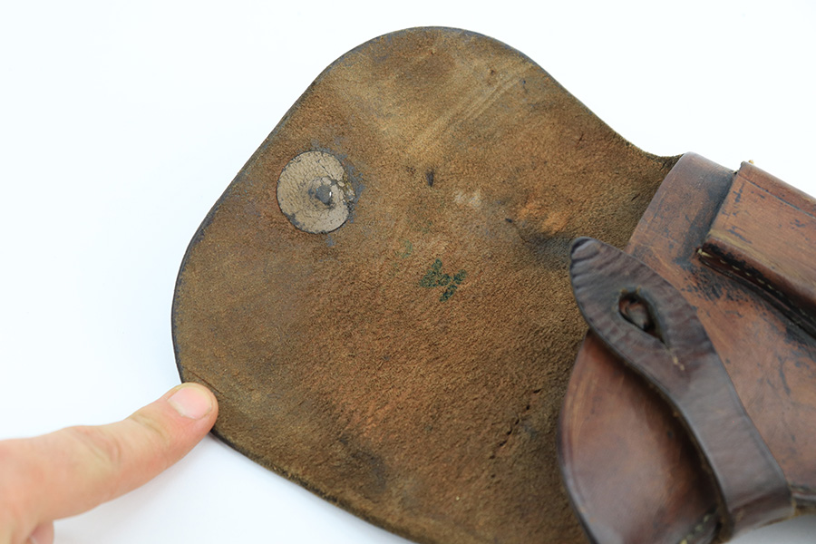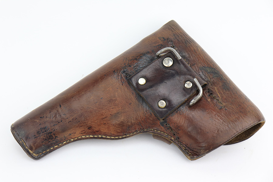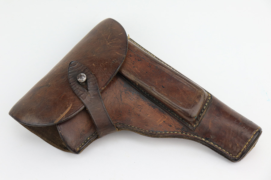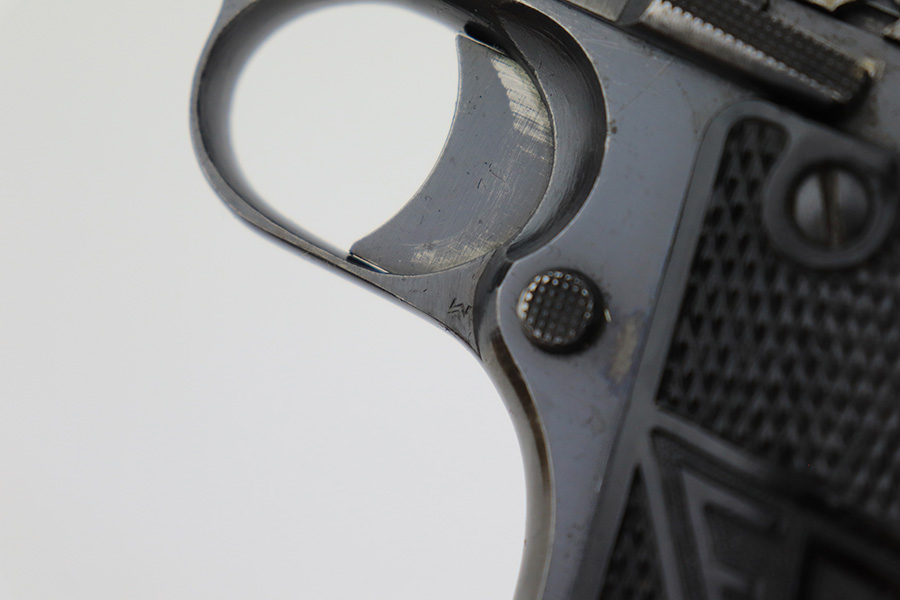 4/7/23 – This is a nice example of a Radom VIS 35 issued to the Nazi military during WW2. This one is of the earlier 3-lever variation. It is all matching and has the proper waffen proofs. It comes as a rig with a nice leather holster and waffen-proofed magazine. The holster has a waffen ink stamp on the inside, and the belt loop has been replaced. The gun itself has lost the majority of its finish with obvious wear and splotchy discoloration throughout. Nice period-correct black bakelite grips – some small dings along the bottom edge of the left panel. Very nice bore with great rifling.
