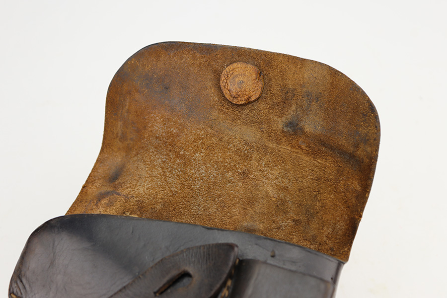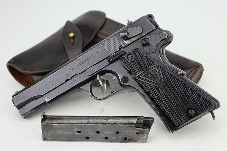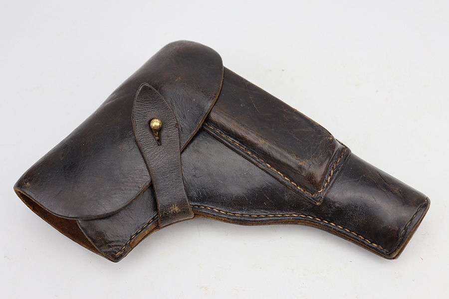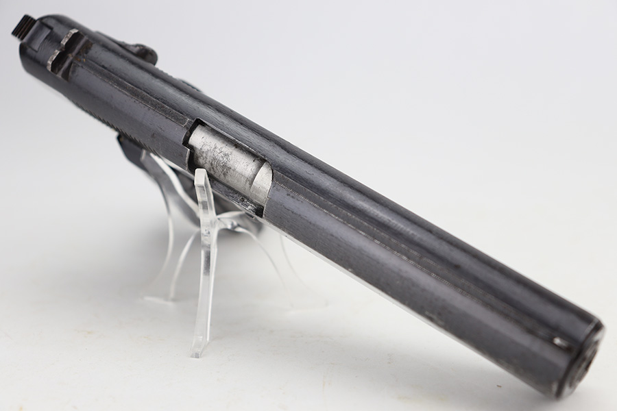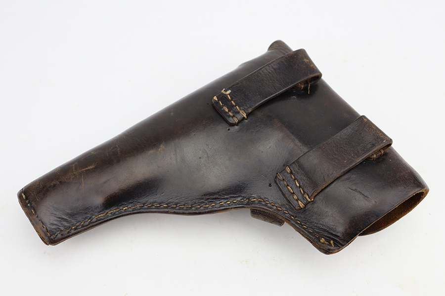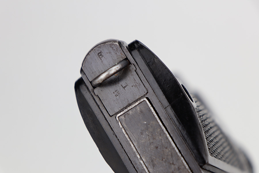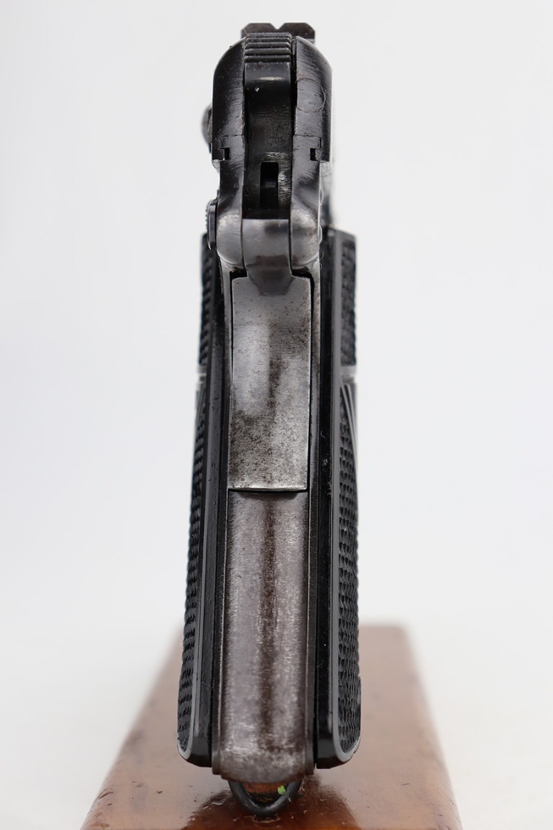 1/1/24 – This is an excellent example of a Radom VIS 35 issued to the German military during WW2. It is all matching with the proper “Waffen 77” and “Eagle 623” military acceptance proofs. This is an earlier variation with 3 levers. It has retained about 94-95% of its original finish. Very minor high edge wear and some minor thinning with minor spotty oxidation on the grip straps. Fitted with very nice period-correct black bakelite grips. Comes as a rig with an un-marked holster and a waffen proofed magazine. Excellent bore.