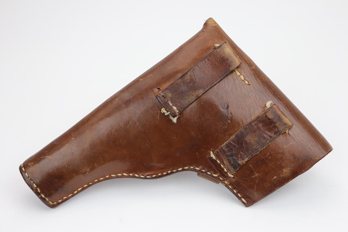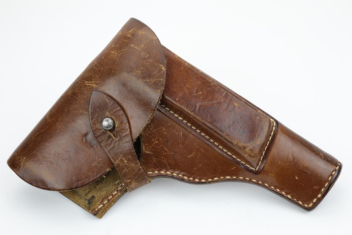 9/26/19 – This is a nice, honest example of a Radom VIS 35 pistol rig that was Nazi issued in the 1940s. The pistol is all matching and original with 90+% blue remaining. It has a very nice profile but some thinning of the straps, especially the front. It’s a mid to later war example with two-lever design. Nice grips with no major cracks or chips. Bore is shiny with strong rifling and only minor signs of use. Pistol has an original magazine inside, but the spare is postwar. Original holster is unmarked and in nice condition, but the inner wall was shaved for faster draw.