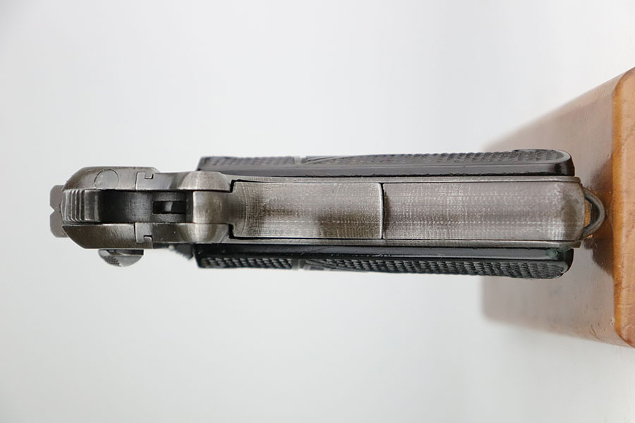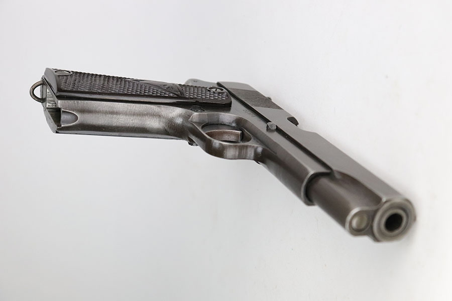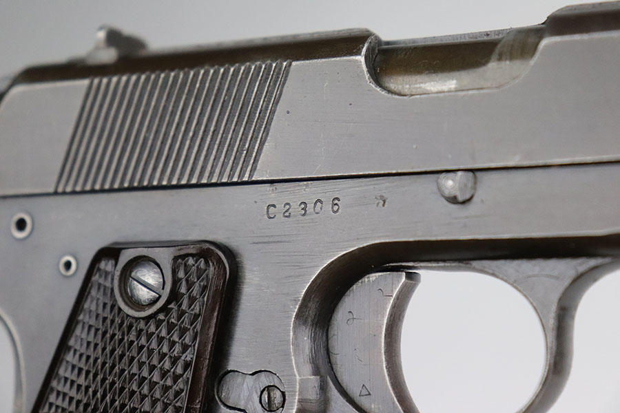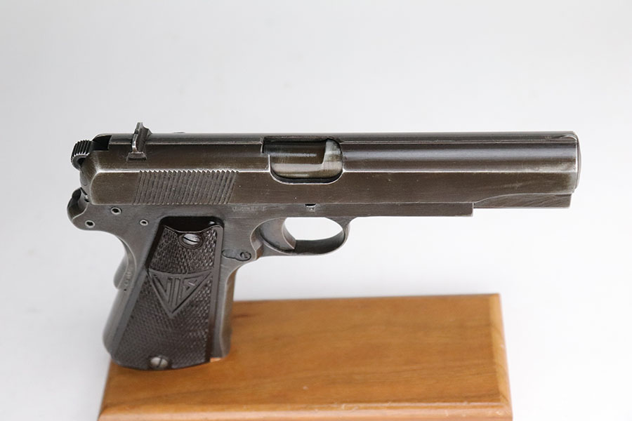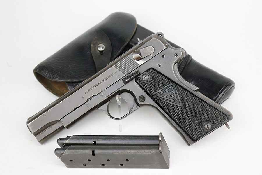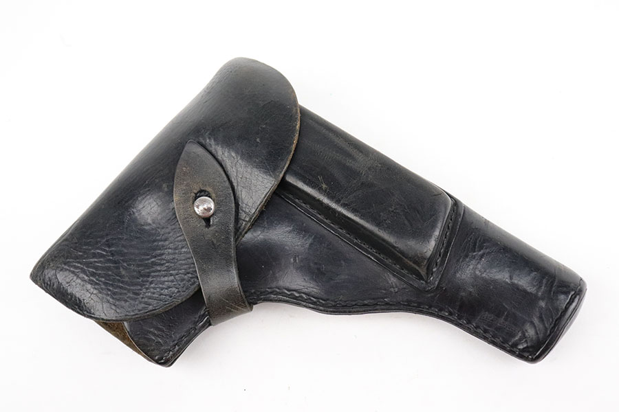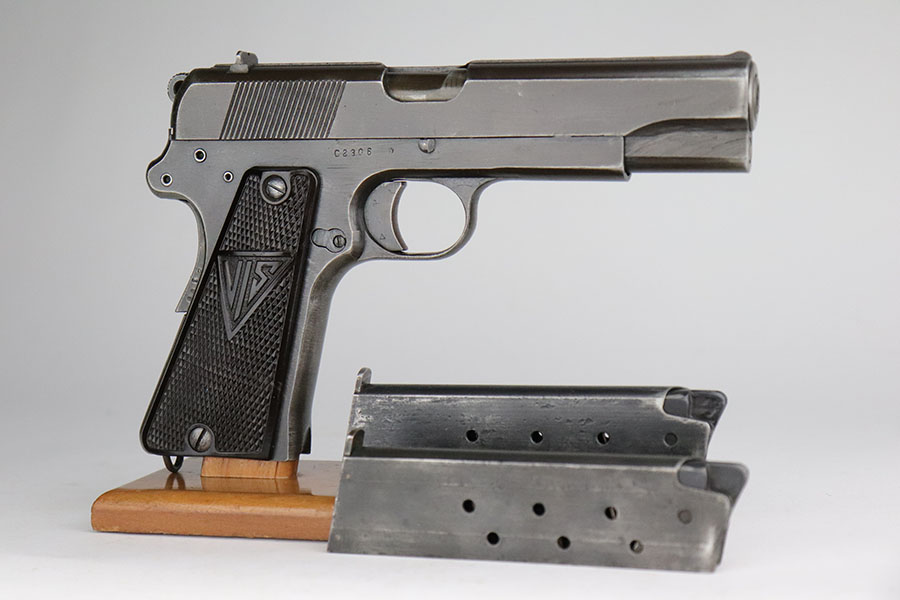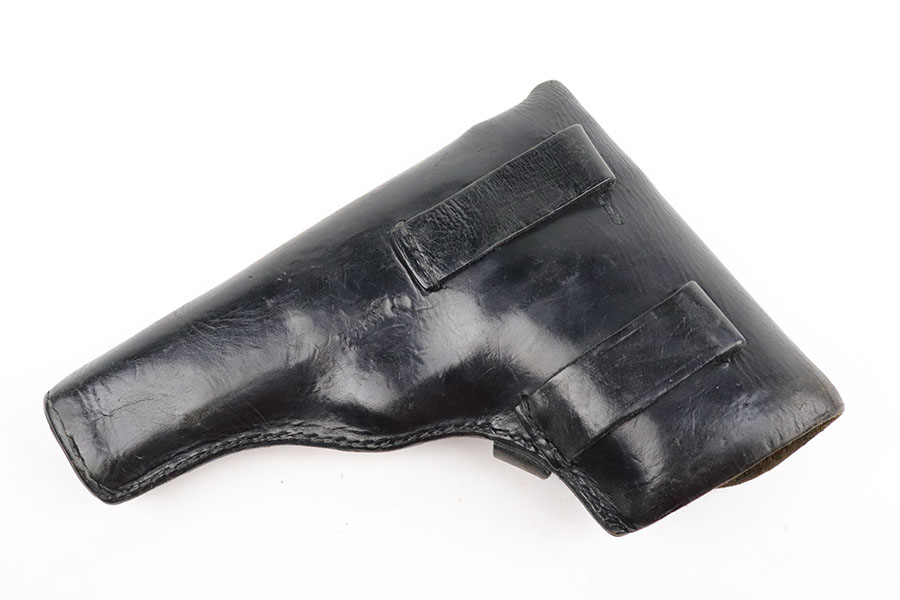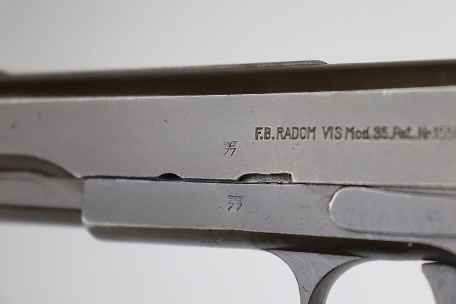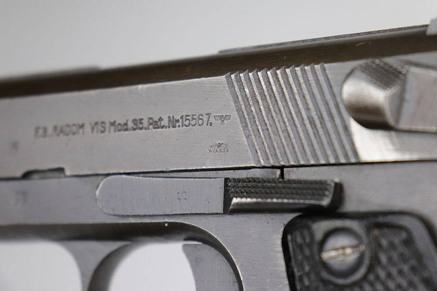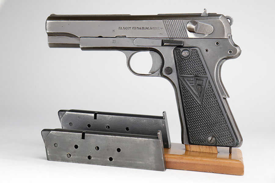 8/19/20 – This is an all original and complete Nazi Radom VIS Model 35 rig from World War II. The pistol is all matching with original blue that’s a little tough to rate, as there’s some finish loss on the front strap and rear edges of slide, but mostly just patina has set in throughout. Both magazines are original, correct and unmarked. Bore is strong with just some minor frost. The grips have no major defects, just some dings around the edges. Proper mechanics, including de-cocker. Rig is completed by an original holster with faint internal inkstamp.
