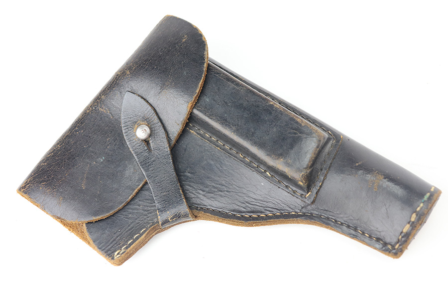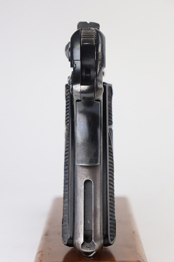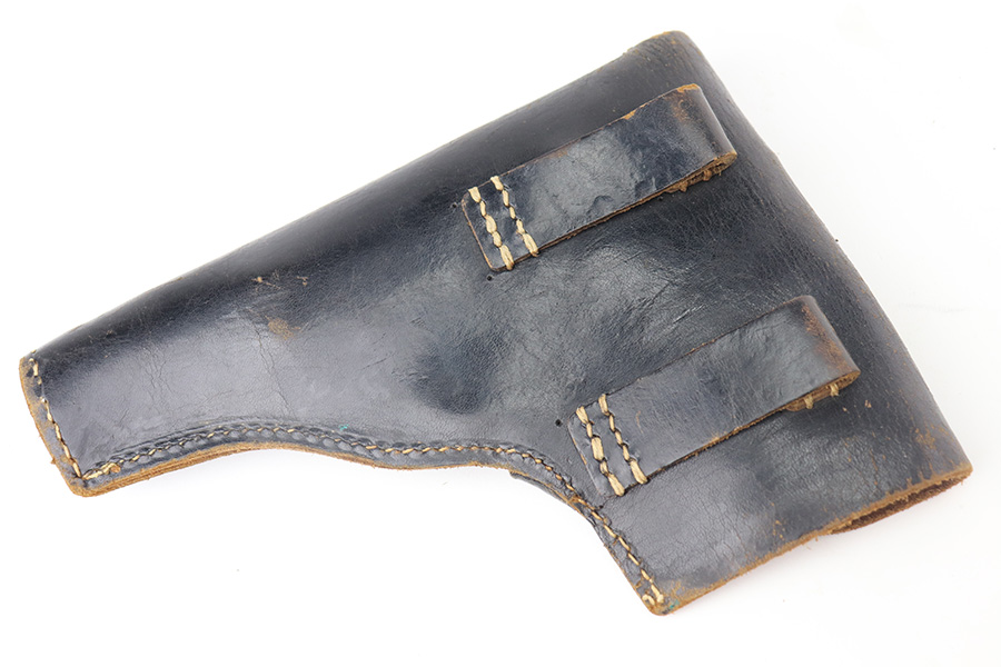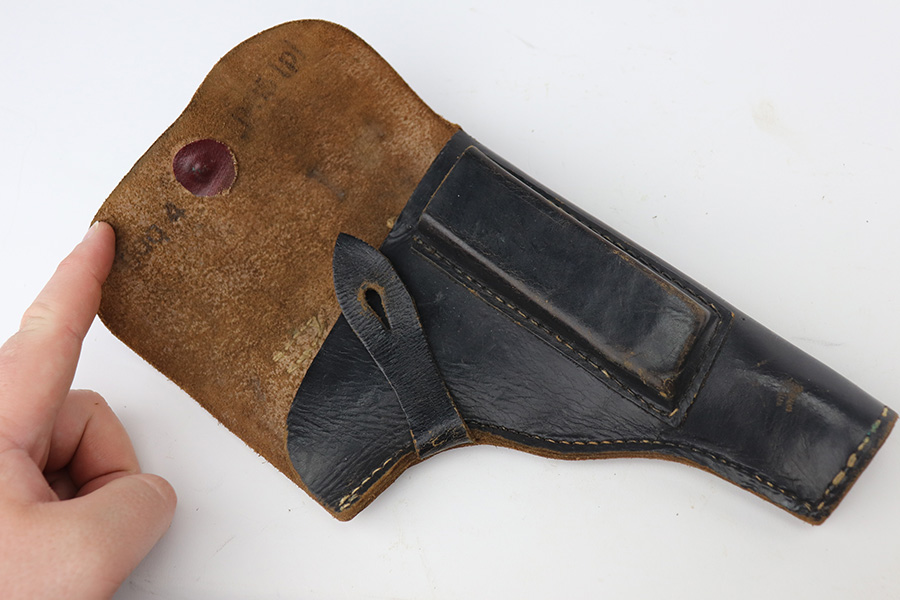 6/18/21 – This is a a very nice example of a Radom VIS 35 Rig issued to the Nazi military during WW2. This one is of the earlier variation with three levers and a slot in the frame. The rig comes with an ink-stamped period-correct holster and two waffen-proofed magazines. The gun is all matching and has the proper waffen military proofs. It has retained roughly 85% of its original high polish finish. There is thinning on the straps and minor wear on the high edges of the slide and around the muzzle. Some light scratches and handling marks along the side. Excellent black bakelite grips. The bore has god rifling with very minor pin-pricking in the grooves.