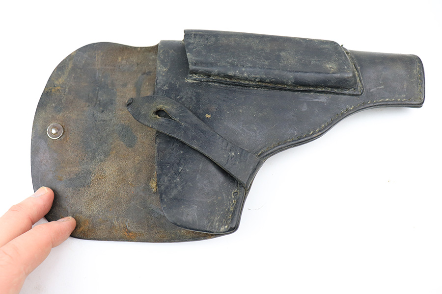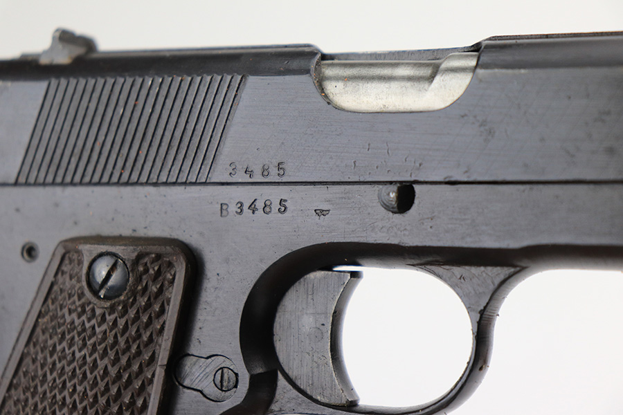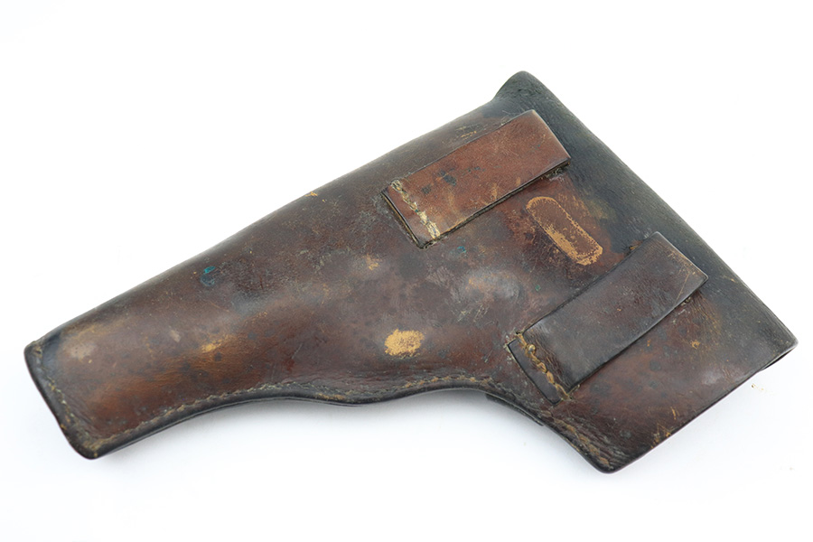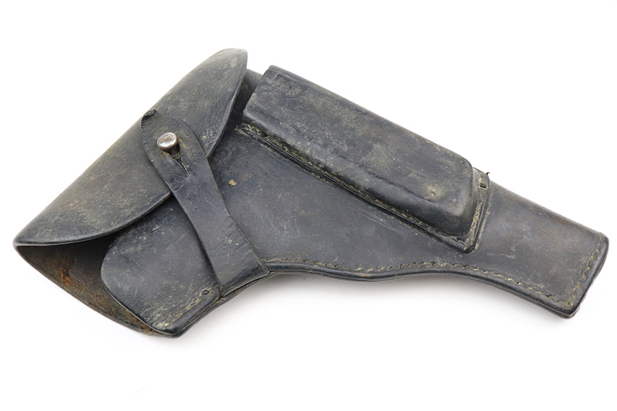 5/19/22 – This is an excellent example of a Radom VIS 35 issued to the Nazi military during WW2. It is all matching and has the proper waffen military proofs. There is a “Circle VK” marking on the left side of the trigger guard. From research, this could be an indication that this gun was diverted to the Yugoslavian military. We can’t say for sure. It also has what looks like a black “dipped” finish and an added serial number on the left side of the slide. It comes as a rig with an un-marked holster and an un-marked magazine. There isn’t much actual finish loss, just minor muzzle wear and an area of wear on the back strap. A small spot of oxidation on the right side of the slide. Comes with nice brown plastic grips. The rifling in the bore is slightly worn with pin-pricking throughout.