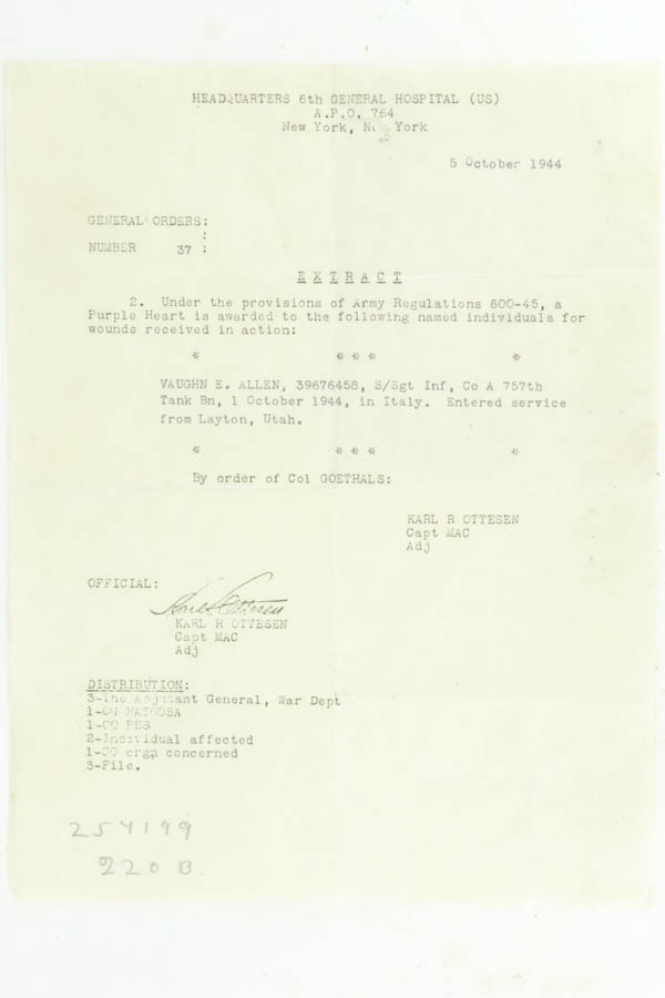 9/6/24 – This is a very nice example of a Radom VIS 35 issued to the Nazi military during WW2. This one is of the earlier 3-lever variation. It is all matching and has the proper waffen proofs. It has retained about 93% of its original finish with some muzzle and high edge wear. There is a number electro-penciled onto the front strap. Nice bore with only minor frosting throughout. Comes with one waffen-proofed magazine. The pistol comes with extras from Vaughn E. Allen, a WW2 Veteran who received a Purple Heart and a Silver Star. None of the extras actually tie this man to this gun, but they came to us together so we didn’t want to separate them. It includes his Purple Heart, Silver Star, Good Conduct Medal, along with other ribbons. There is a photo of Vaughn receiving his medals, along with a couple of local newspaper clippings. It includes the original paper copies of the declaration of his Silver Star and Purple Heart. There is also a 16-page memoir written by Vaughn that details his service in Italy and his wounds that resulted in a Purple Heart (see the photos to read the story).
