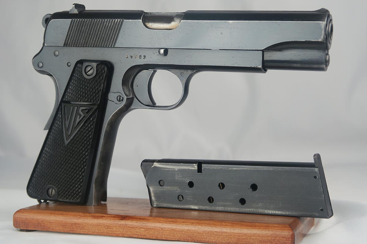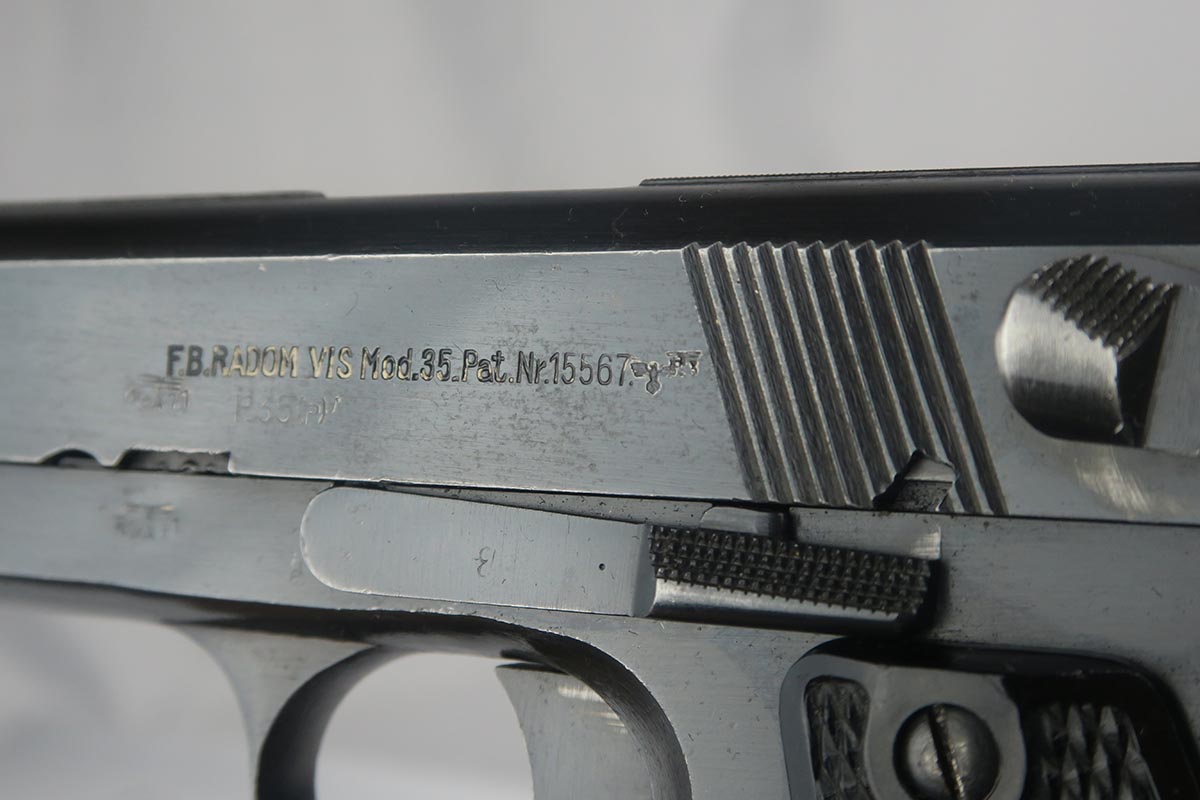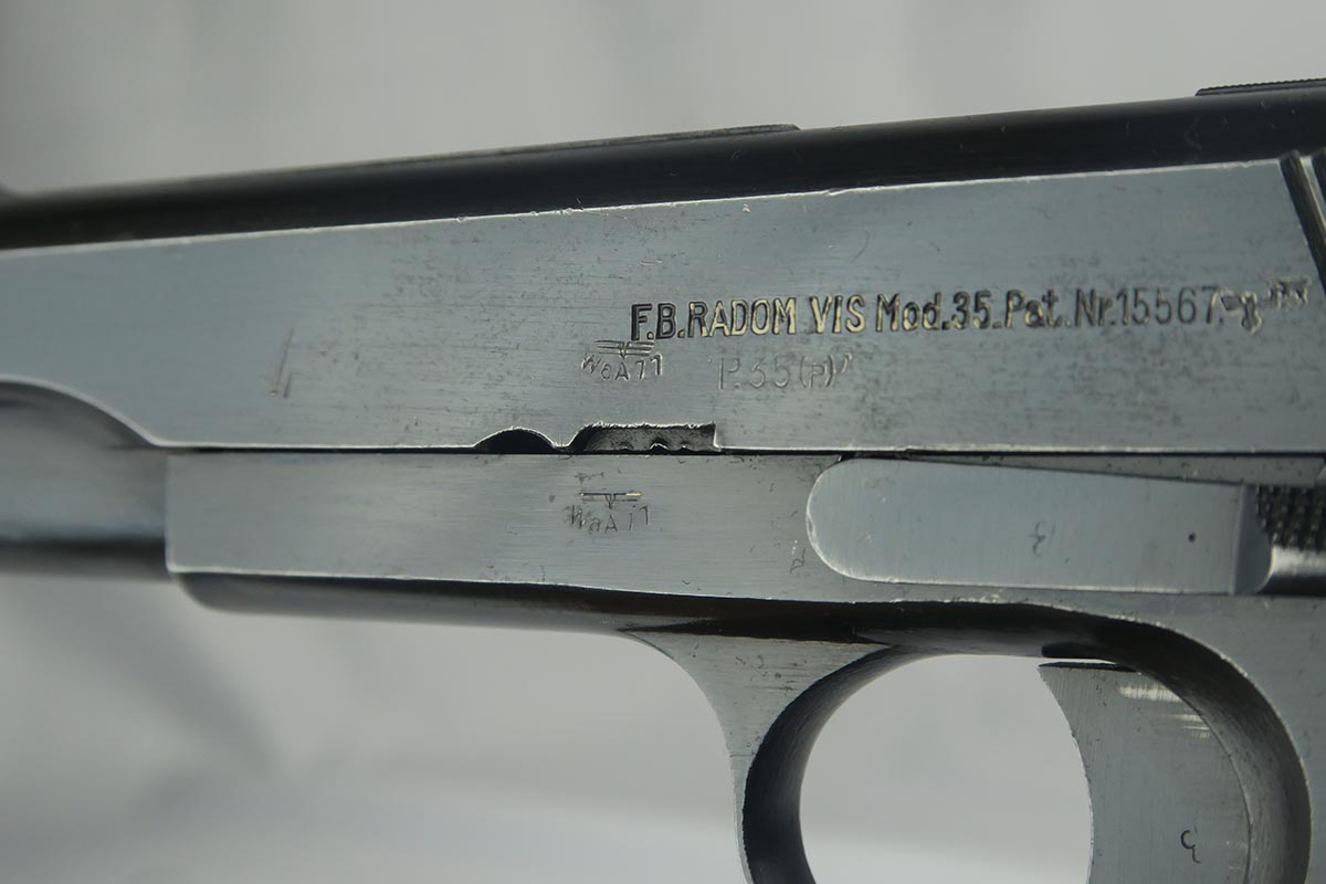9/5/17 – This is a nice three-lever variation Radom vis mod 35 that was issued to the Nazi Army in the 1940’s.  The original high-polish blue rates at about 92-93% with a nice slide and most of the finish loss found on either strap.  Very nice set of black grips with no major flaws.  Waffen E/189 proofed magazine.  Excellent bore.