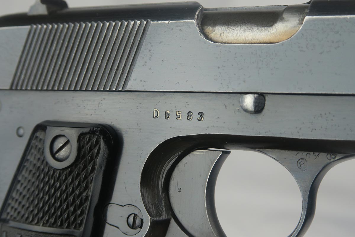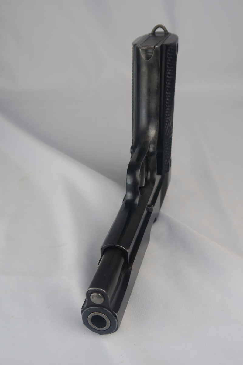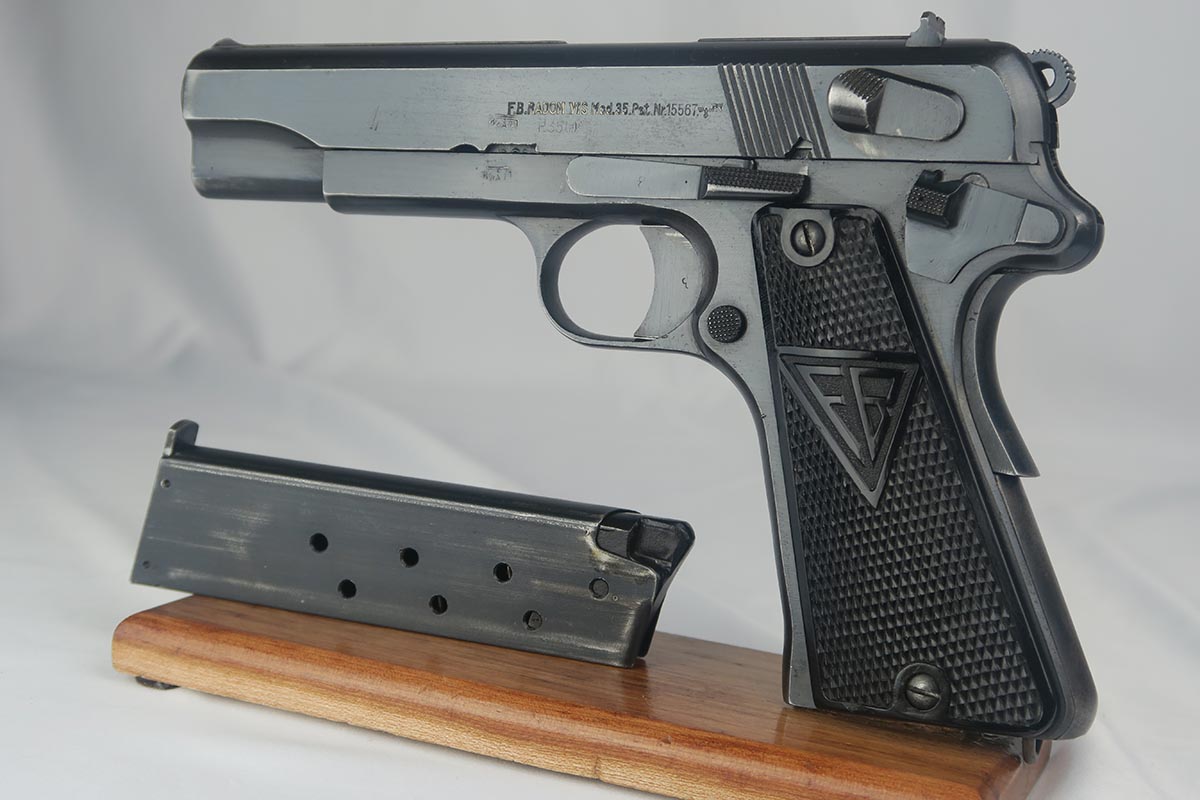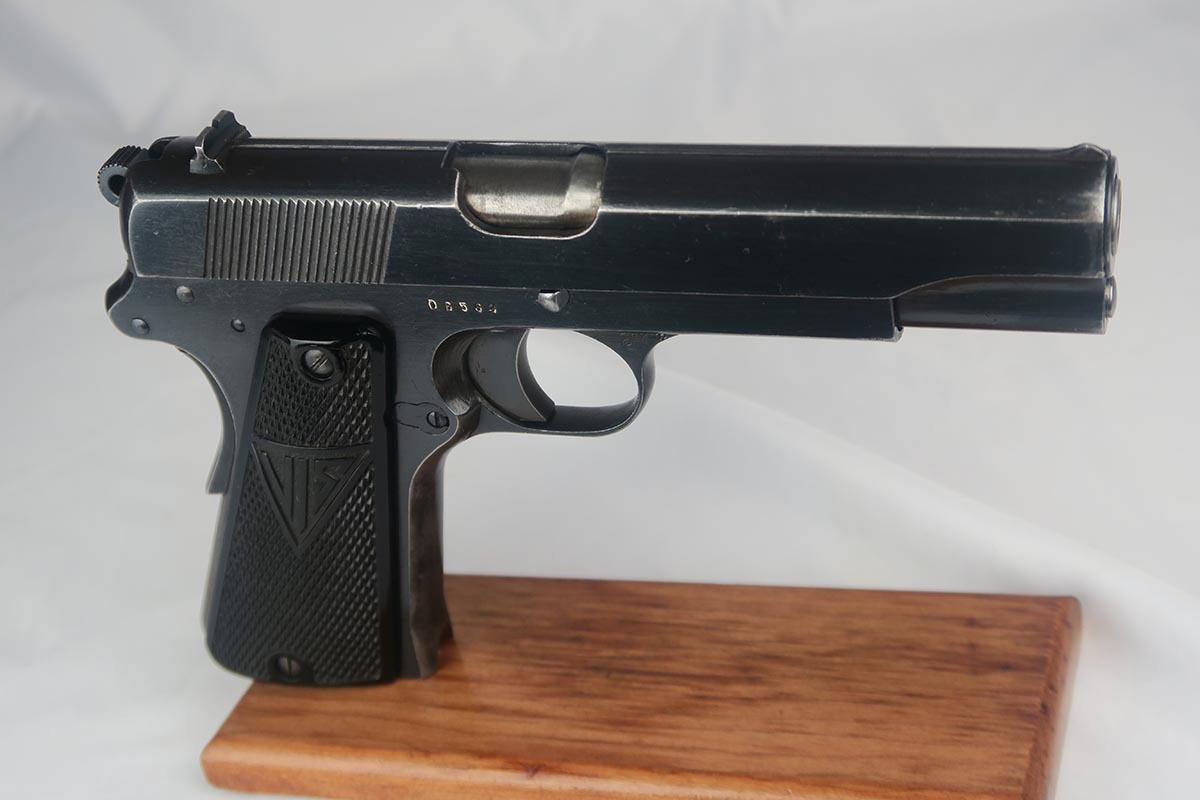 9/5/17 – This is a nice three-lever variation Radom vis mod 35 that was issued to the Nazi Army in the 1940’s.  The original high-polish blue rates at about 92-93% with a nice slide and most of the finish loss found on either strap.  Very nice set of black grips with no major flaws.  Waffen E/189 proofed magazine.  Excellent bore.