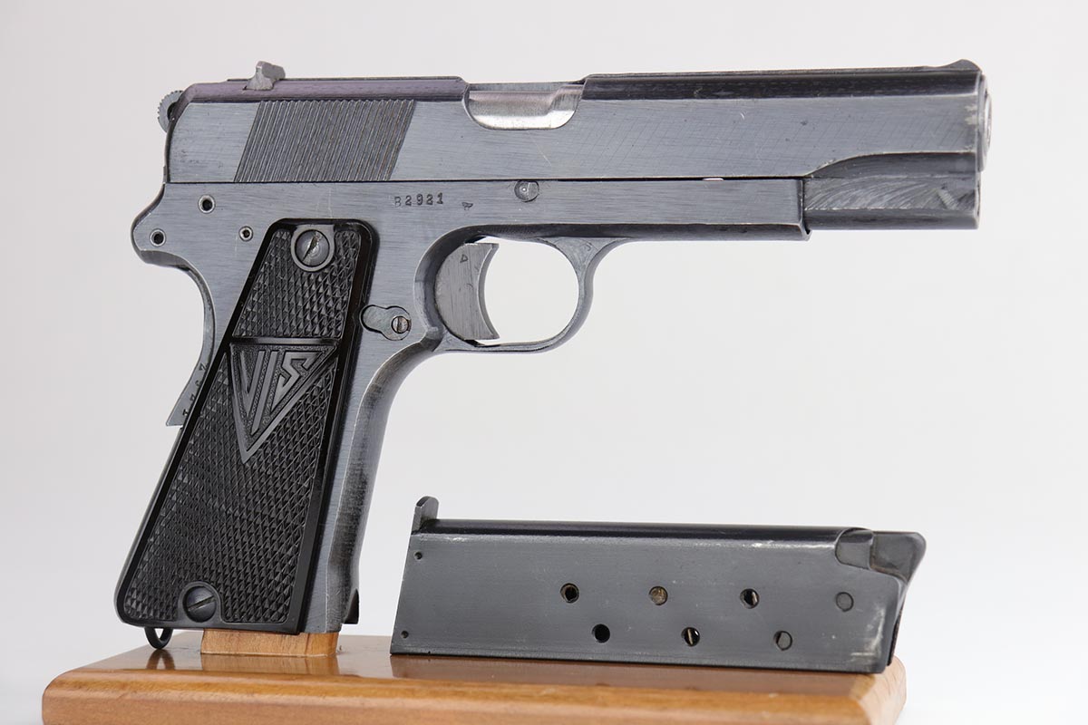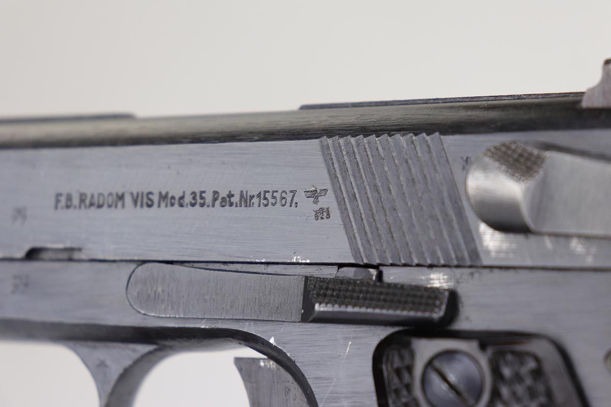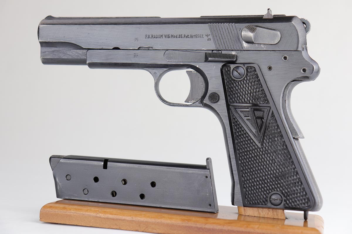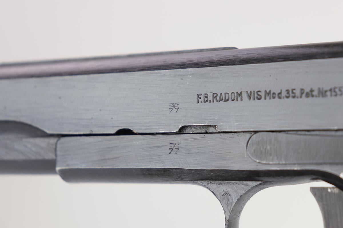 3/5/20 – This is a Radom VIS Model 35 with two-lever design that has a near-mint profile view, but most of the finish loss is found on the back strap/grip safety. It’s all matching and original, with minor muzzle wear and a small area of finish loss along the top of the slide. Proper mechanics, including de-cocker. Mint bore and excellent grips. Magazine has waffenamt on base.