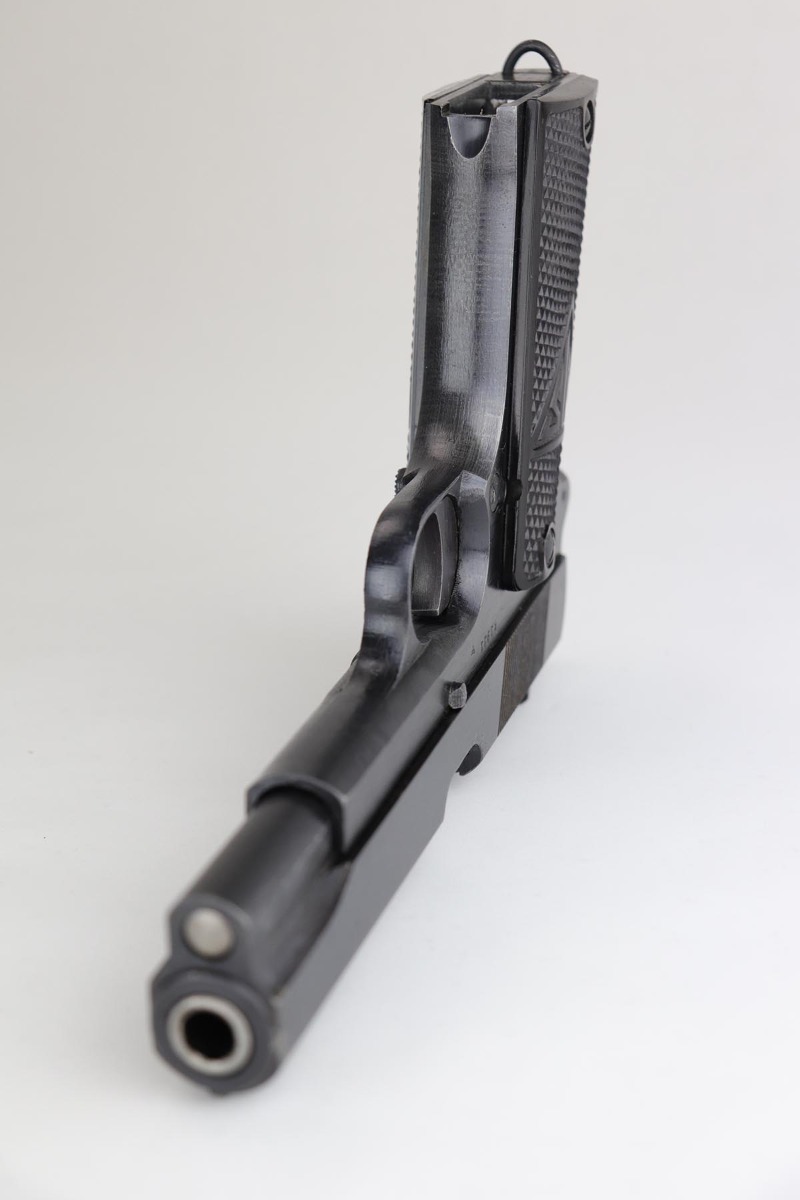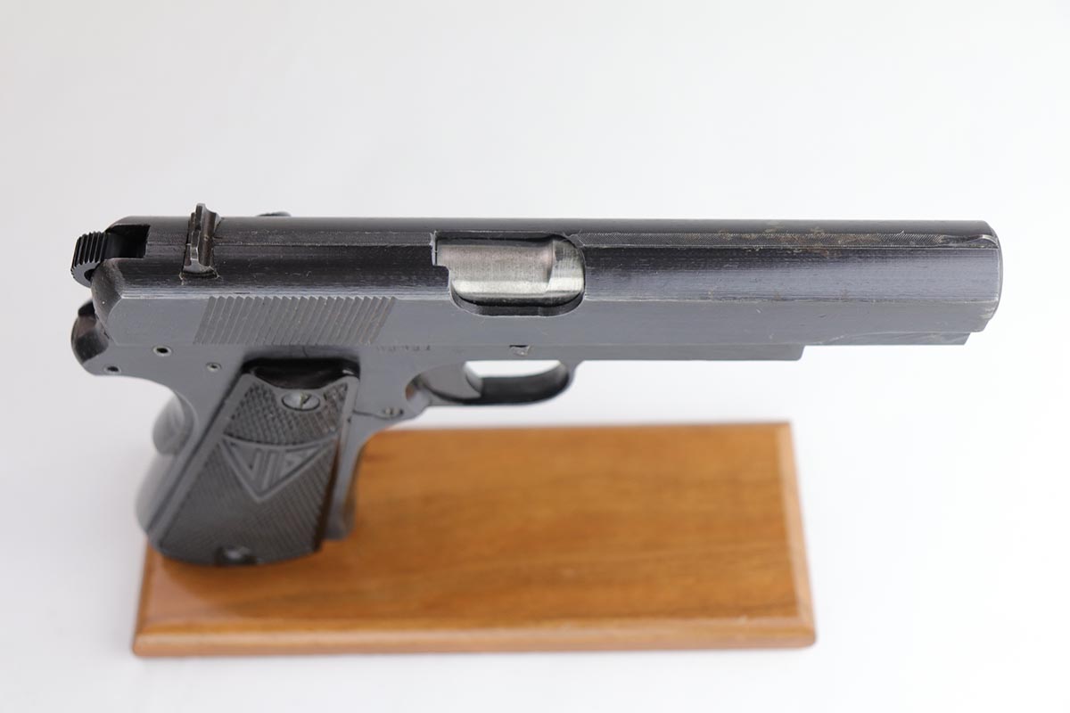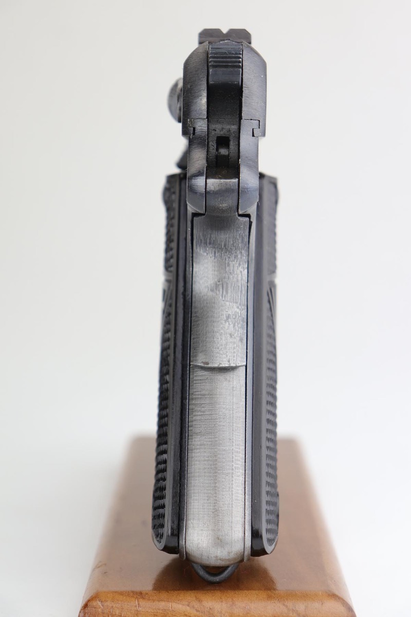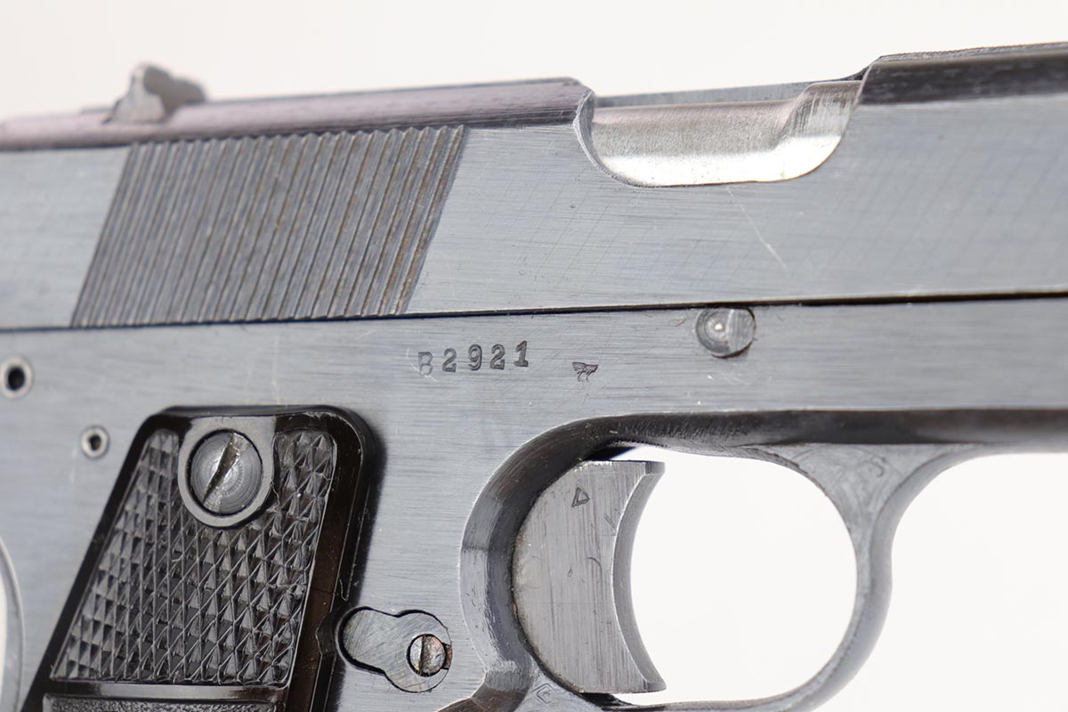 3/5/20 – This is a Radom VIS Model 35 with two-lever design that has a near-mint profile view, but most of the finish loss is found on the back strap/grip safety. It’s all matching and original, with minor muzzle wear and a small area of finish loss along the top of the slide. Proper mechanics, including de-cocker. Mint bore and excellent grips. Magazine has waffenamt on base.