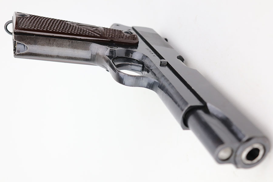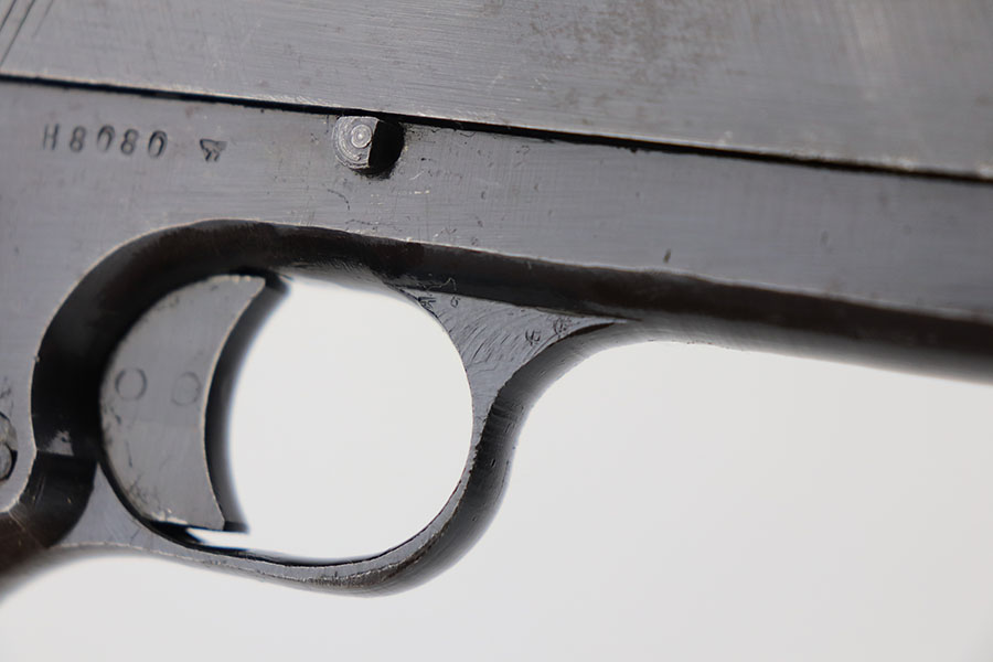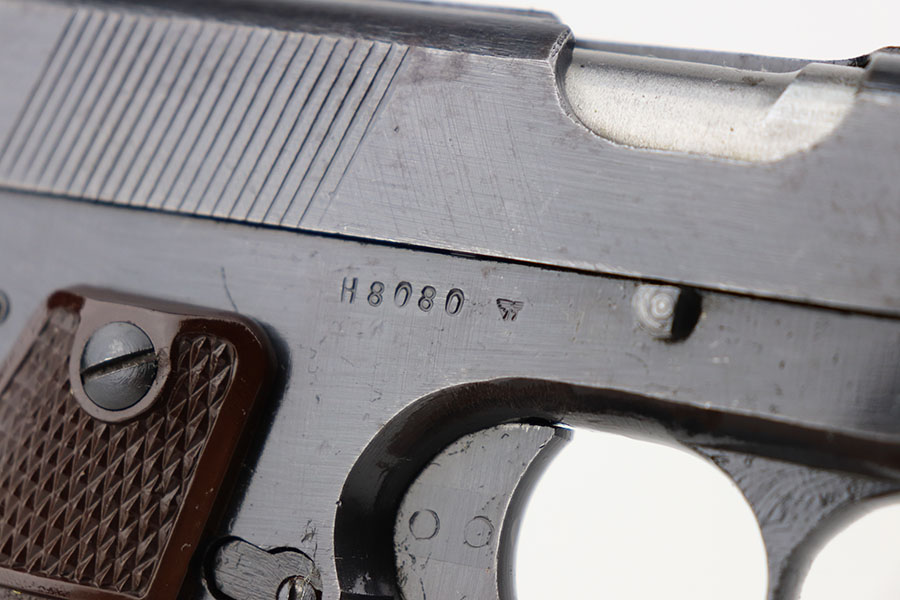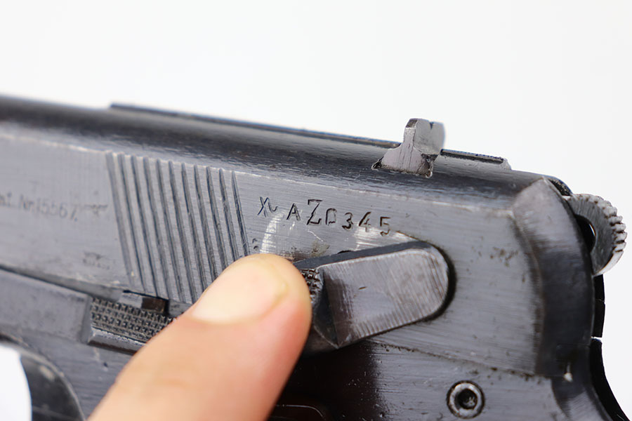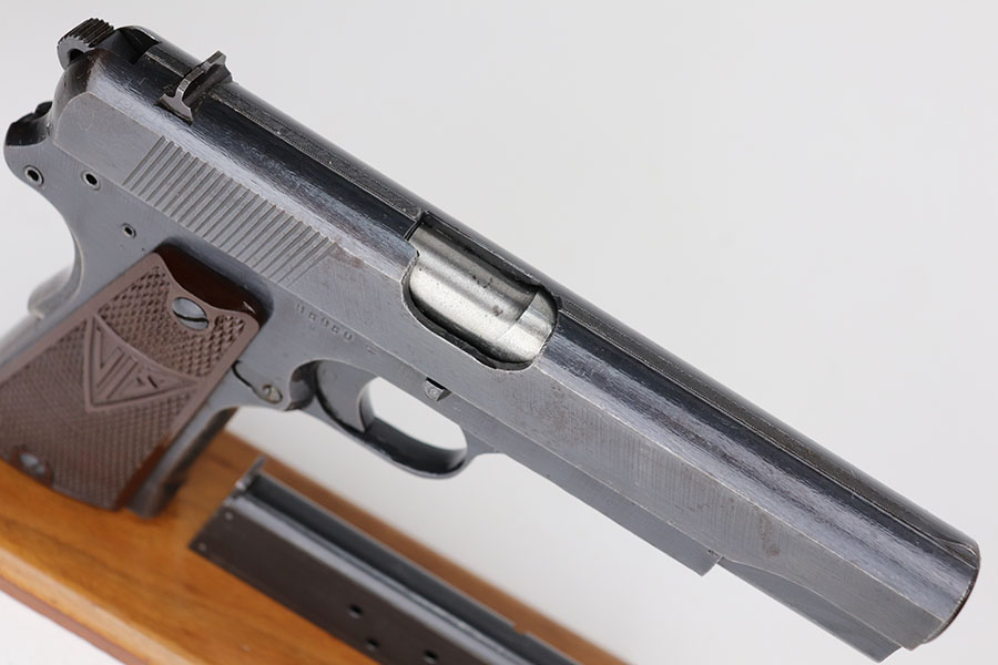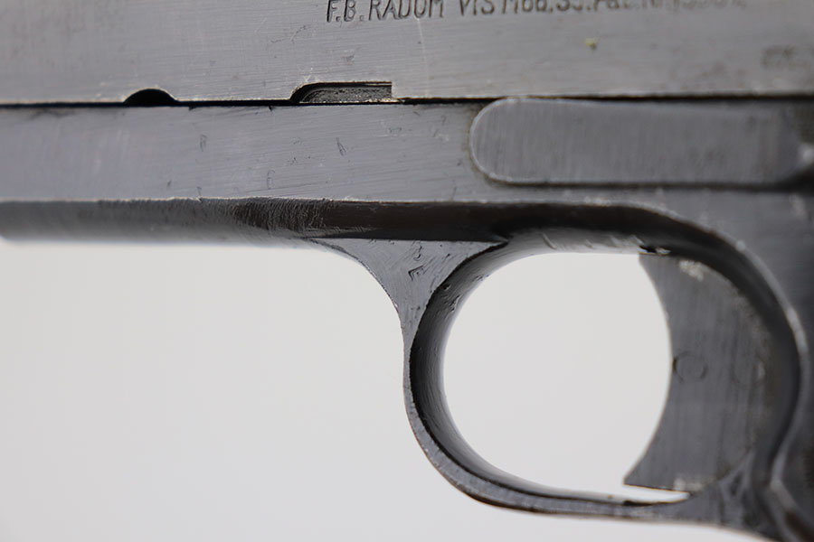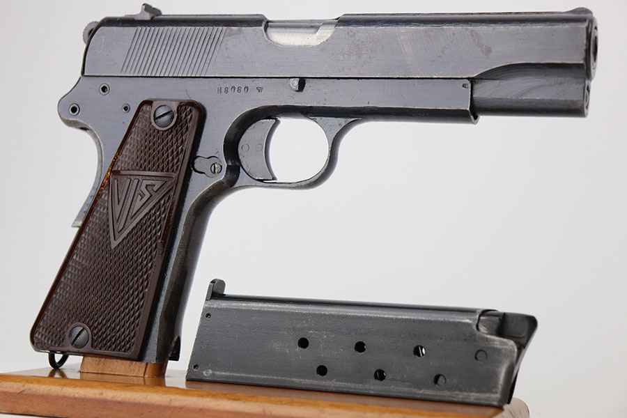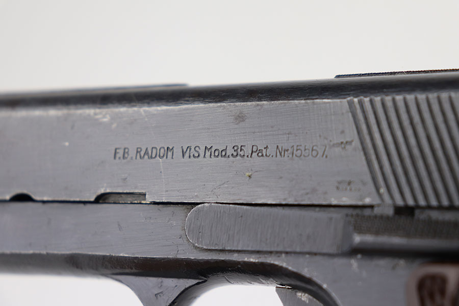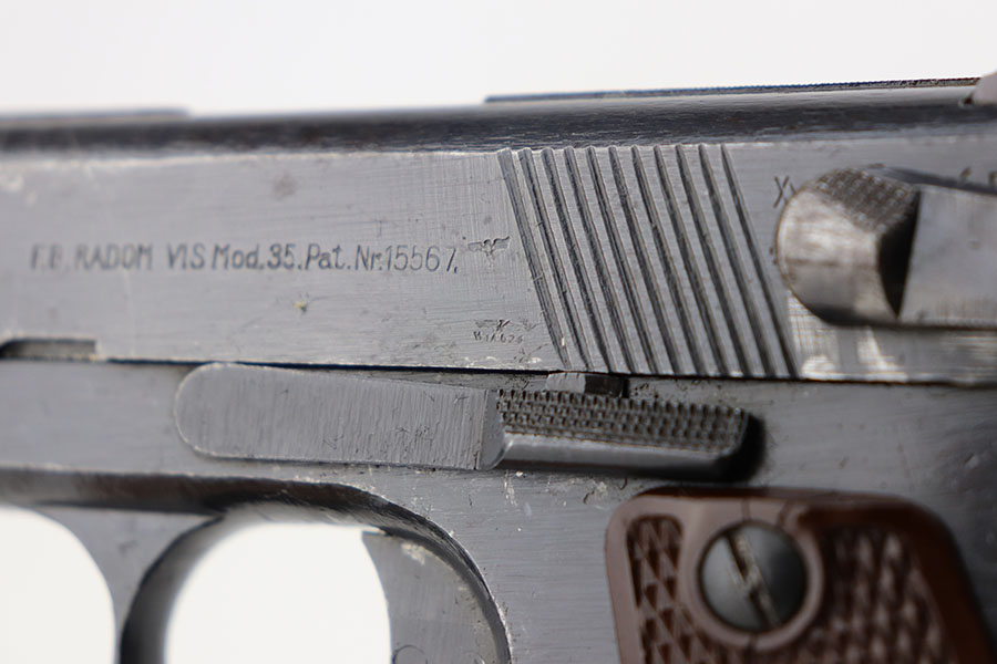 4/7/21 – This is an excellent example of a Radom VIS Model 35 issued to the Nazi military during WW2. It is all matching and has the proper Nazi military proofs. It has retained about 94% of its original bluing. There is minor thinning on the straps and minor wear on the high edges of the slide. Spotty oxidation here and there. Comes with excellent reddish grips and a proper magazine. Mint bore.