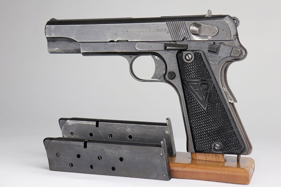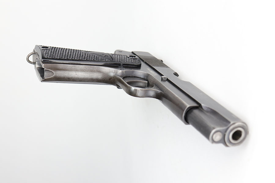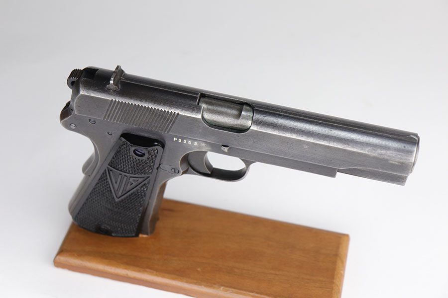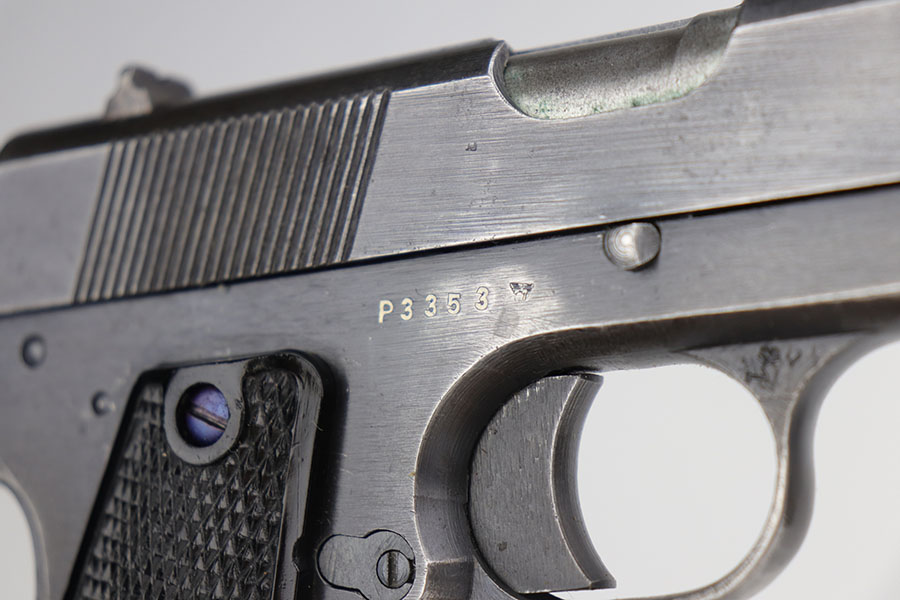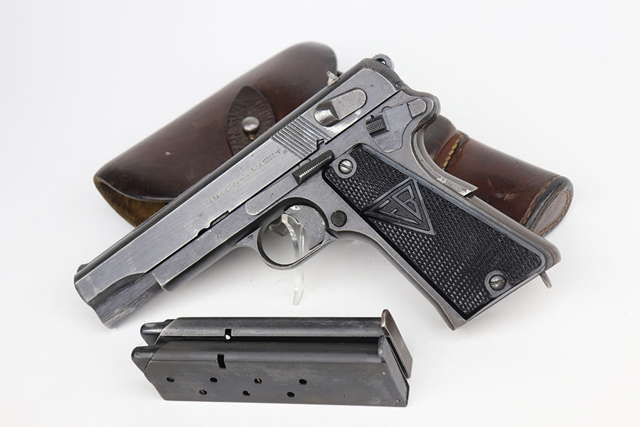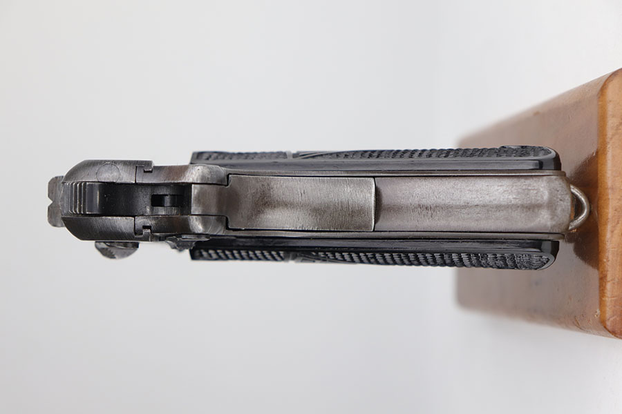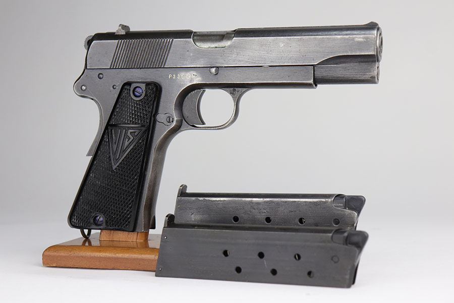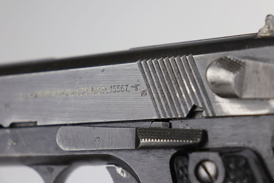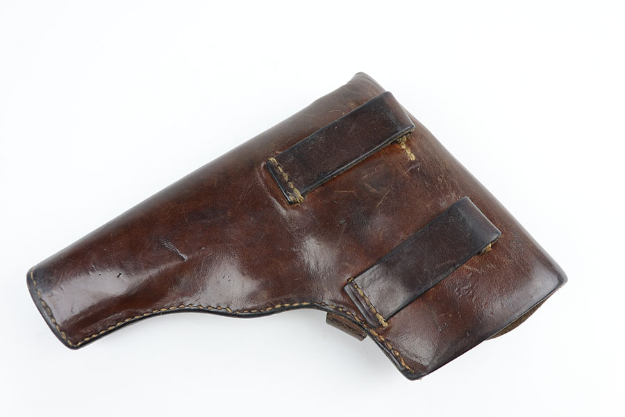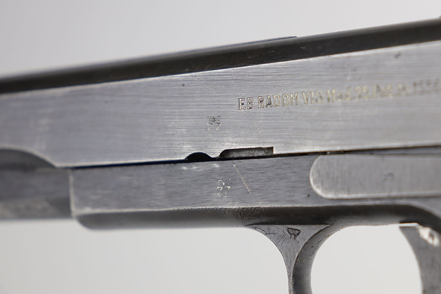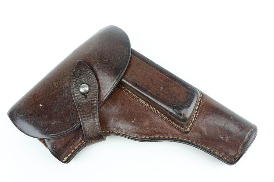 9/8/20 – This is a complete Nazi Radom VIS Model 35 rig with holster and spare magazine. It’s a three lever variation with some dulling to the finish throughout, and somewhat worn straps. Bore shows some use but clean with strong rifling overall. Excellent, original black plastic grips. Both magazines are unmarked, though the spare has a (mismatched) serial etched in the spine. Complete with excellent holster that has faint internal inkstamp.