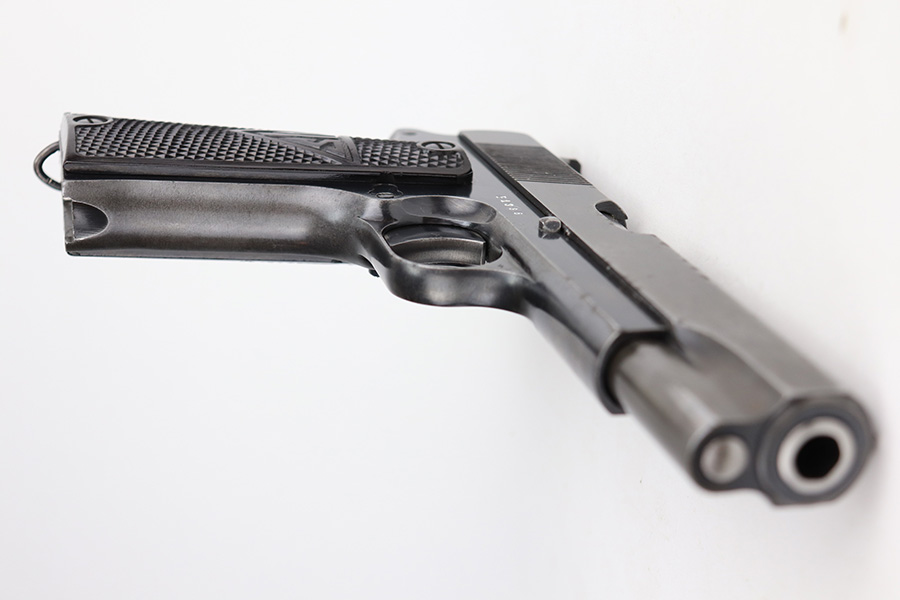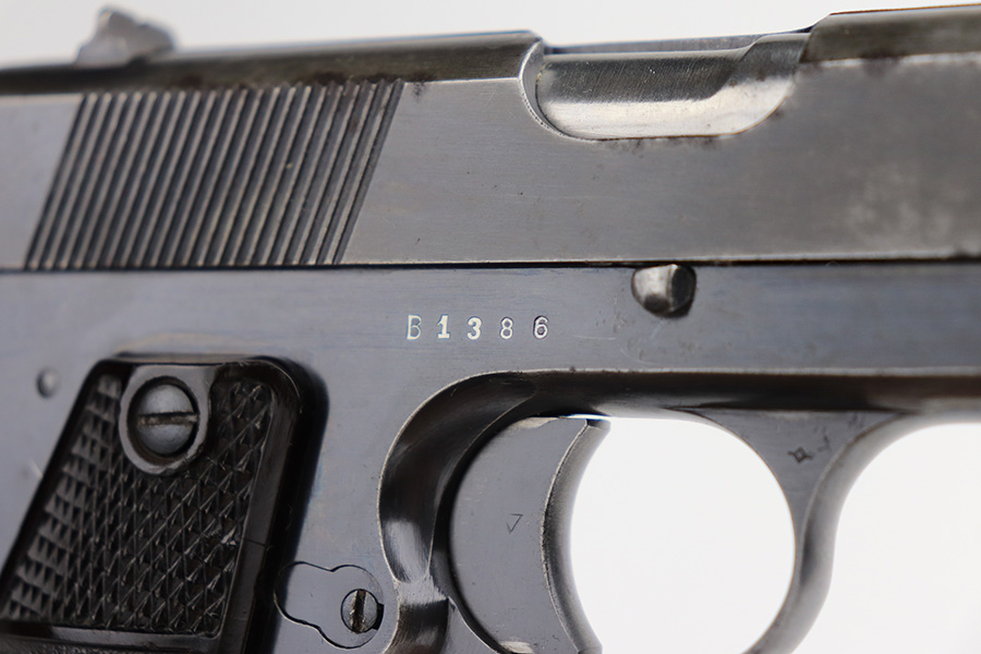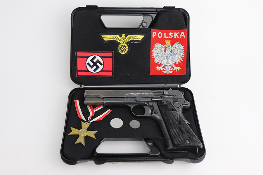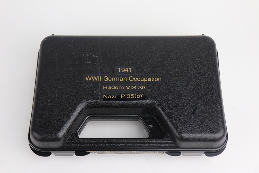 5/5/21 – This is a nice example of a Radom VIS 35 issued to the Nazi military in early 1941. It’s an early b-block example with slotted frame. Our consignor put together a very cool assembly to accompany the gun that includes a labeled hard case, repro Polish and Nazi patches, a 1939-dated 2nd Class Nazi Merit Badge, and a couple of coins from the Third Reich. The gun is all matching and has the proper “Waffen 77” military proofs. The gun has retained roughly 65% of its original finish. There are areas of thinning and spotty wear throughout. Spotty oxidation on the right side of the gun. Comes with period-correct grips – chipped at the bottom of the left side. Also comes with a period-correct waffen-proofed magazine. The bore has decent rifling with pin-pricking throughout.