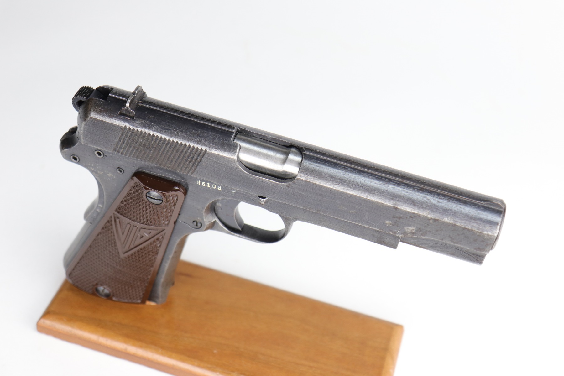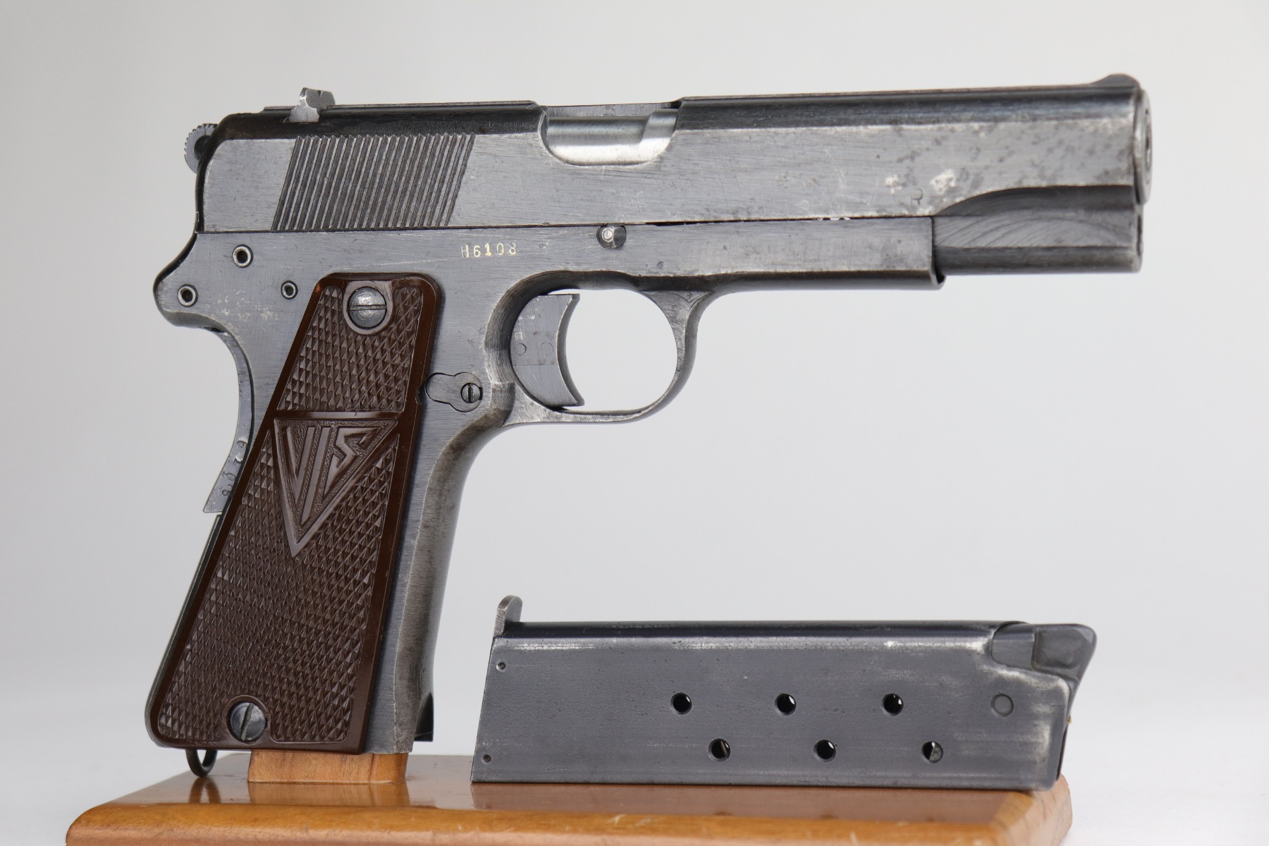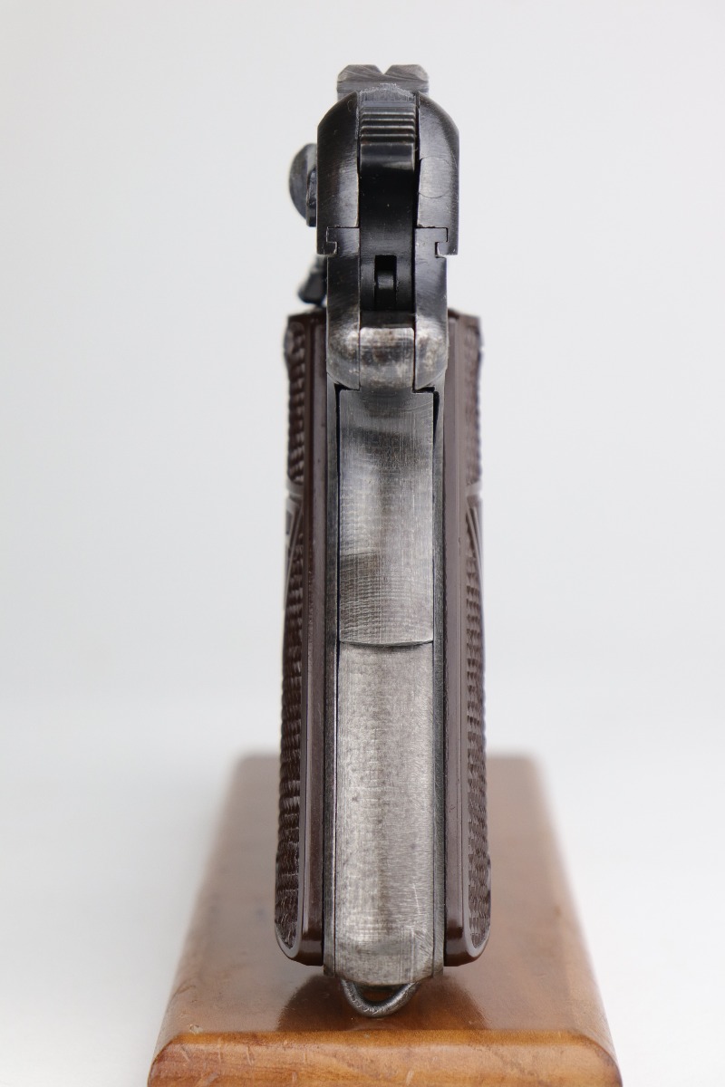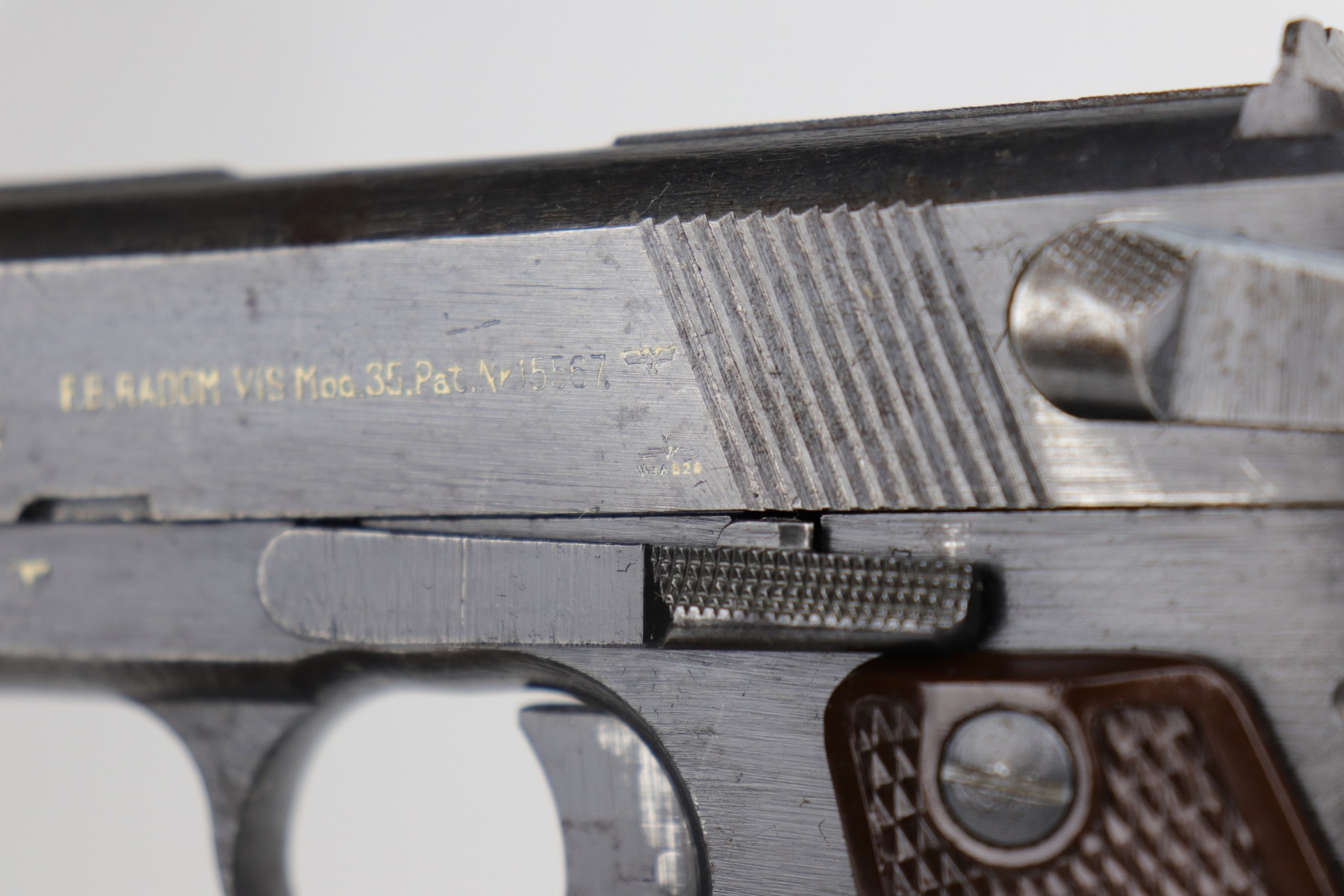 10/30/20 – This is a very nice example of a wartime, 2-lever, Radom VIS P35 issued to the Nazi military in about 1944. This particular gun is all matching and has the proper Nazi military acceptance proofs. It has the proper later-war features such as the reddish grips, 2-lever design, un-slotted frame, and fixed rear sight. This later military bluing is a little difficult to rate, but our best guess is roughly 85%. Most of the wear is minor thinning on the straps. There is also minor wear on the high edges of the slide. There is spotty oxidation throughout. Tiny dots of discoloration here and there, most noticeable on the right side of the gun. Comes with excellent reddish period-correct grips and a proper waffenamt magazine. The bore has decent rifling, but there is pin-pricking throughout.