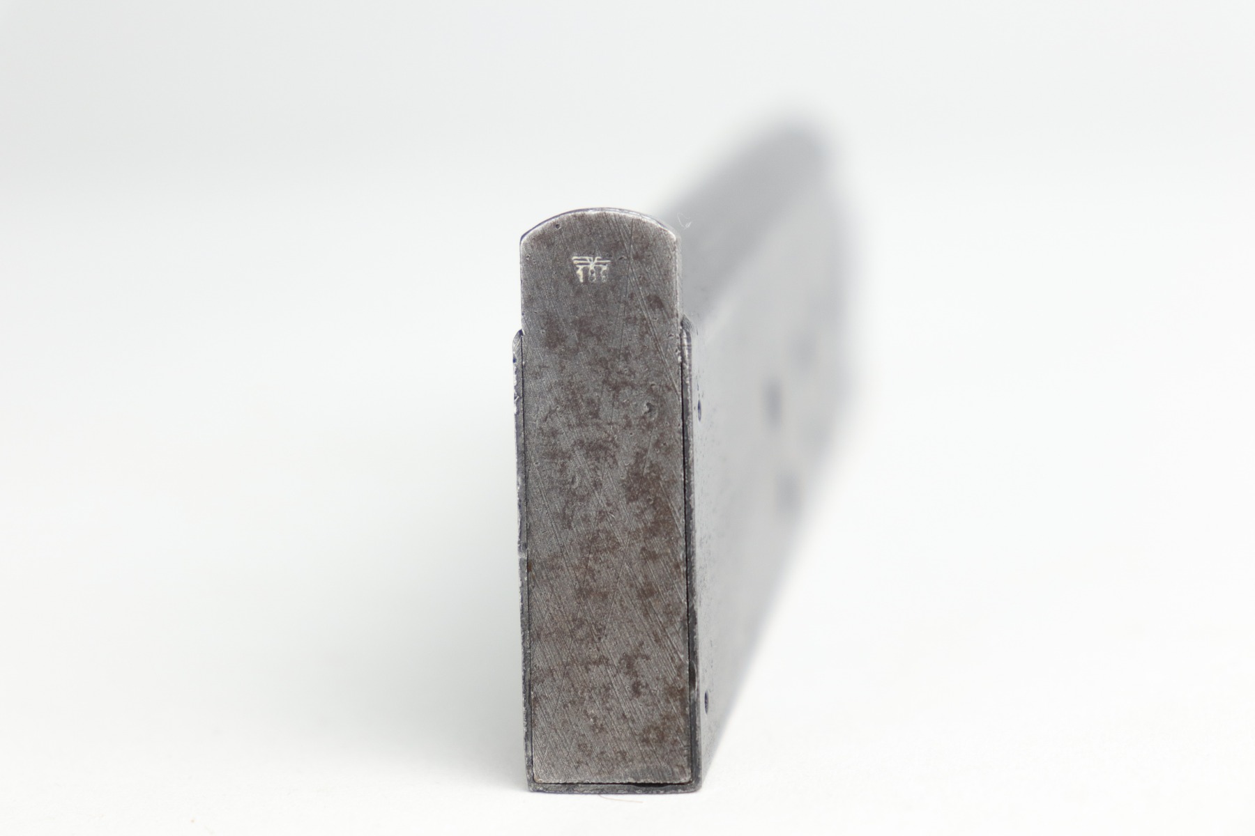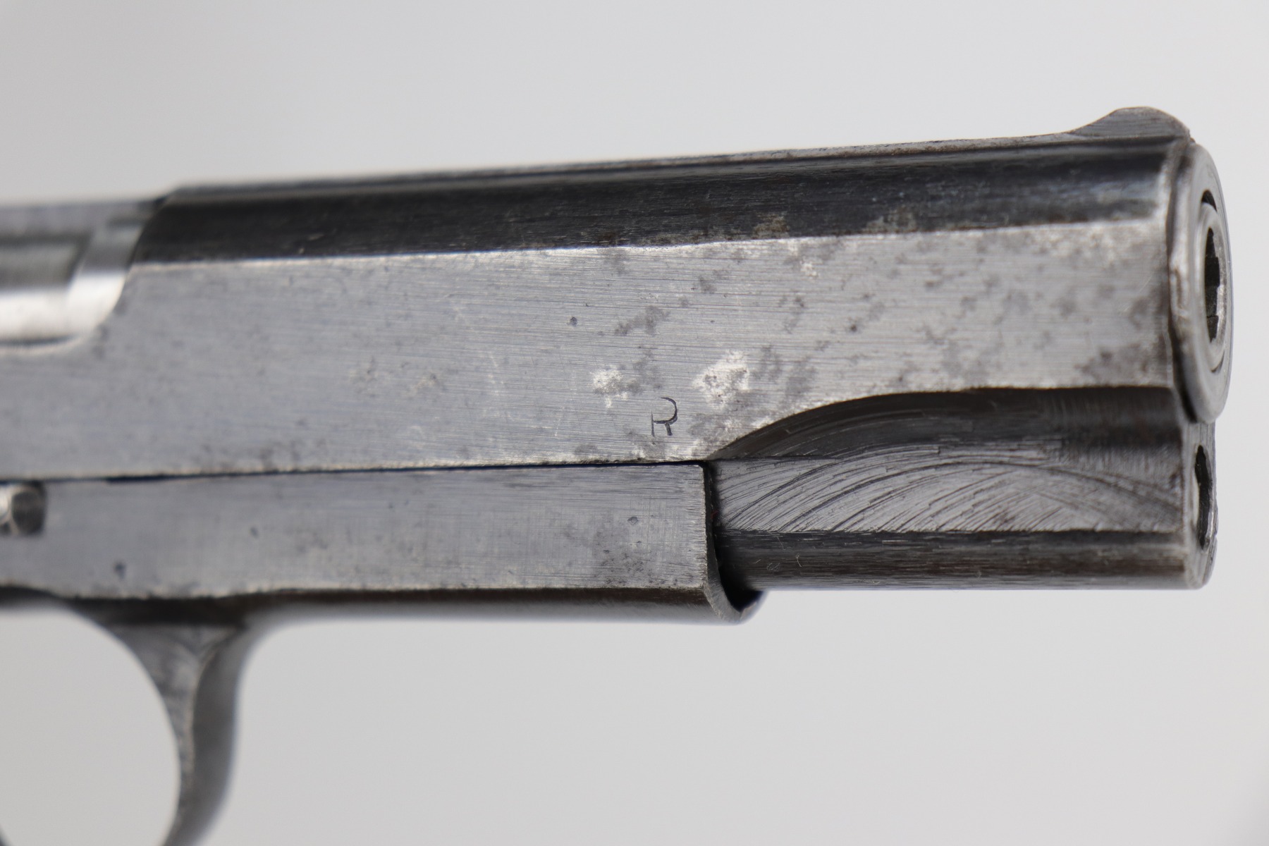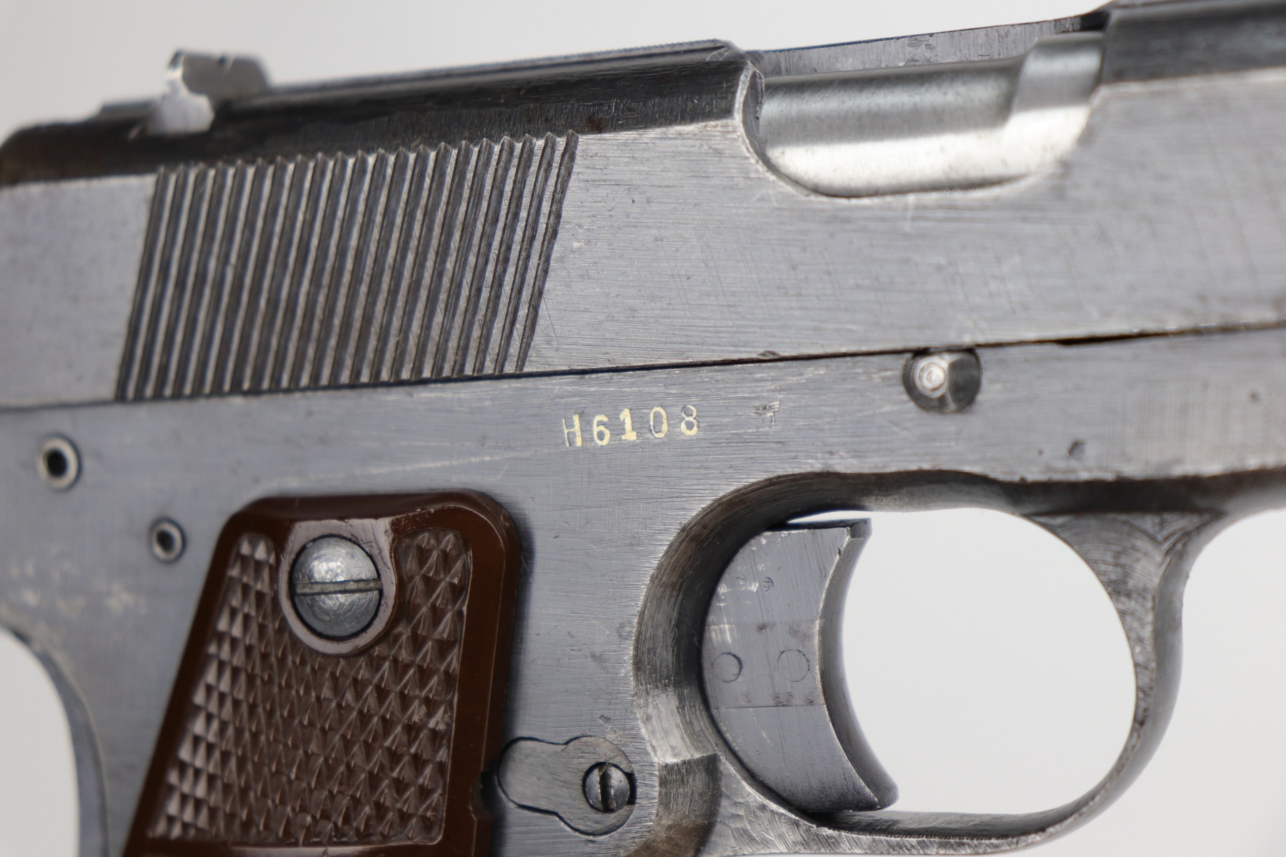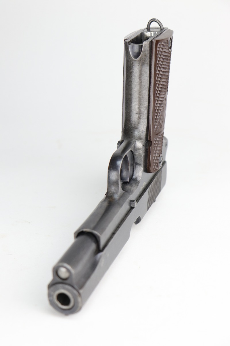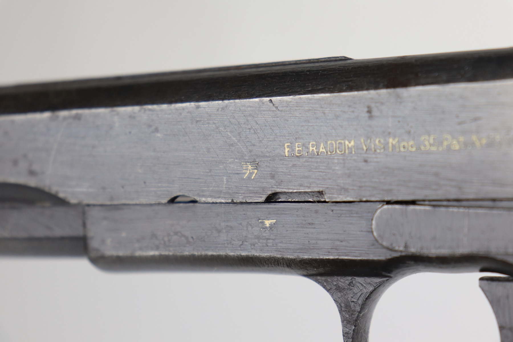 10/30/20 – This is a very nice example of a wartime, 2-lever, Radom VIS P35 issued to the Nazi military in about 1944. This particular gun is all matching and has the proper Nazi military acceptance proofs. It has the proper later-war features such as the reddish grips, 2-lever design, un-slotted frame, and fixed rear sight. This later military bluing is a little difficult to rate, but our best guess is roughly 85%. Most of the wear is minor thinning on the straps. There is also minor wear on the high edges of the slide. There is spotty oxidation throughout. Tiny dots of discoloration here and there, most noticeable on the right side of the gun. Comes with excellent reddish period-correct grips and a proper waffenamt magazine. The bore has decent rifling, but there is pin-pricking throughout.
