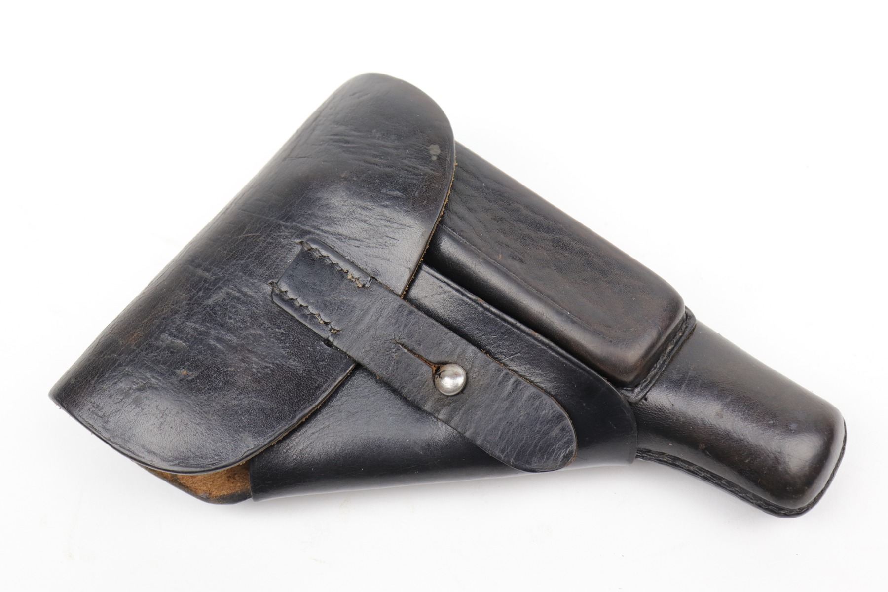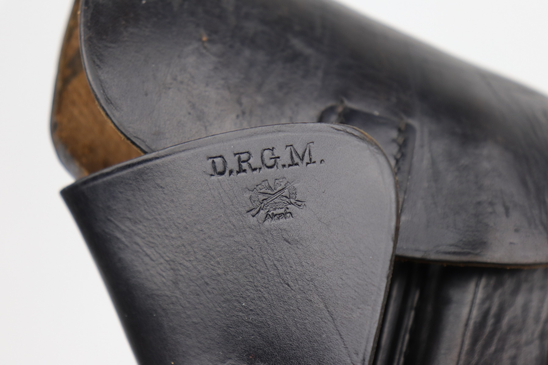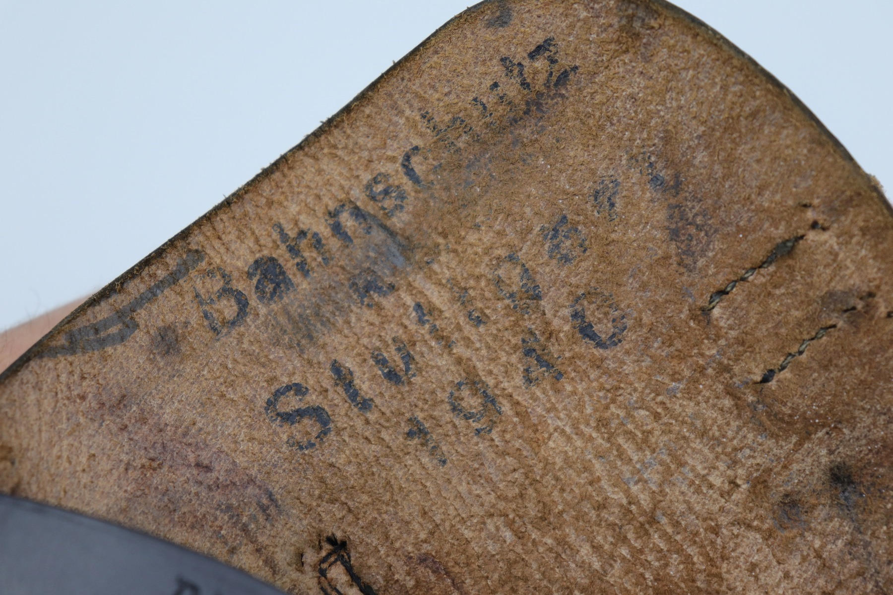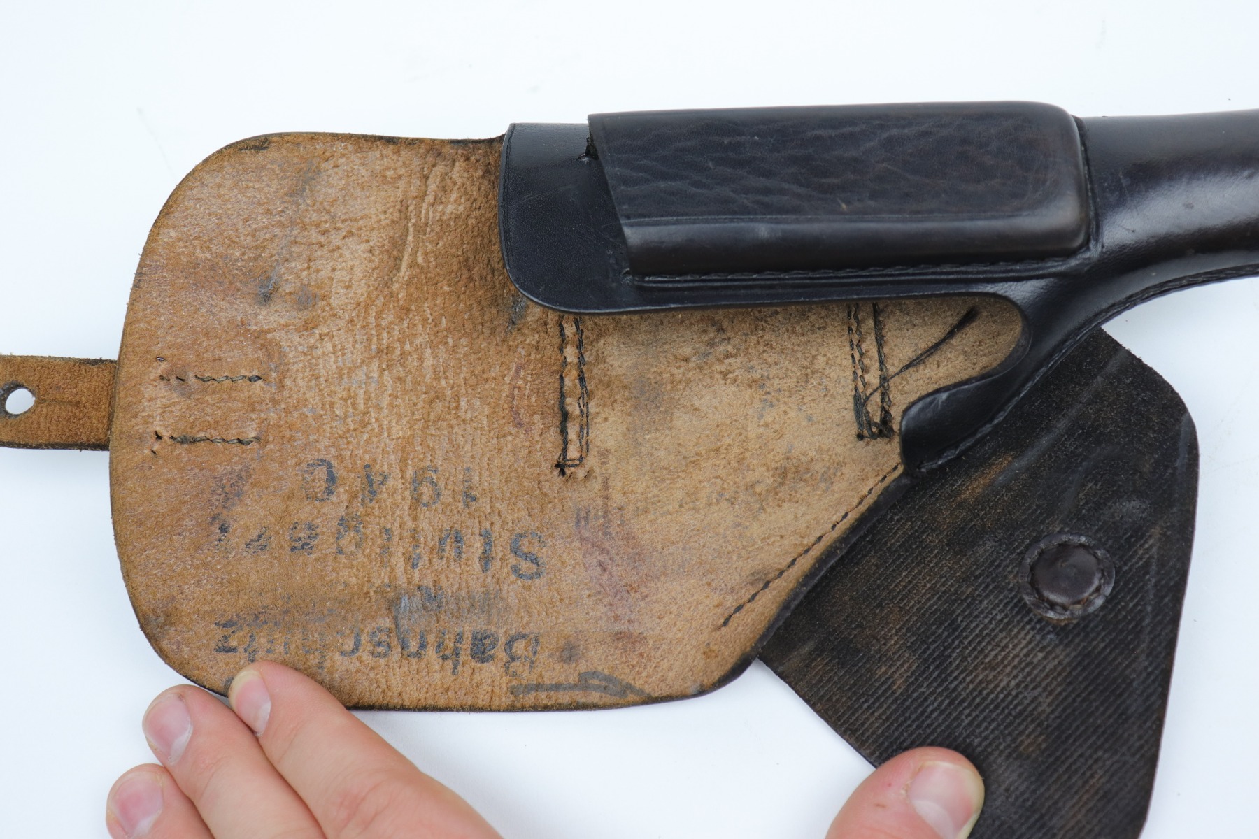 10/14/20 – This is an excellent example of a black leather holster that would have been issued to a Nazi Railway guard. The ink stamp dates the holster to 1940 and places it at the Stuttgart Railway station. It is Akah marked under the closure strap. It would be appropriate for a Railway-issued Walther PP or PPK. The holster is in excellent condition – just a few light handling marks and wrinkling on the top flap.