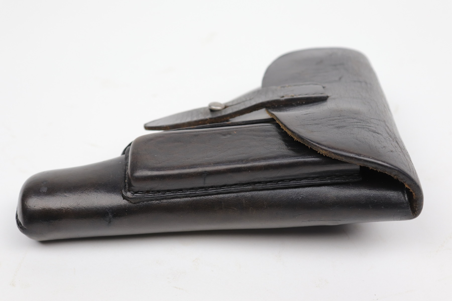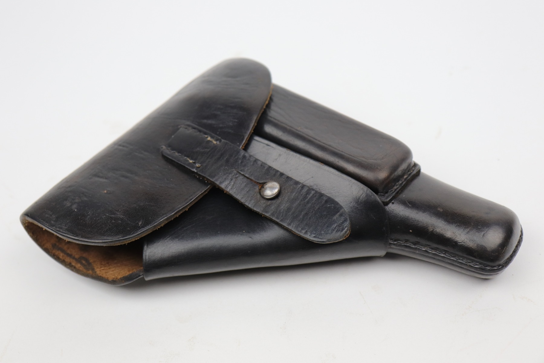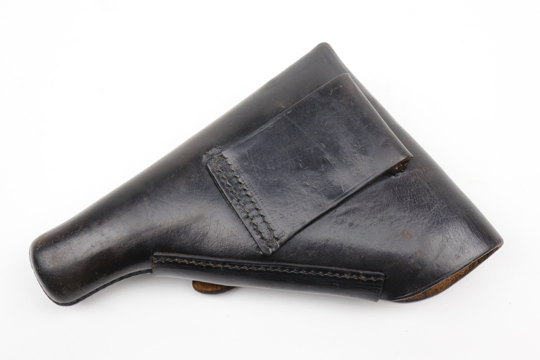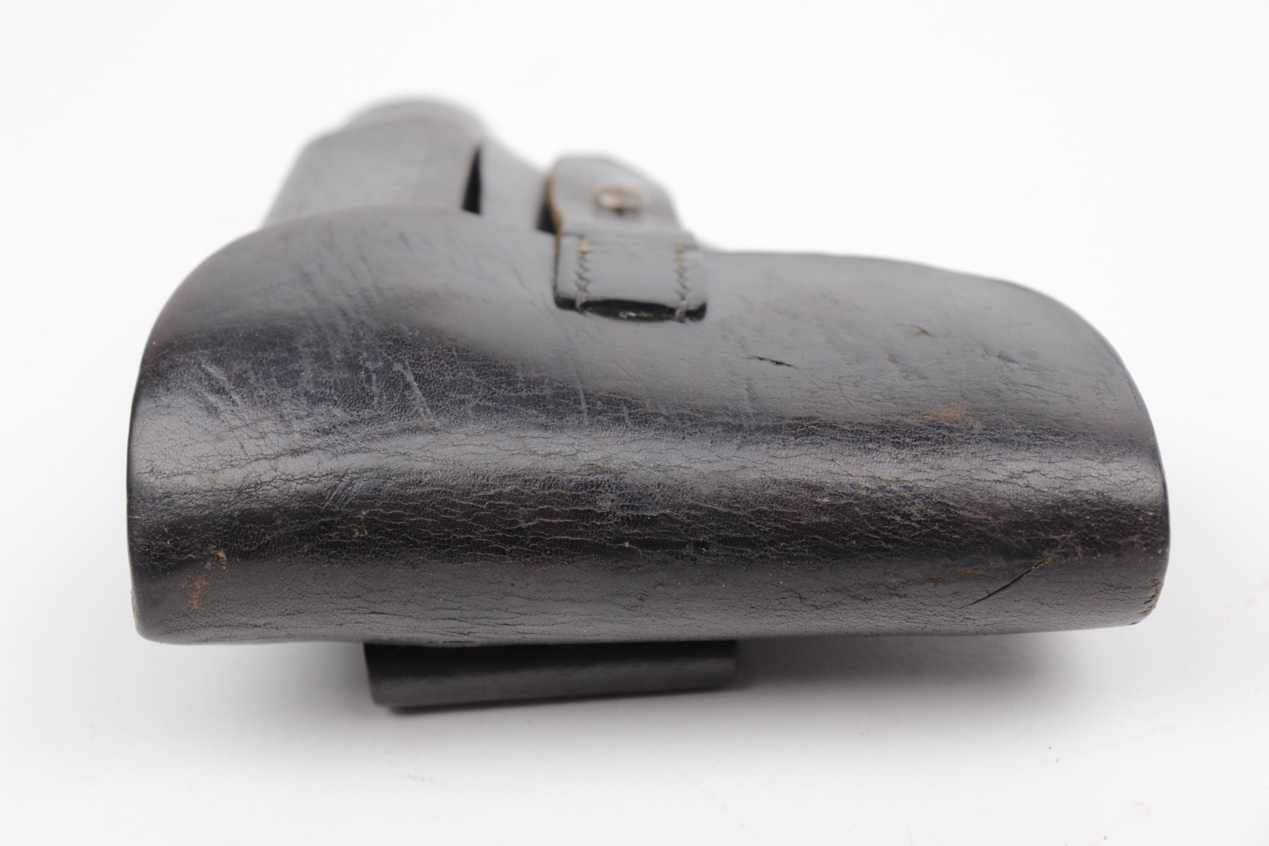 10/14/20 – This is an excellent example of a black leather holster that would have been issued to a Nazi Railway guard. The ink stamp dates the holster to 1940 and places it at the Stuttgart Railway station. It is Akah marked under the closure strap. It would be appropriate for a Railway-issued Walther PP or PPK. The holster is in excellent condition – just a few light handling marks and wrinkling on the top flap.