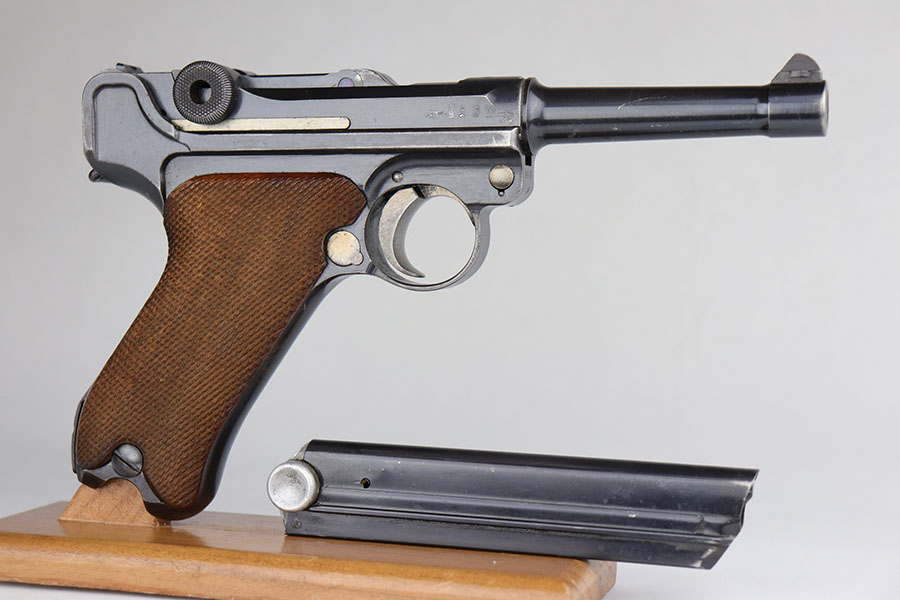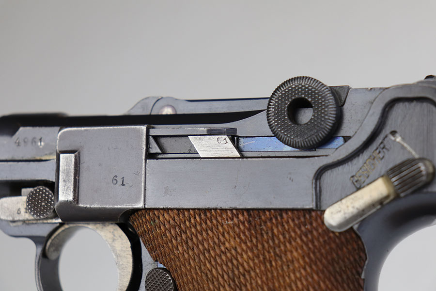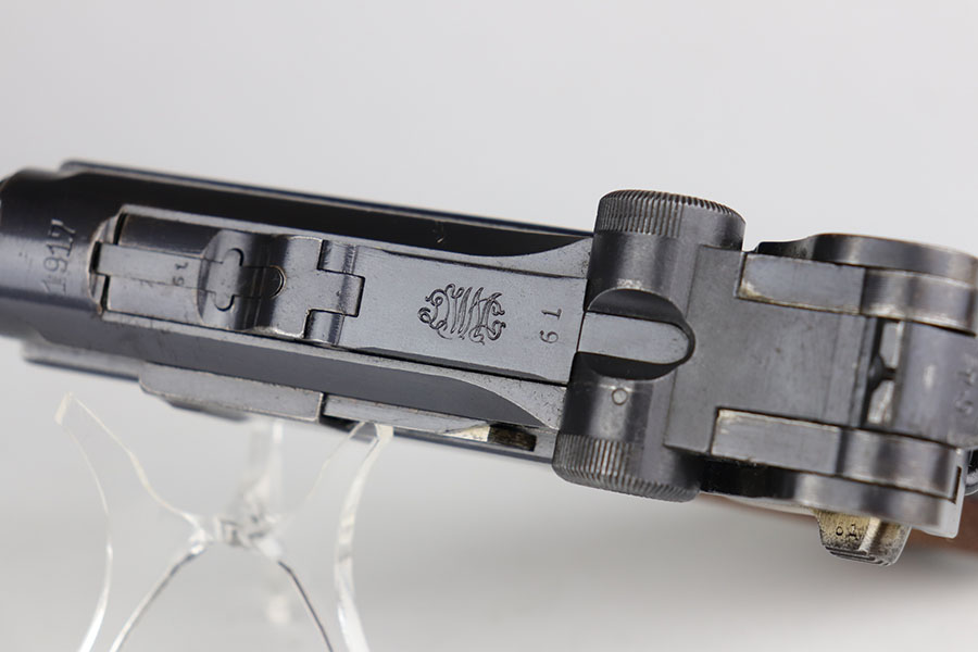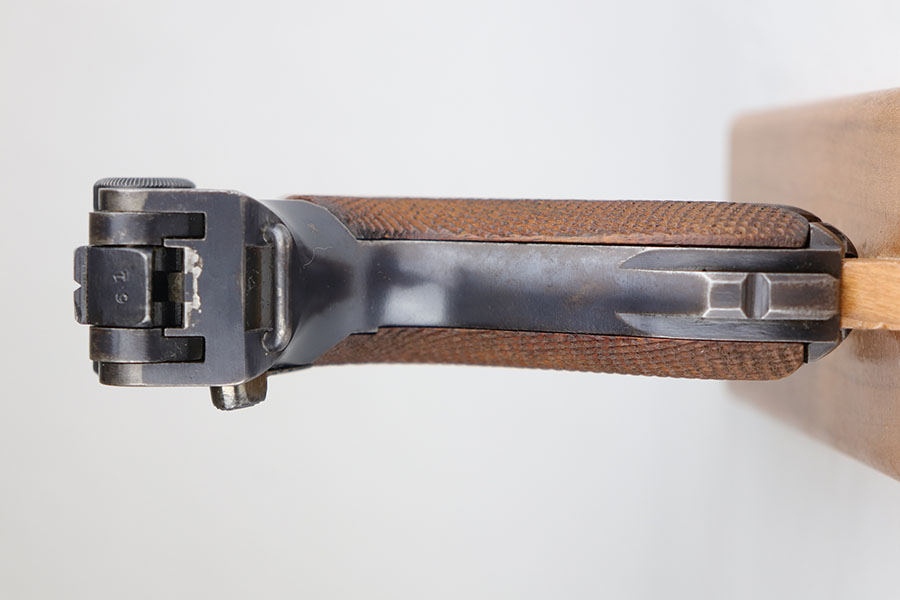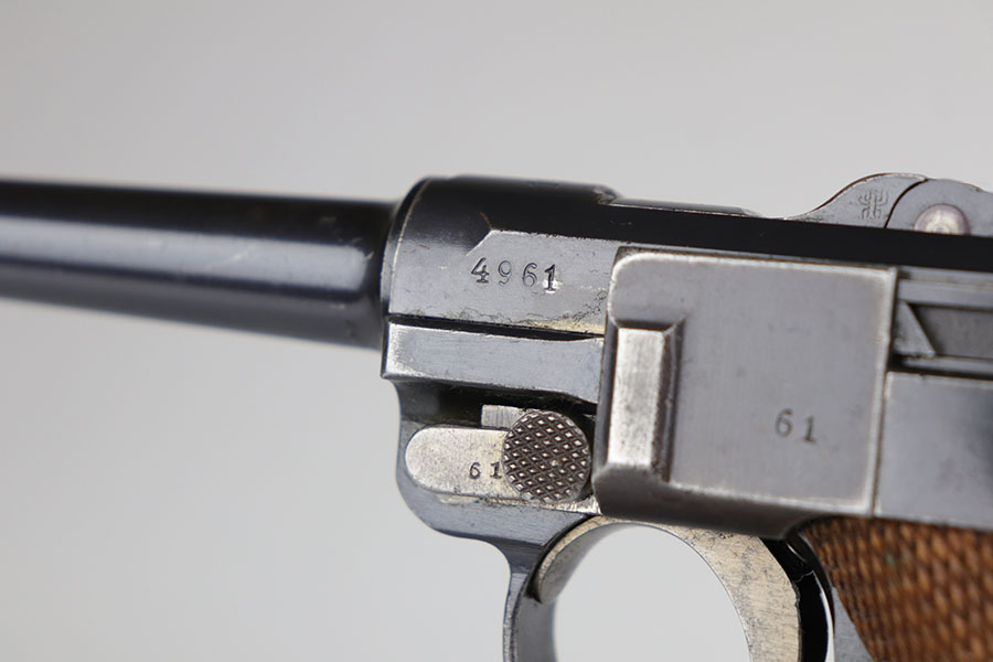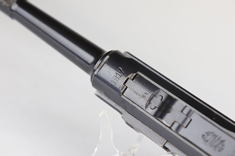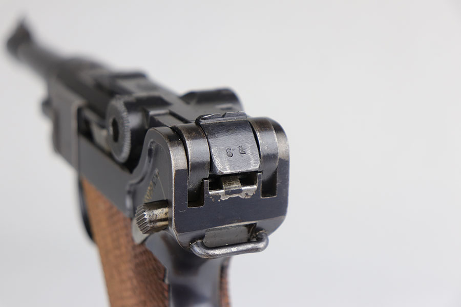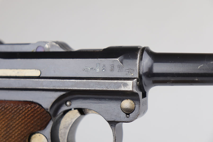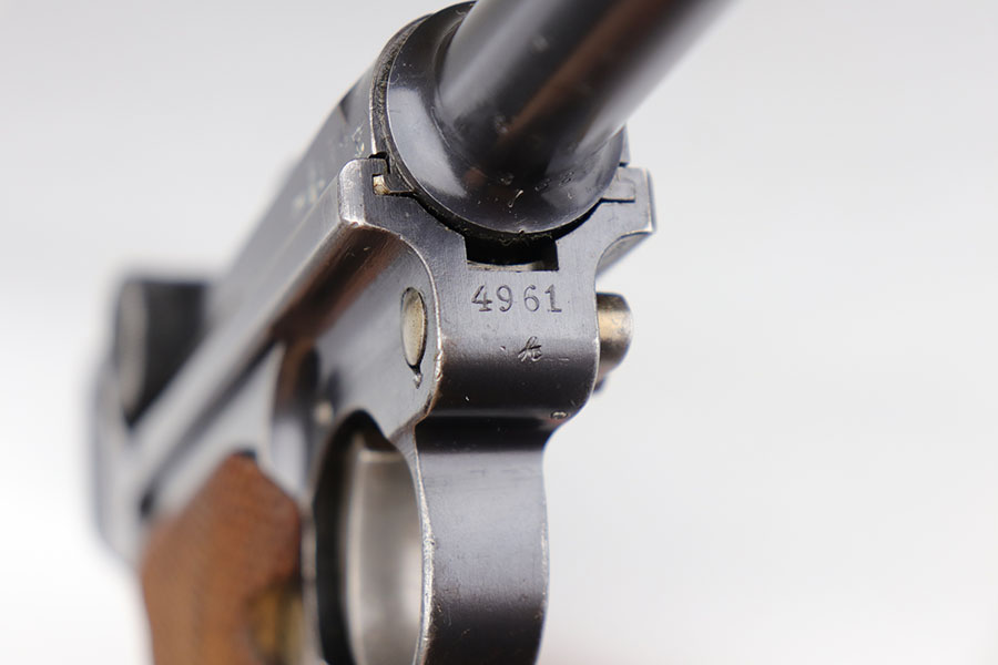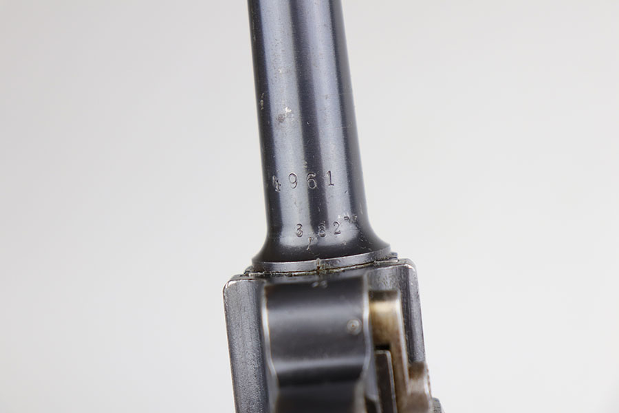 7/2/20 – This gun started out in 1917, during WW1, for the German Army. It was made by DWM. It survived the 1st World War, and stayed in service until the outbreak of WW2. At that time, the Mauser factory was making Lugers for the German (Nazi) Army, so that when the Waffen SS started up they had a hard time procuring arms. It is known that they opted to pick up foreign issued pistols such and the Polish Radom, Browning HP, and also re-worked WW1 guns. This particular gun has the Imperial proofs on the right side, but also TWO Nazi rework marks. These re-worked guns often went to the Waffen SS troops. The numbers are all matching, with the exception of the magazine. This gun has retained about 95% of its original bluing. Most of the wear is on the high edges and on the side plate. There is also some muzzle wear and at the base of the front strap. A few light surface marks here and there. Light pin-pricking on the straps. The bore has great rifling but minor frosting throughout. Magazine is scarce WW2 variation as it’s ‘fxo/37’ marked with unmarked base.