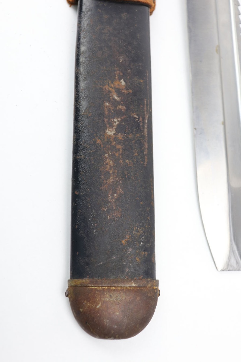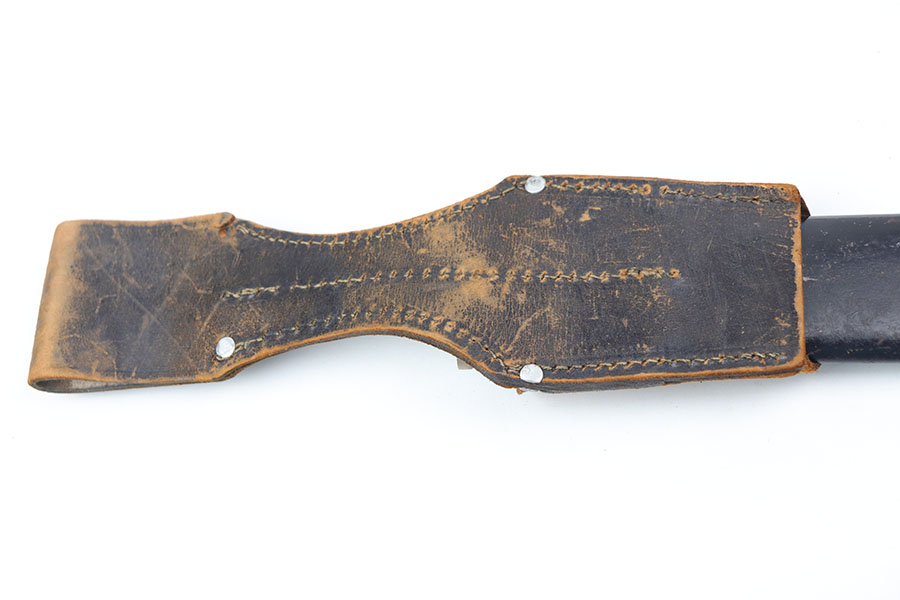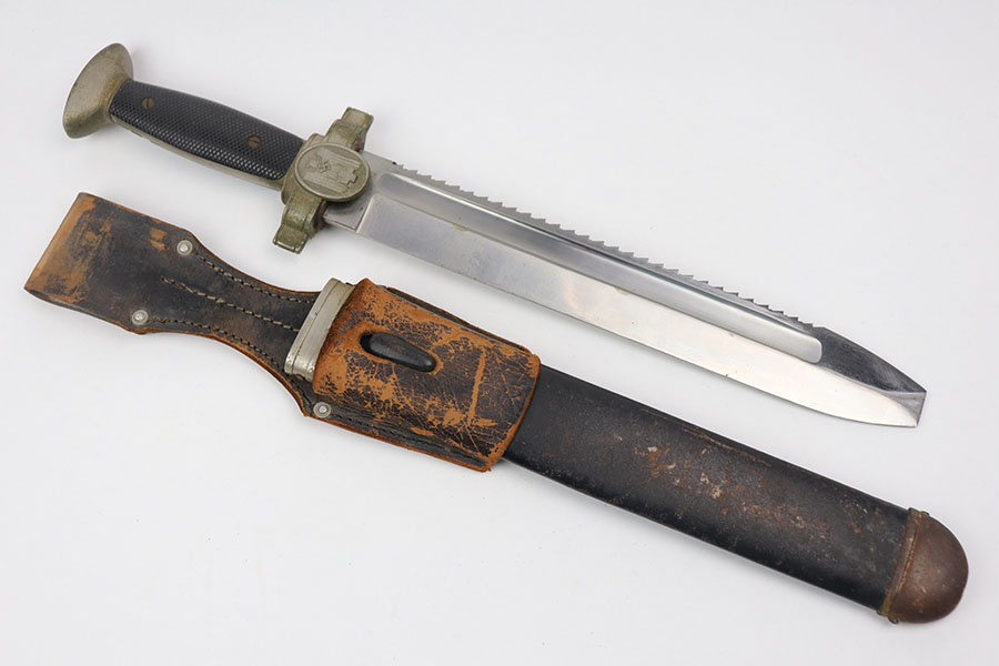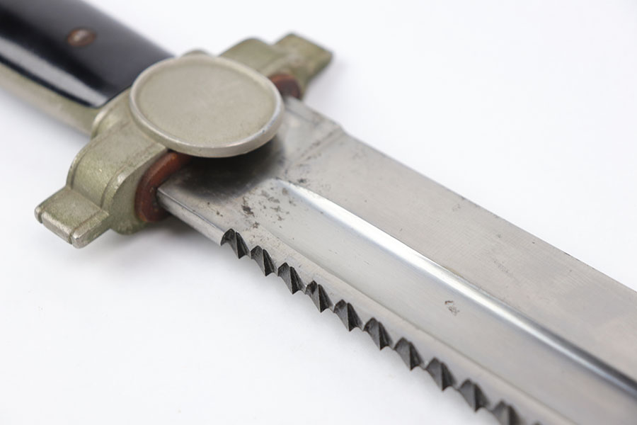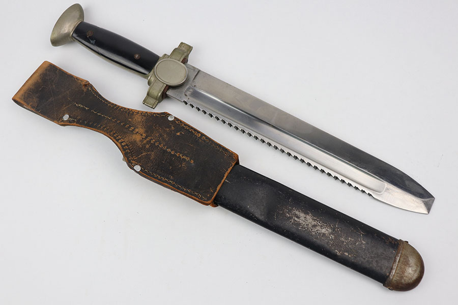 10/19/20 – This is an original Red Cross Hewer sawtooth dagger. The blade is excellent with minimal wear or discoloration. Comes with an original scabbard and leather frog. The leather is unmarked with some surface scuffing and wear throughout. The scabbard has a small dent on the backside and some discoloration and a few areas of rust. The handle is cracked on the backside as shown.