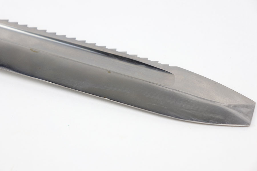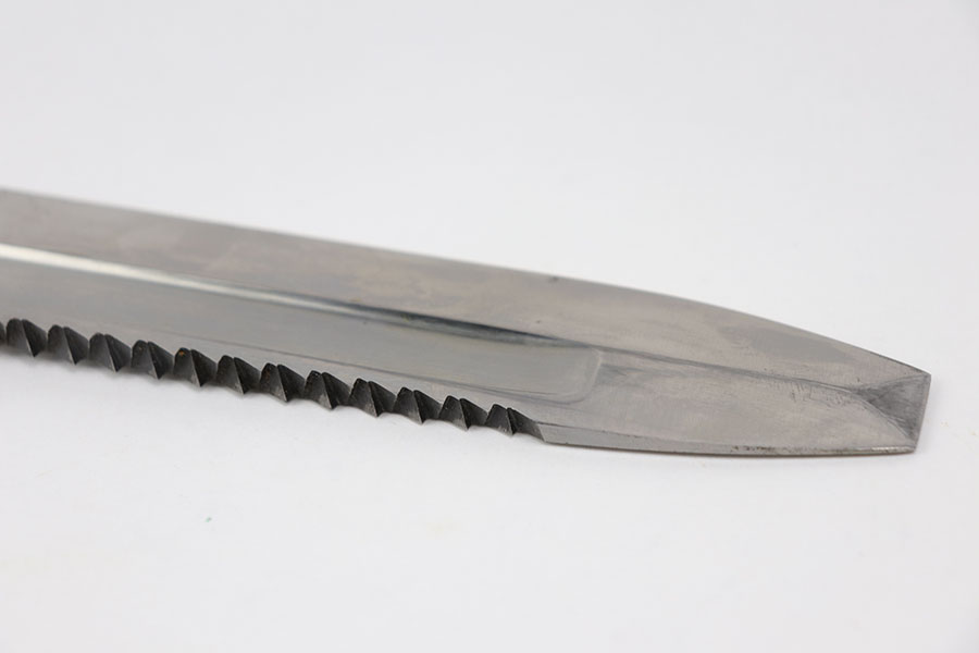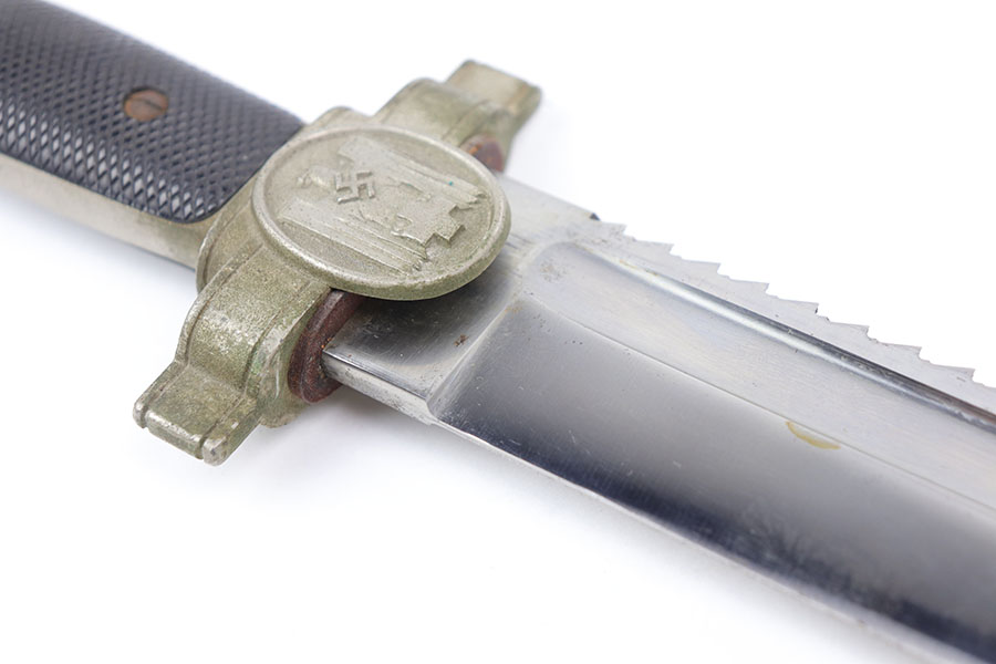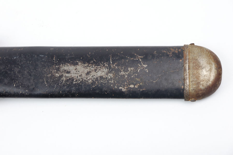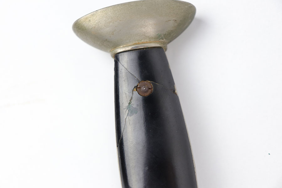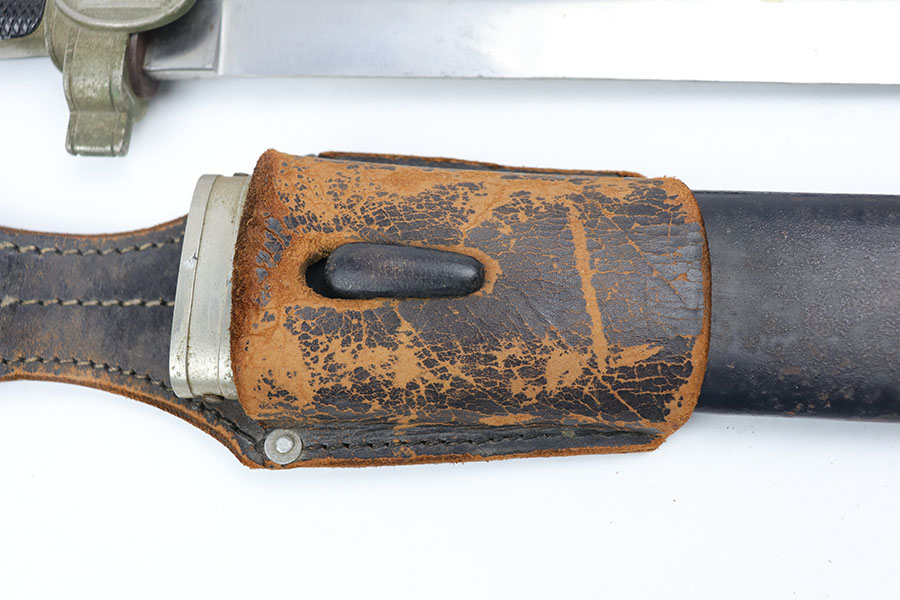 10/19/20 – This is an original Red Cross Hewer sawtooth dagger. The blade is excellent with minimal wear or discoloration. Comes with an original scabbard and leather frog. The leather is unmarked with some surface scuffing and wear throughout. The scabbard has a small dent on the backside and some discoloration and a few areas of rust. The handle is cracked on the backside as shown.