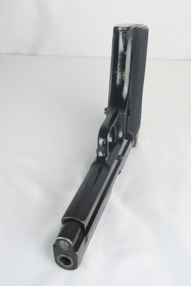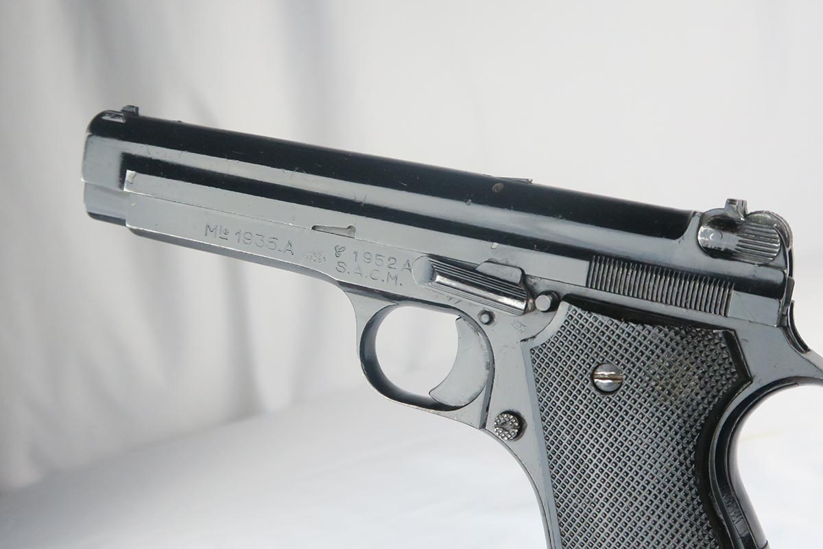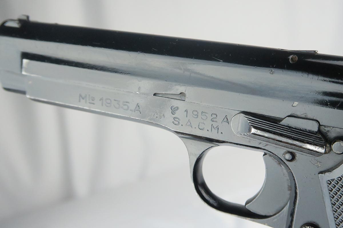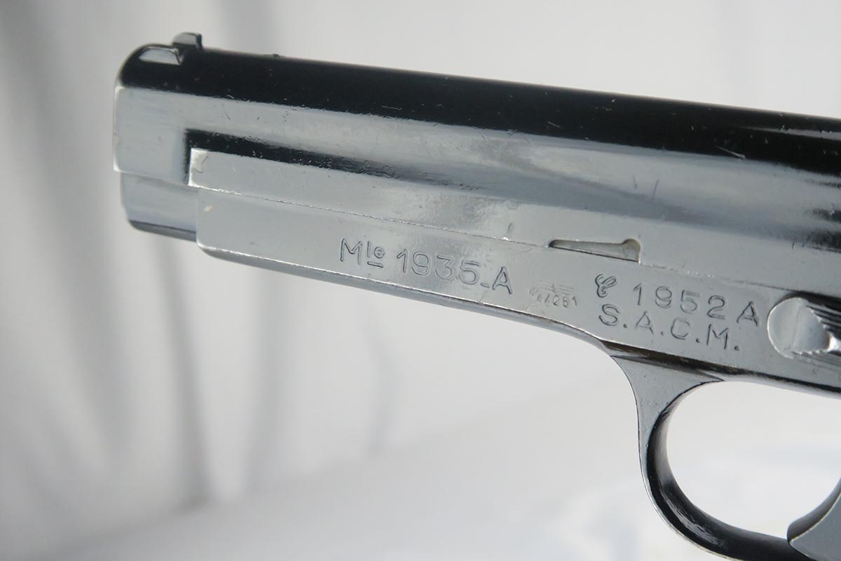 1/9/18 – This is a M1935A manufactured by SACM (Societe Alsacienne Construction Mecanique) in Cholet, France. It is Nazi-marked E/WaA251 on the left side of the slide, making this the more common 2nd variation model of these pistols. Overall, they remain fairly scarce for German Army pistols of that time, with only about ~24,000 produced. The serial dates this one to the earlier end of the range, likely produced somewhere around 1942. The original finish is about 92-94%, with the majority of the wear found on the found strap. All original and correct with a strong bore.