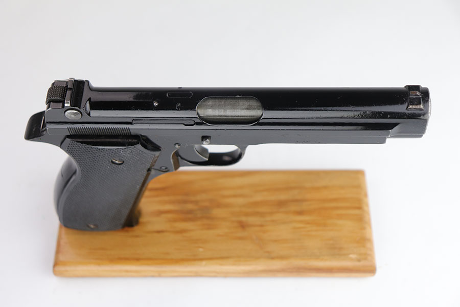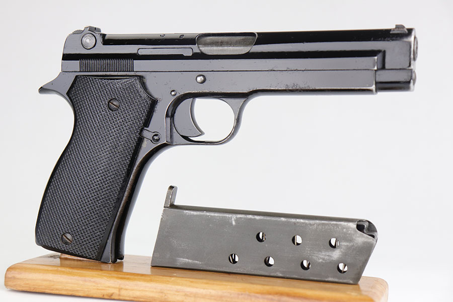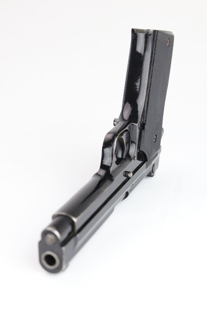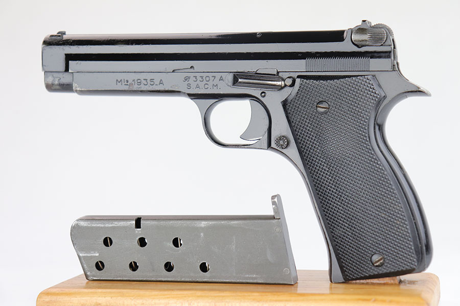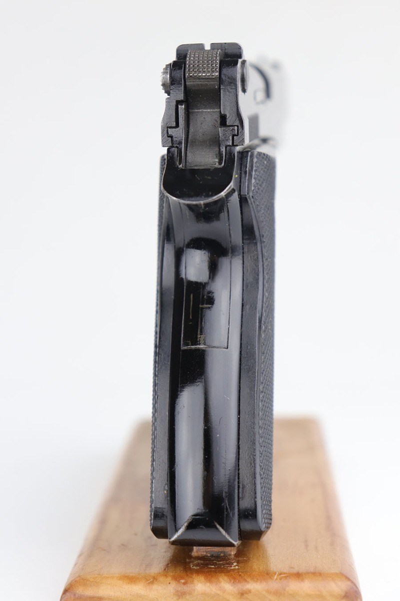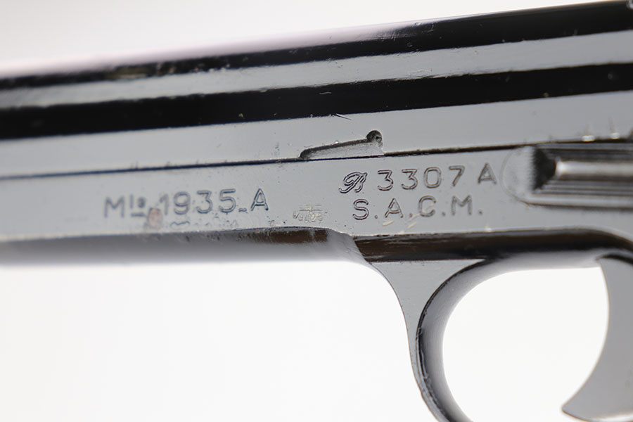 3/17/20 – This is an all original M1935A rig, manufactured by SACM (Societe Alsacienne Construction Mecanique) in Cholet, France. It is Nazi-marked E/WaA251 on the left side of the slide, making this the more common 2nd variation model of these pistols. Overall, they remain fairly scarce for German Army pistols of that time, with only about ~24,000 produced. The serial dates this one to the earlier end of the range, likely produced somewhere around 1941-1942. The original finish rates at about 95% with some wear near the muzzle, on the trigger guard and the edges of the front strap. There is also some minor freckling on the edges of the right side frame, and left side slide. Terrific bore and excellent grips.
