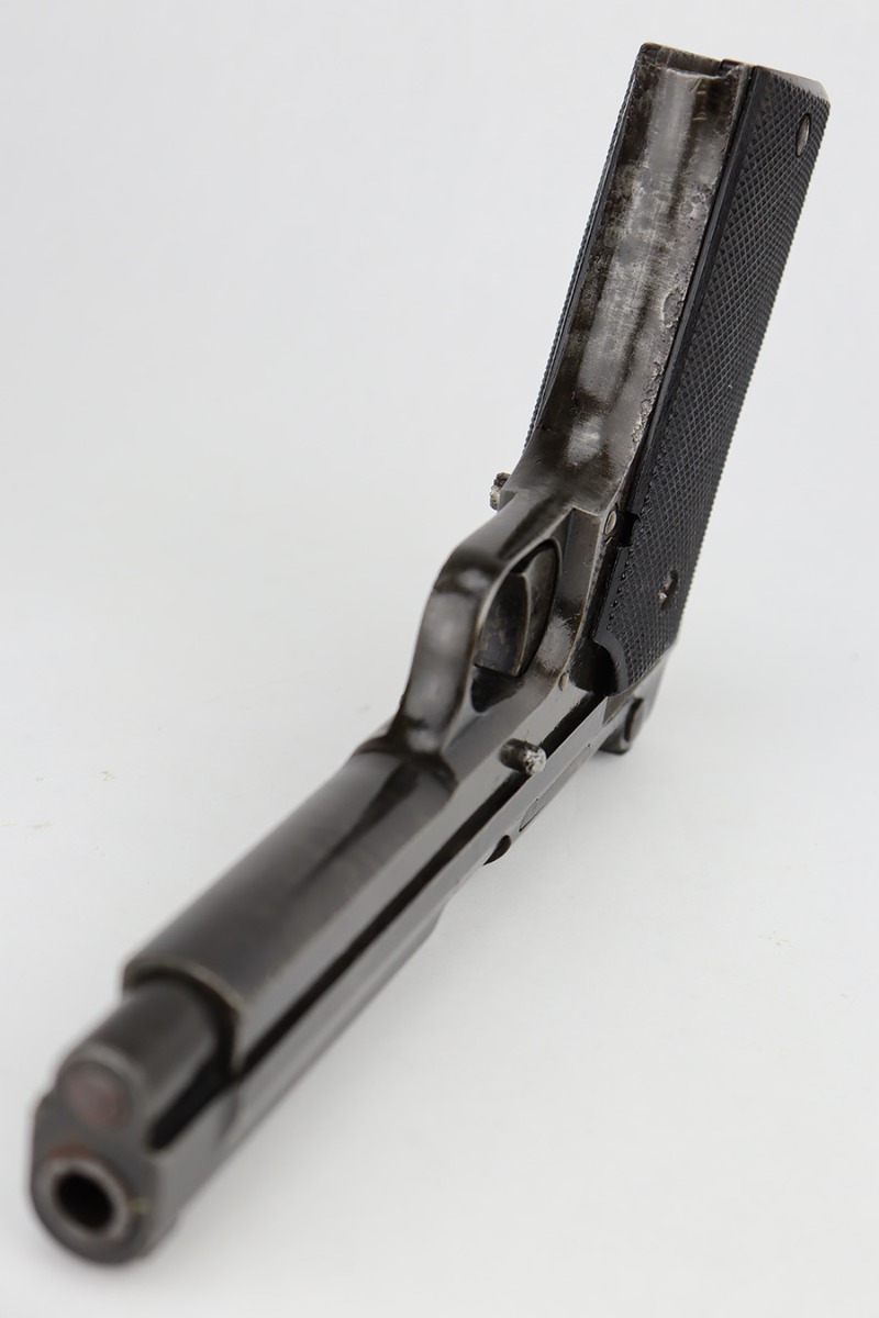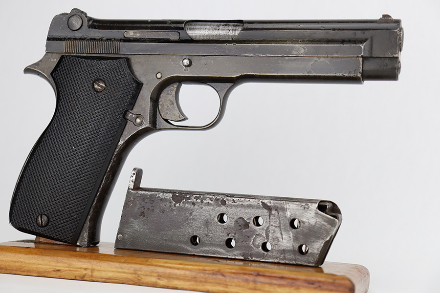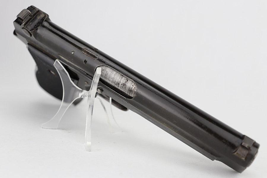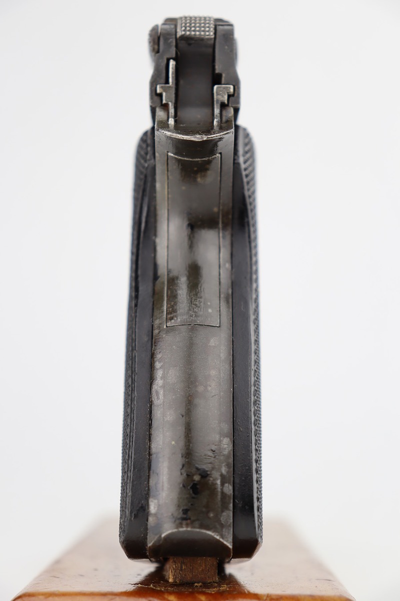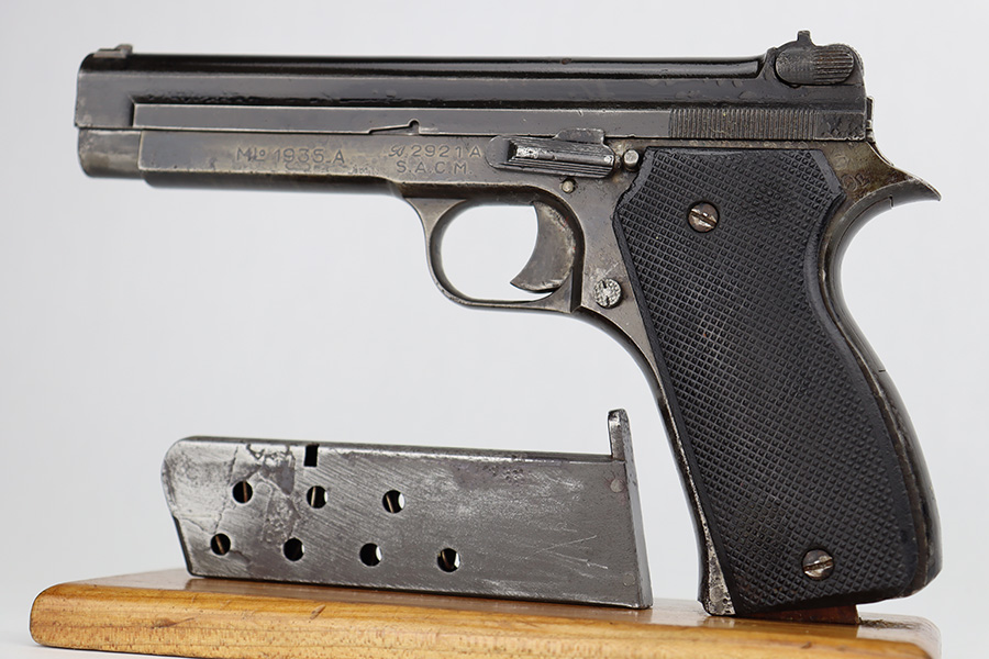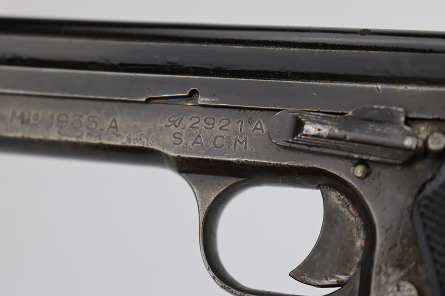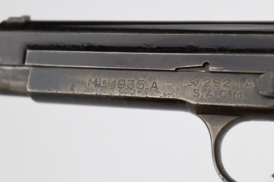 6/12/23 – This is a French SACM Model 1935A issued to the Nazi military during WW2. It is all matching with the proper “Waffen 251” military acceptance proof. It has lost the majority of its original black enamel finish with obvious finish loss and discoloration throughout. There are areas of pitting here and there, most obvious on the front strap, around the muzzle, and on some of the high edges. Fitted with slightly worn period-correct black grips. Comes with one proper magazine. Excellent bore with strong rifling.