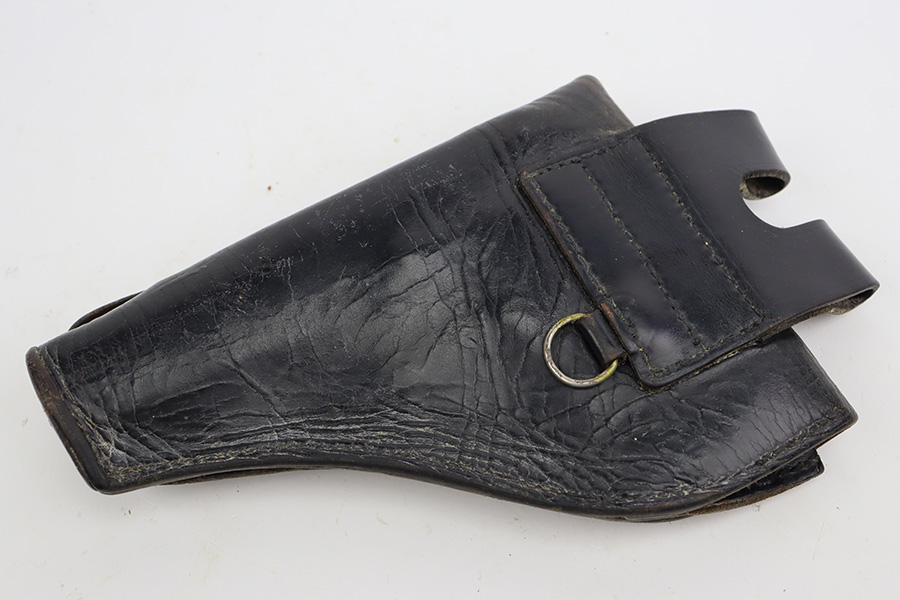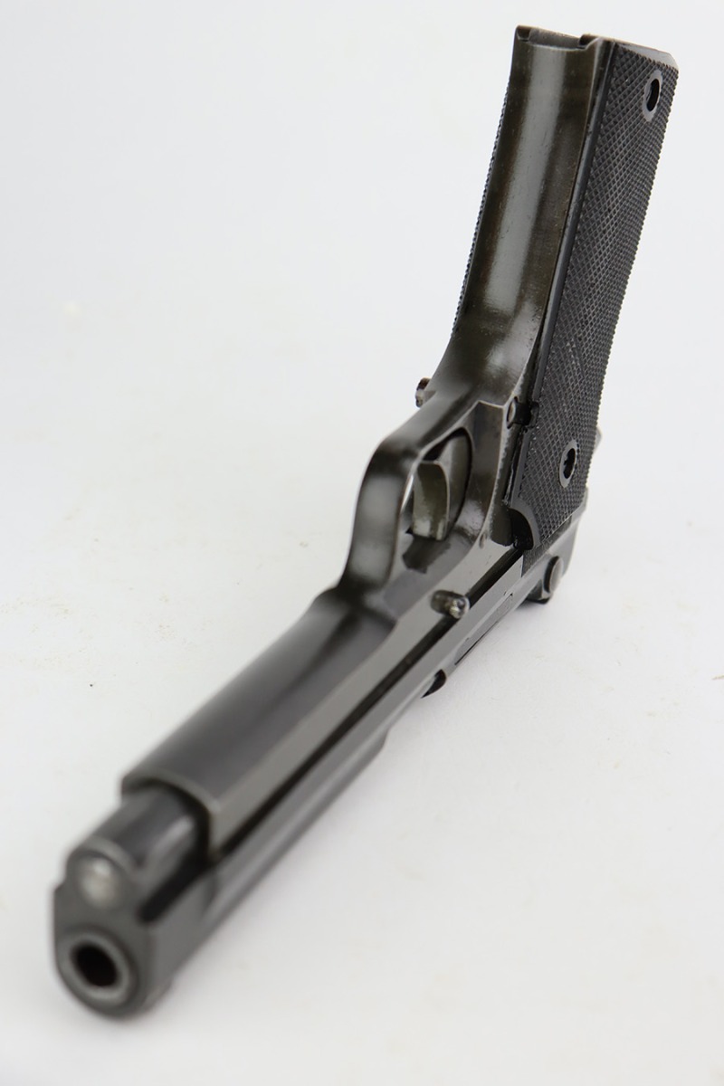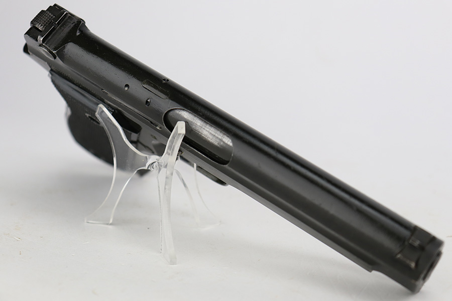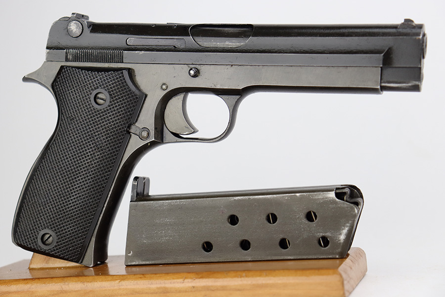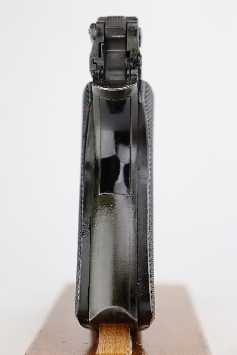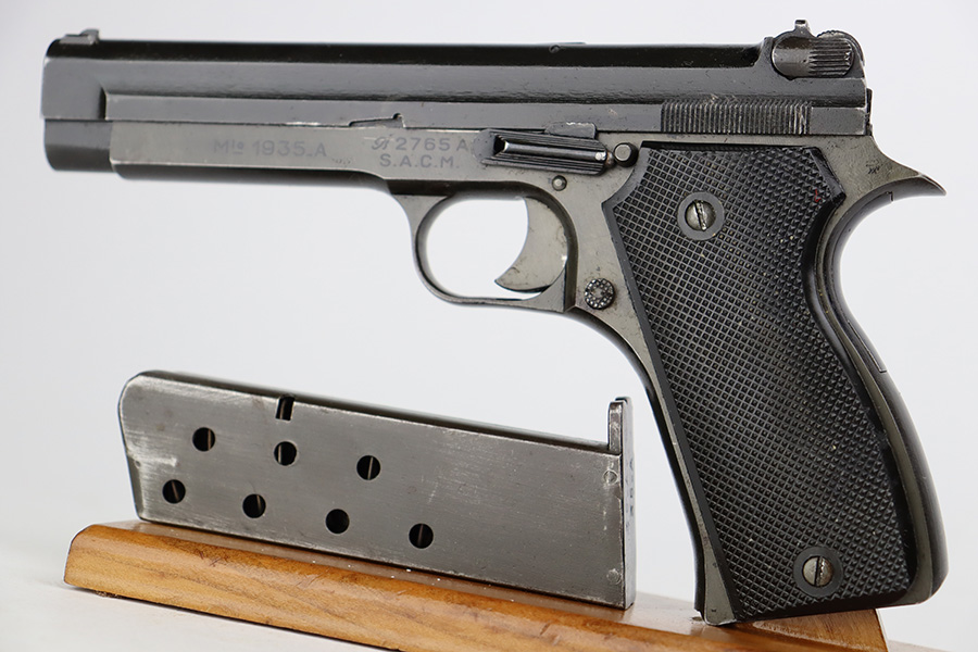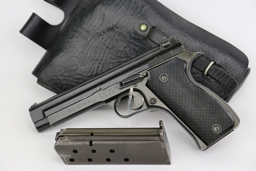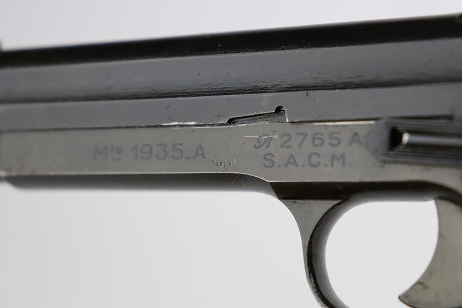 8/8/23 – This is a nice example of a French SACM Model 1935A issued to the Nazi military during WW2. It has proper “Waffen 251” military acceptance proof on the left side of the frame. The slide is not numbered. It comes as a rig with a generic black leather holster and two proper magazines. Virtually all of the gun’s black enamel finish is gone, but there is still some bluing left under that finish. Obvious thinning on the frame as compared to the slide. Fitted with excellent period-correct black bakelite grips. Minty bore. This one has a sister listing on the website right now that is only two serial numbers away! Link below.