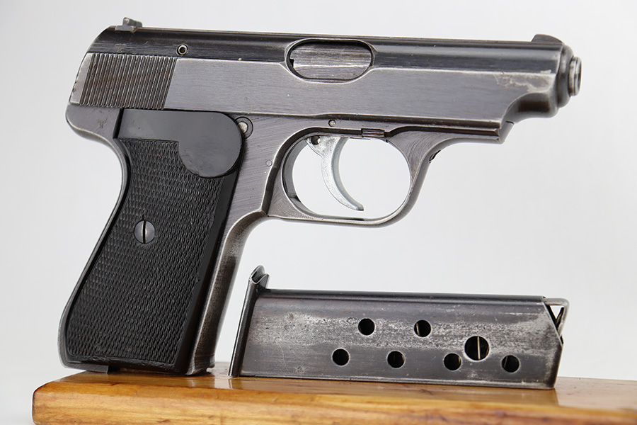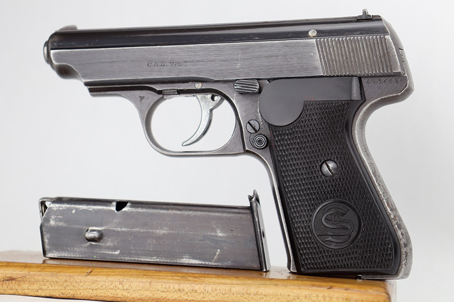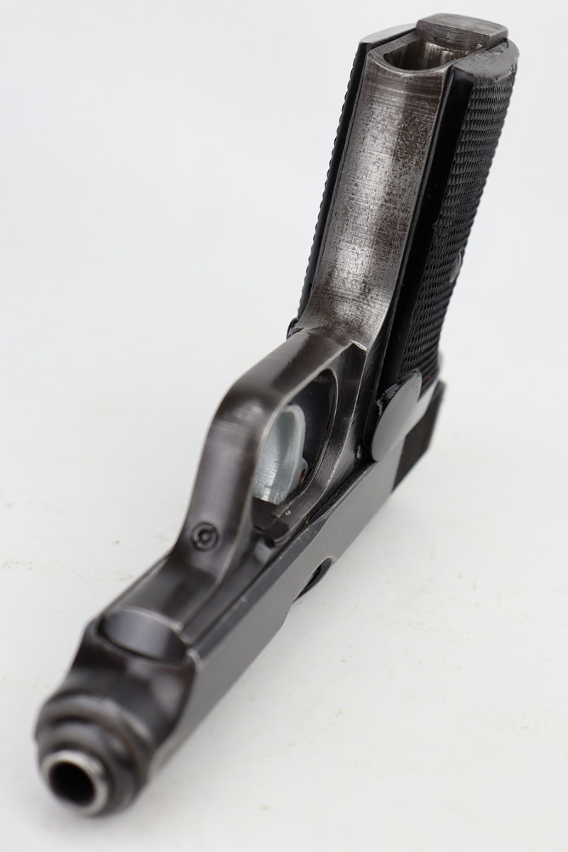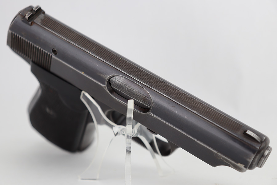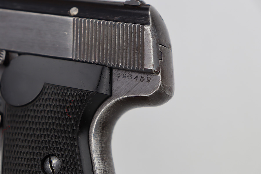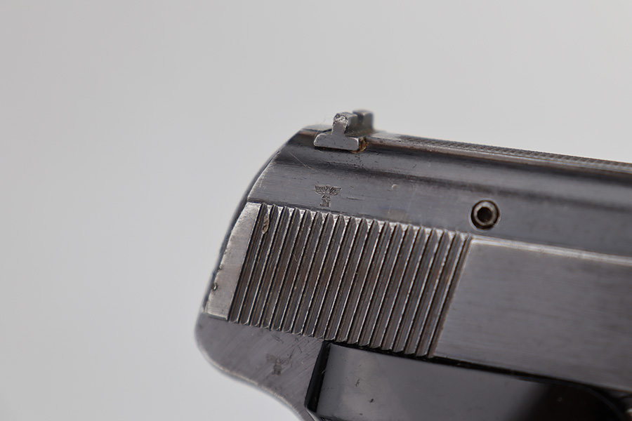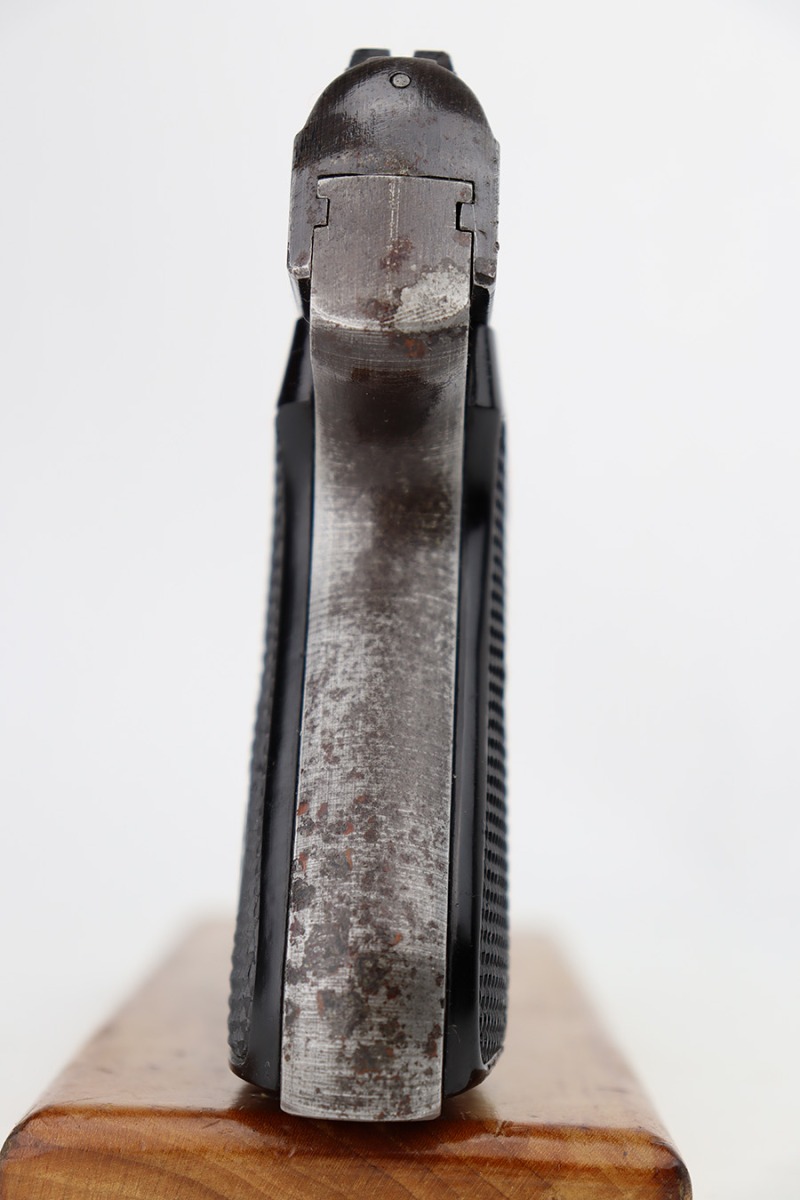 5/3/24 – This is a nice example of a Sauer 38h issued to the Nazi military during WW2. All matching with the proper “Eagle 37” military acceptance proof on the left side of the trigger guard. Almost all of the wear is on the grip straps, where there is also spotty oxidation. The profile views are fairly nice. Minor muzzle wear and a spot of discoloration at the right front of the slide. Fitted with nice period-correct black bakelite grips. Comes with one proper magazine. Mint bore.