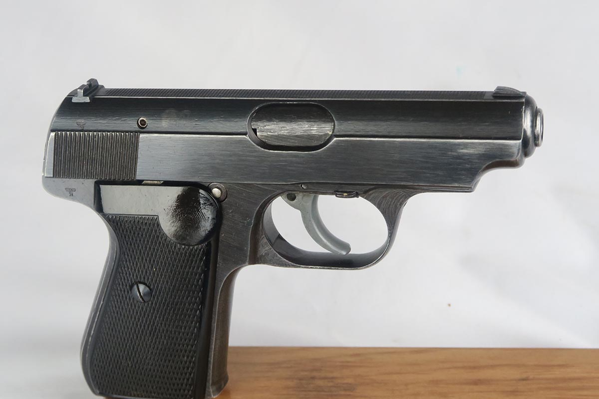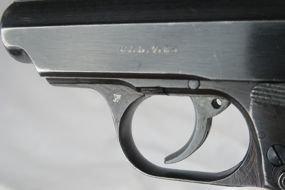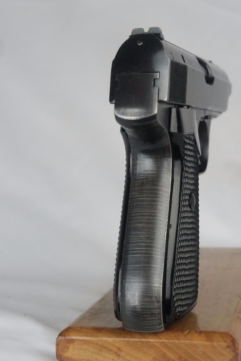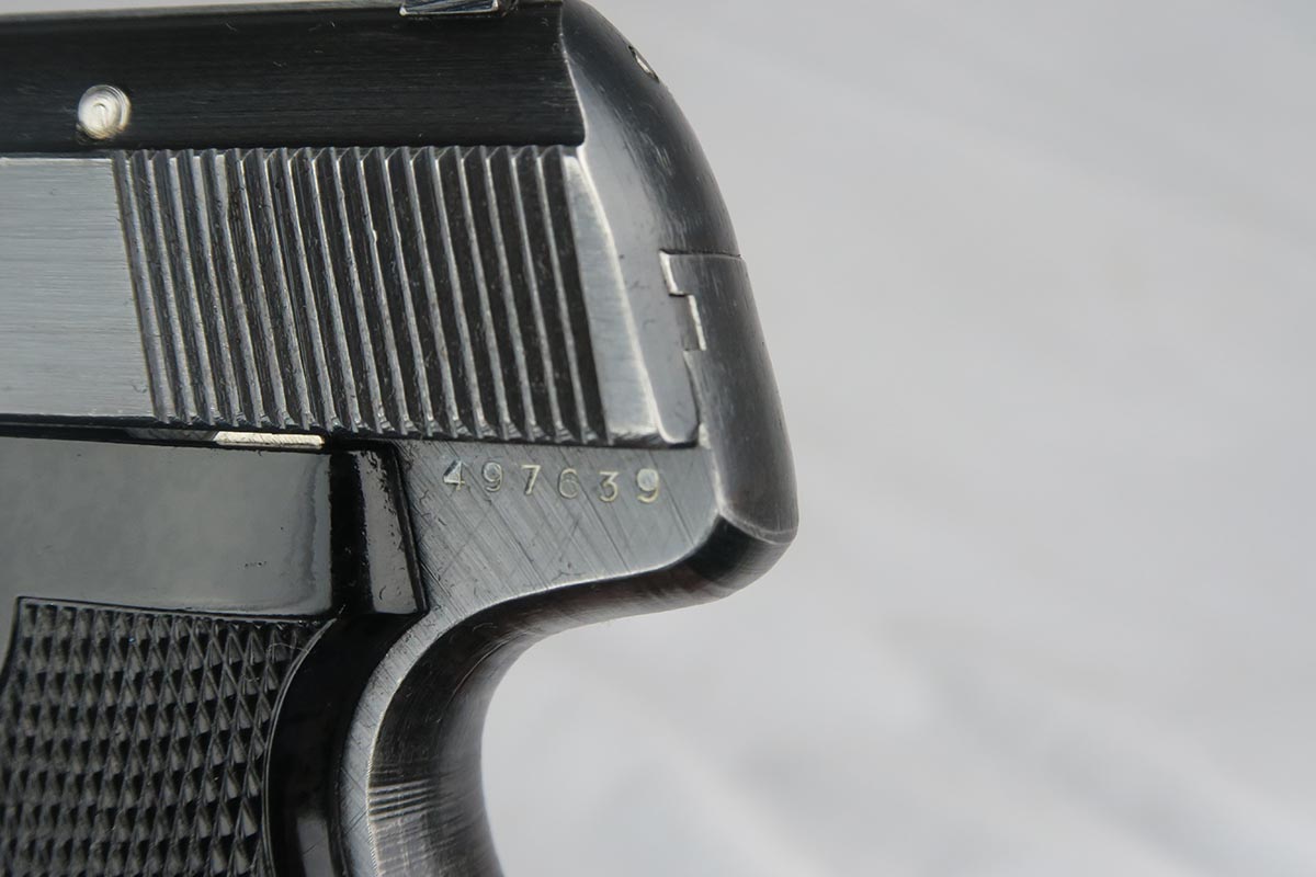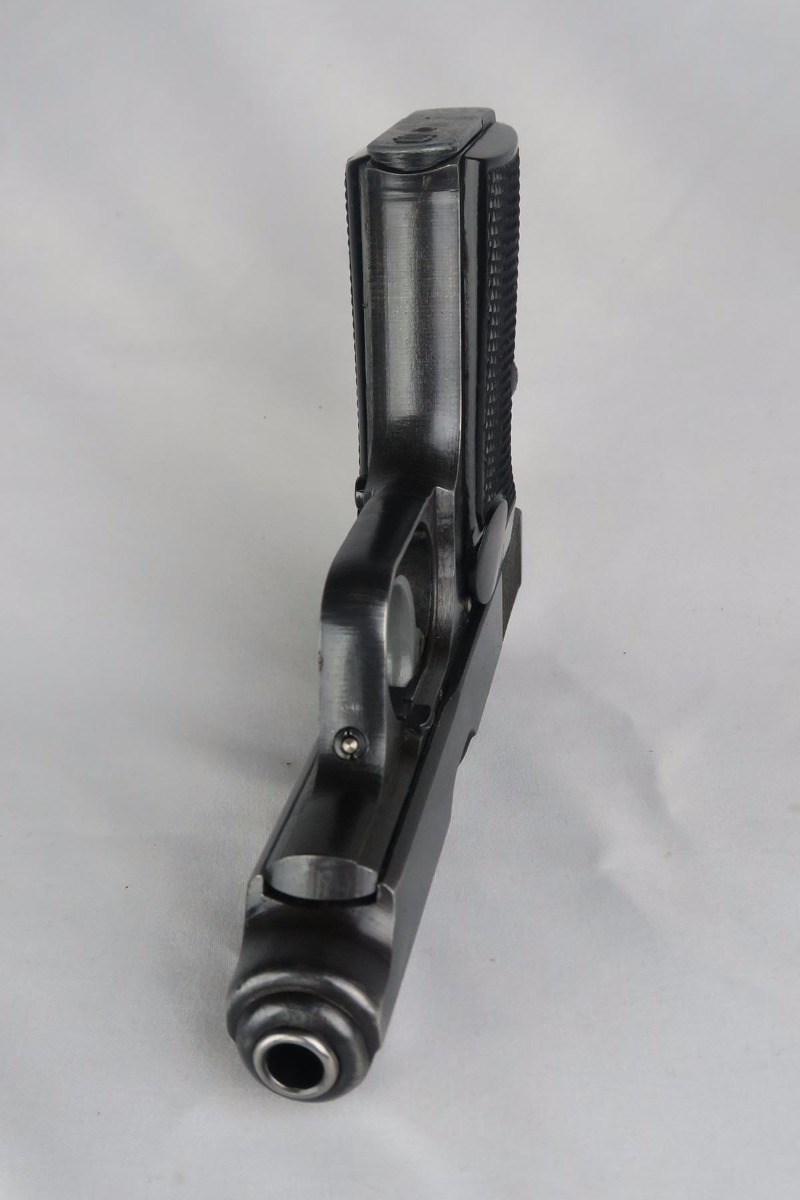10/16/17 – This is a Nazi-issued Sauer 38h from mid-WWII.  It is all original and correct with about 95% military blue remaining.  The slide has minor edge and muzzle wear, and the straps so some thinning.  Excellent grips and minty bore.