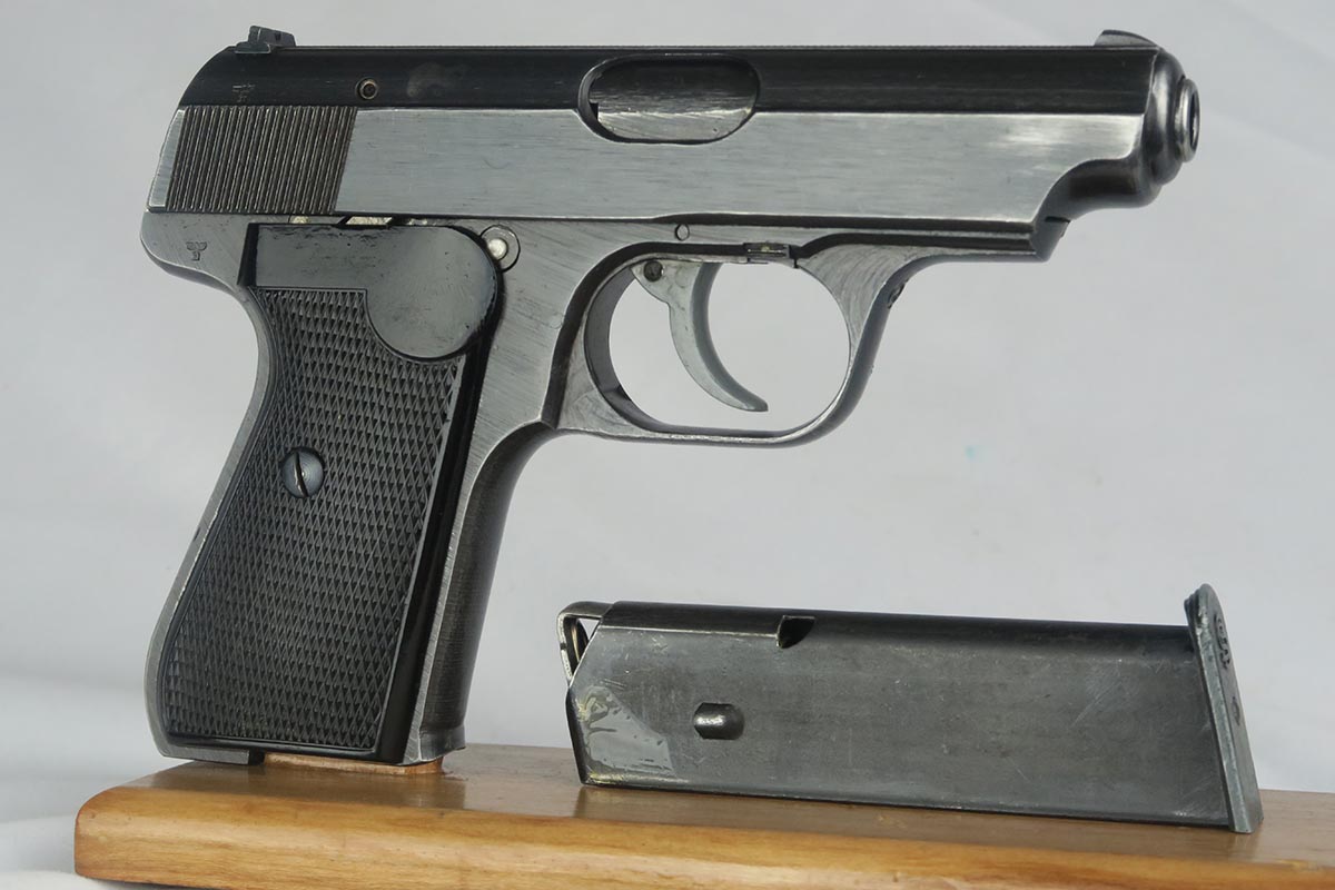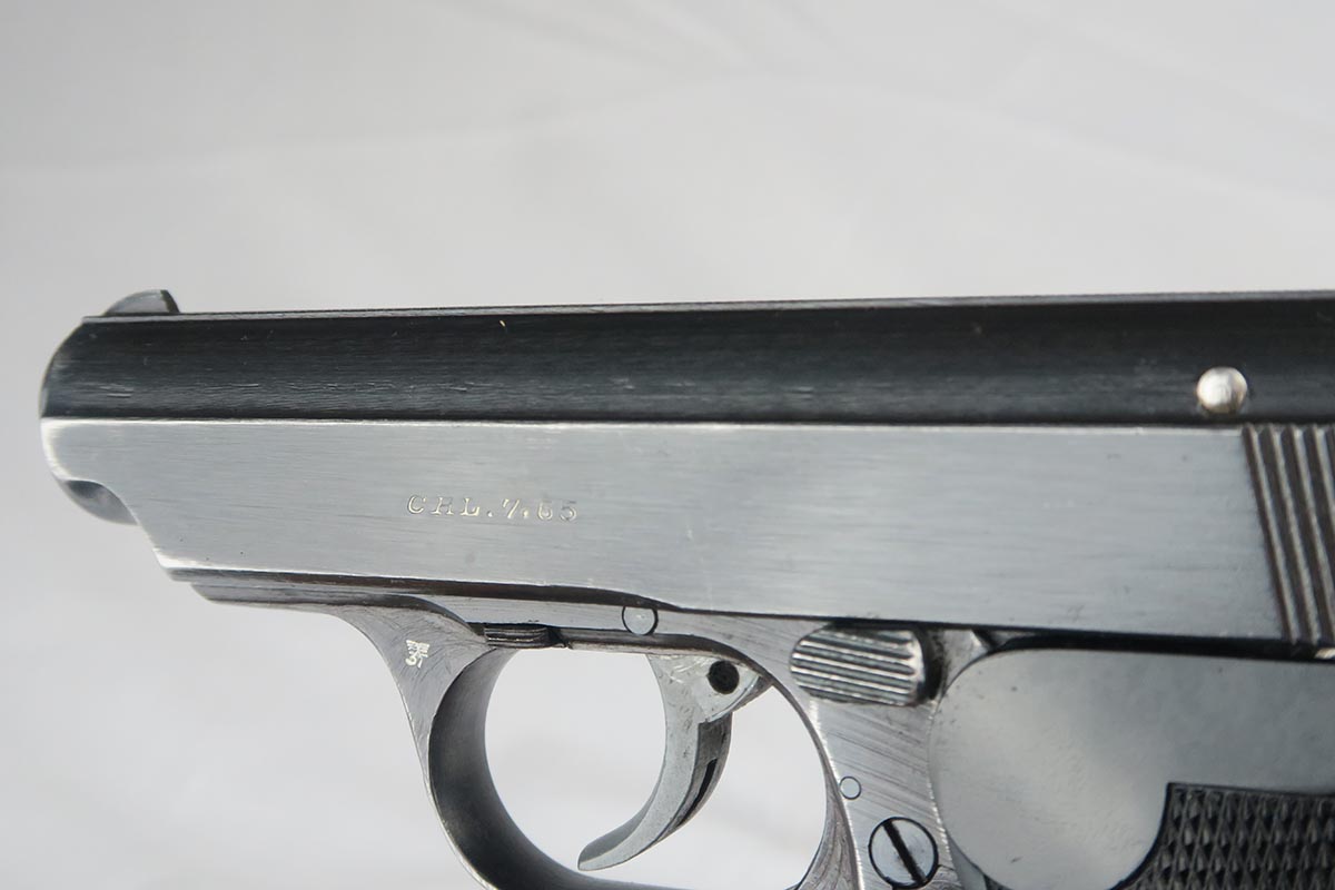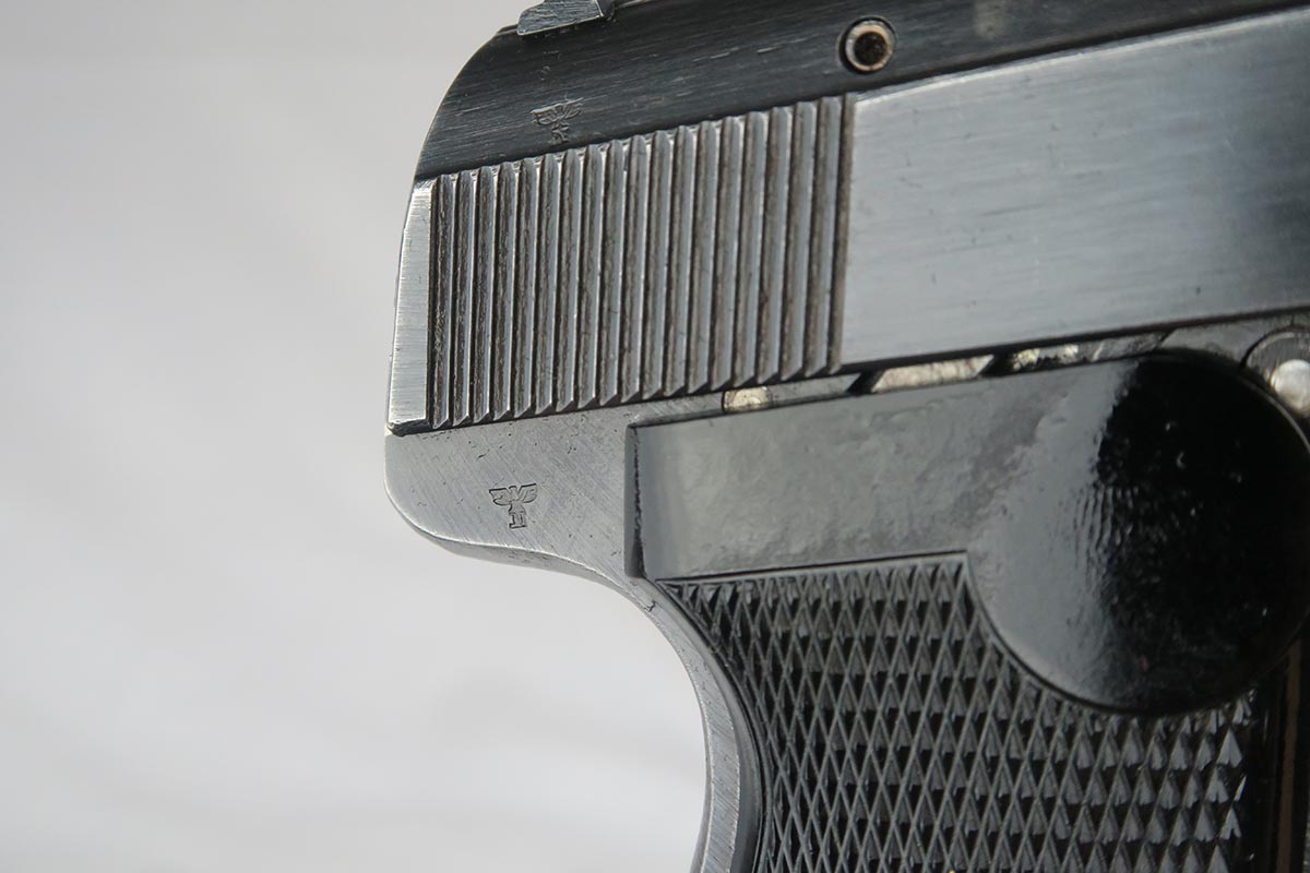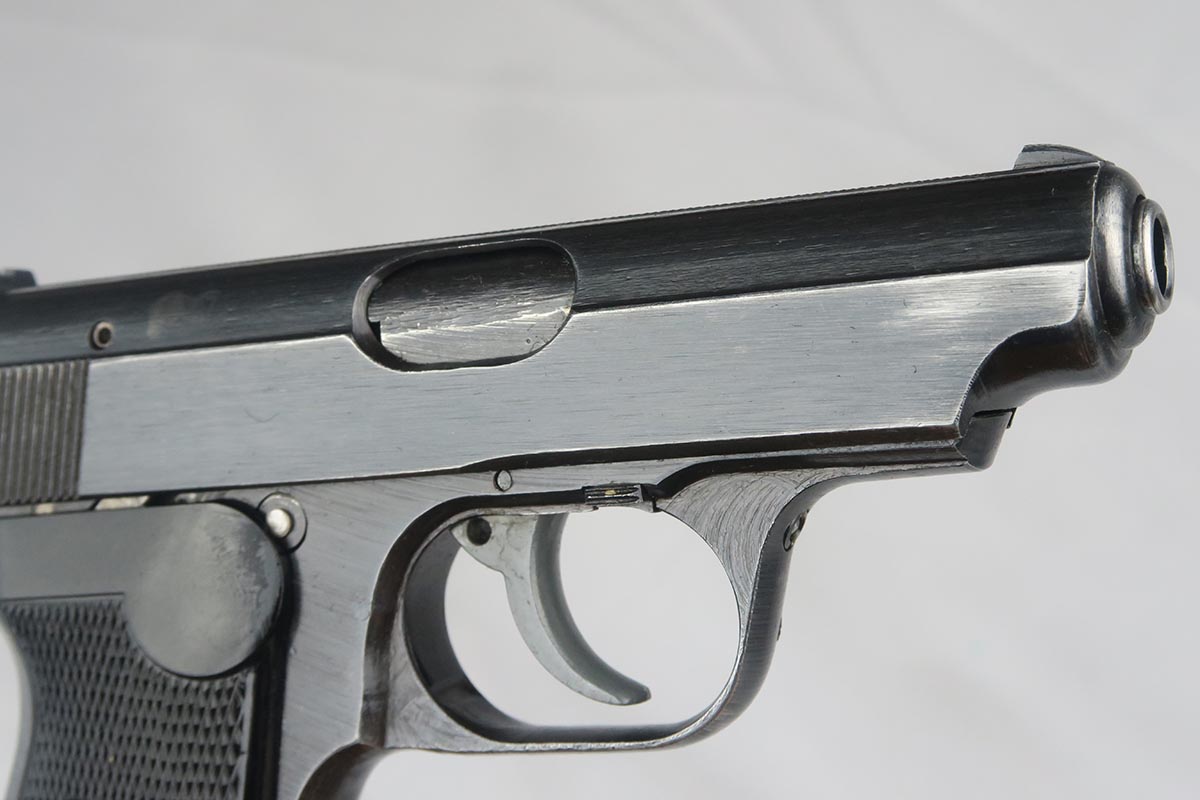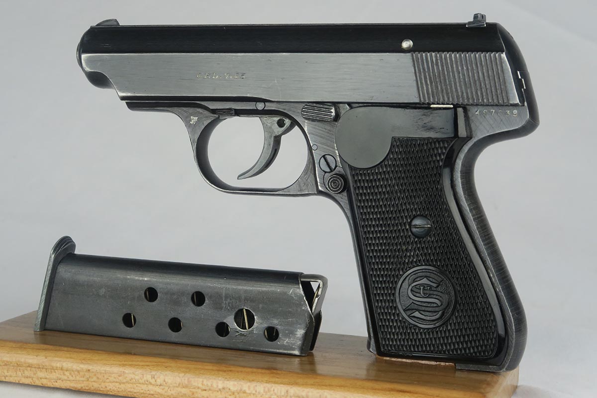 10/16/17 – This is a Nazi-issued Sauer 38h from mid-WWII.  It is all original and correct with about 95% military blue remaining.  The slide has minor edge and muzzle wear, and the straps so some thinning.  Excellent grips and minty bore.