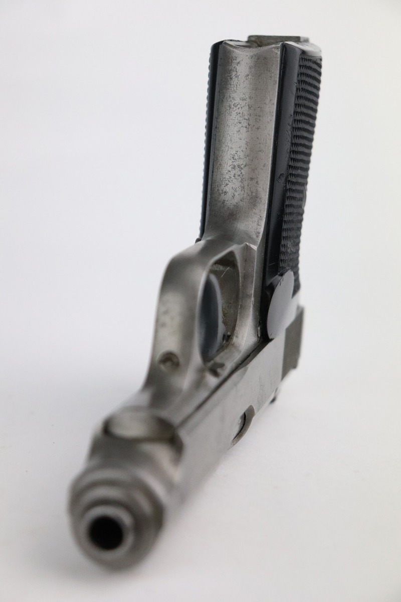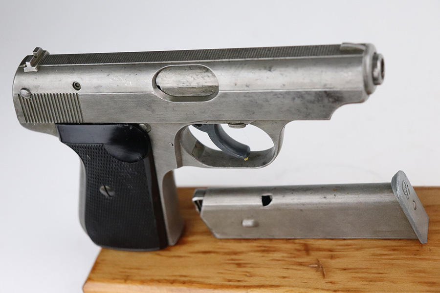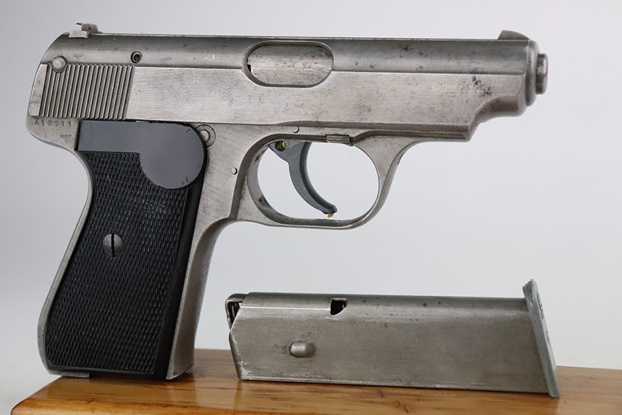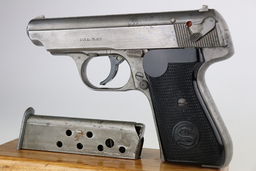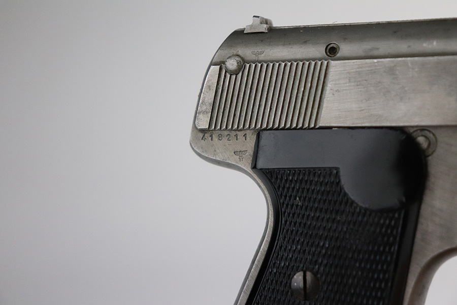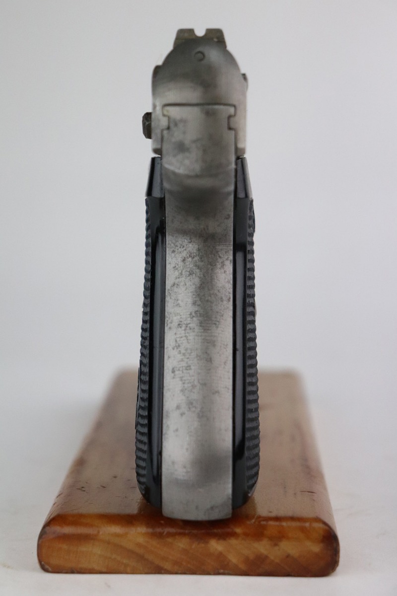 8/2/21 – This is a nice example of a Sauer 38h issued to the Nazi military during WW2. It is all matching and has the proper “Eagle 37” military proof. The interesting thing about this gun is the lack of finish. From the serial number, this is not an end-of-war gun and there is no evidence the finish was removed. So we believe this gun was never finished, for whatever reason. That remains a mystery. In any case, there is spotty oxidation and tiny pin-pricking throughout. Comes with excellent grips and a period-correct magazine. Mint bore.