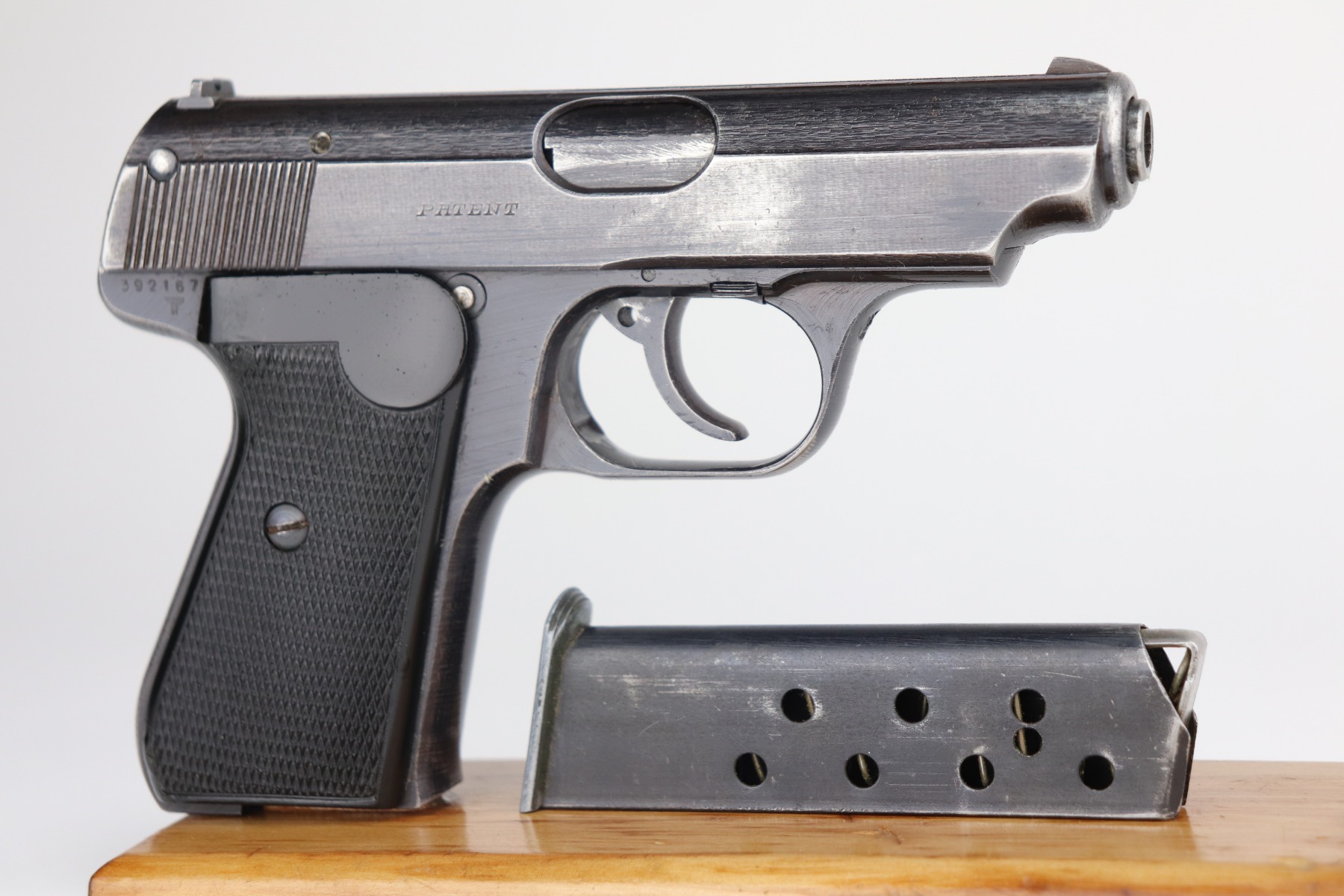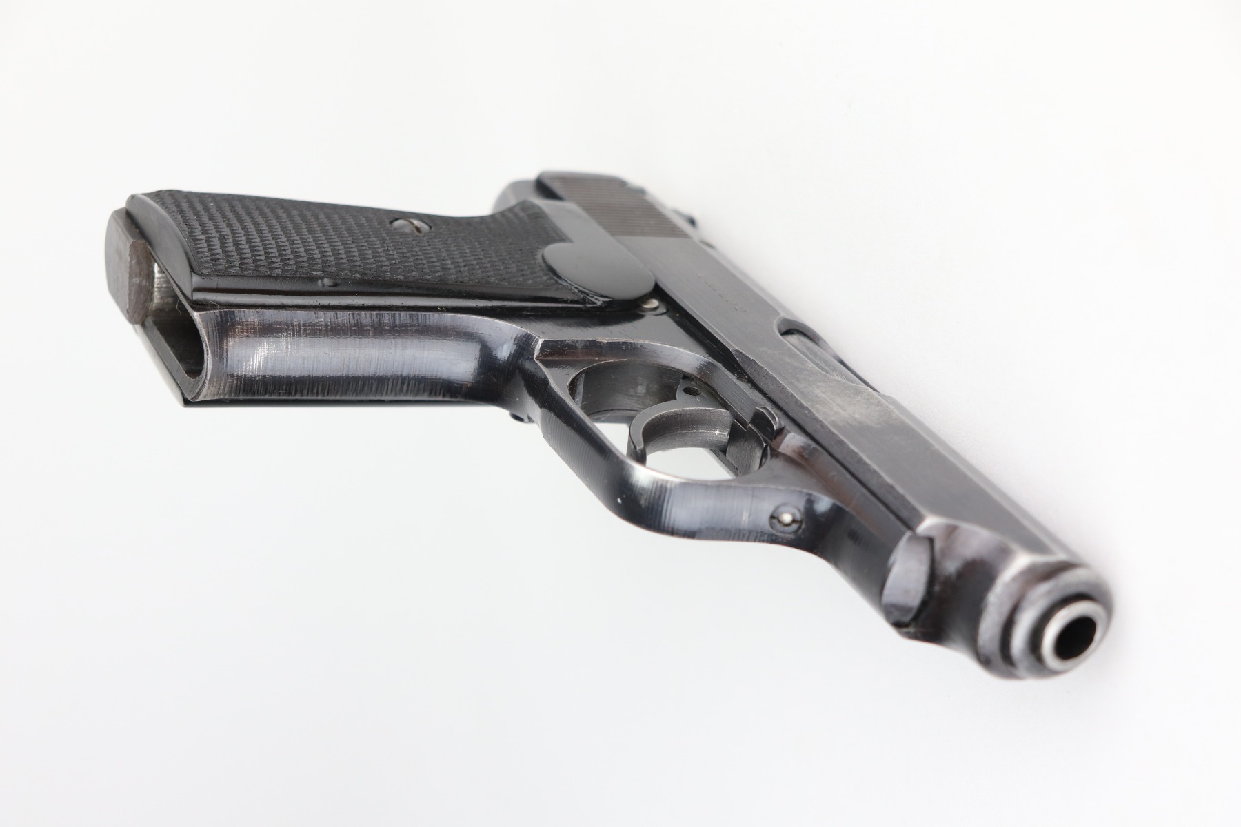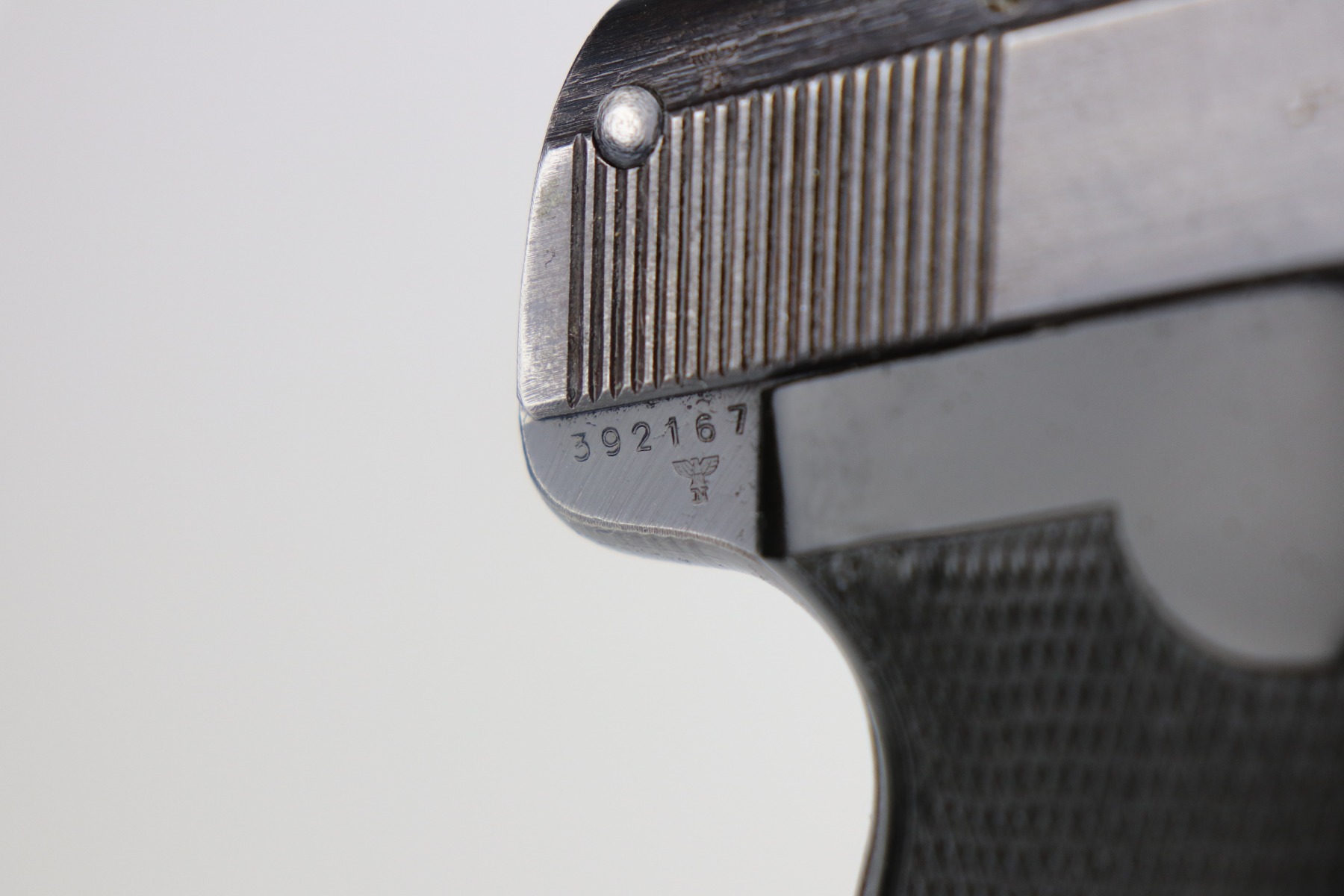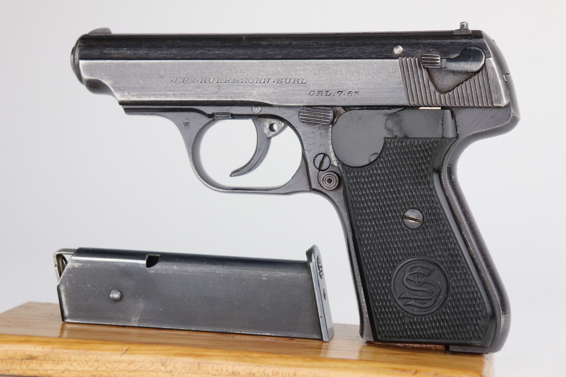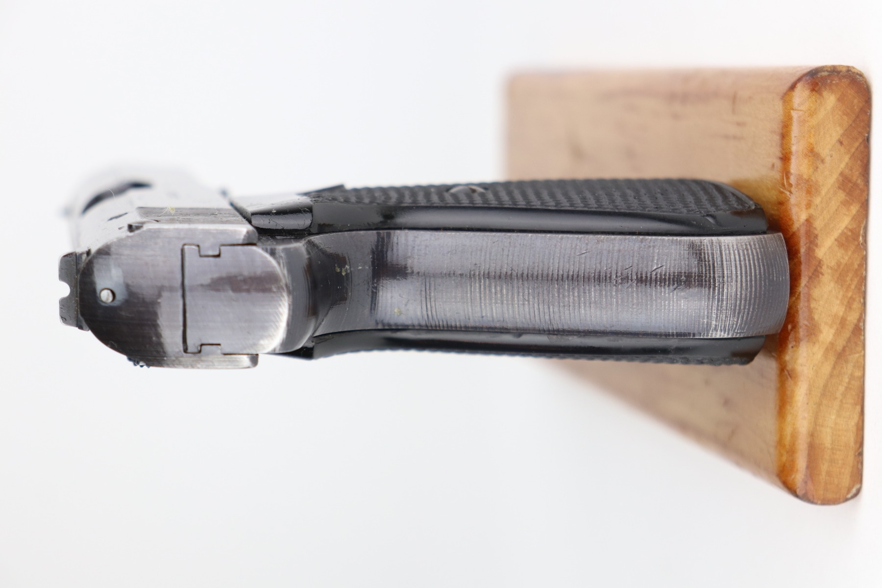 4/28/21 – This is a nice example of a Sauer 38h Rig issued to the Nazi military during WW2. The gun is matching and has the proper “Eagle 37” military proof. The rig comes with an unmarked holster and a proper wartime magazine. The gun has retained roughly 75% of its original finish. There is minor wear on the high edges in general and spotty wear throughout, concentrated on the slide and straps. There is an area of wear on the right side of the slide. Comes with excellent grips. The bore is excellent – shiny with strong rifling.