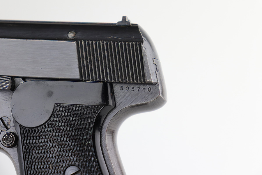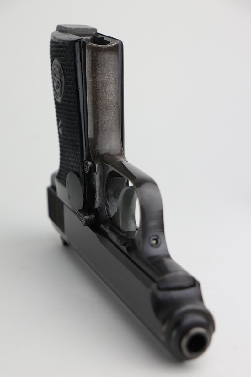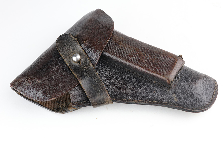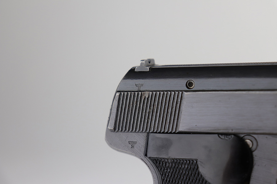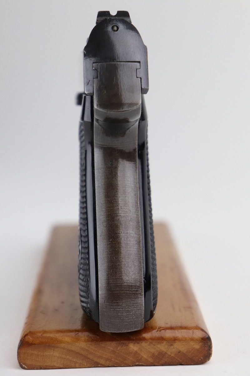 8/18/21 – This is a very nice example of a Sauer 38h rig issued to the Nazi military during WW2. It is all matching and has the proper “Eagle 37” military proof. It comes with an un-marked period-correct Ersatz holster and two proper magazines. It has excellent black bakelite grips. It has retained about 90% of its original finish. The profile views are minty, as most of the finish loss is on the straps, where there is also some light brown patina. A few very light scratches on the top of the slide and a few small dings on the right slide serrations. Mint bore.
