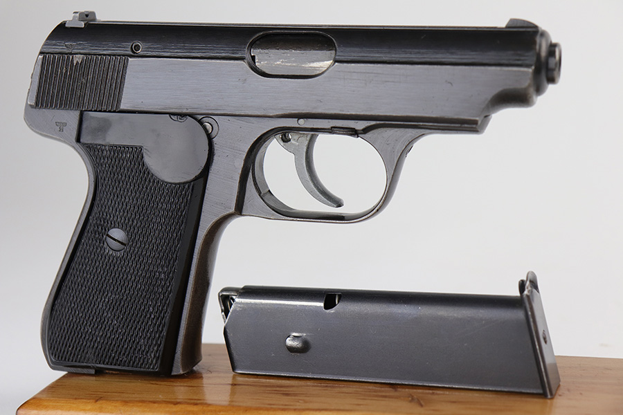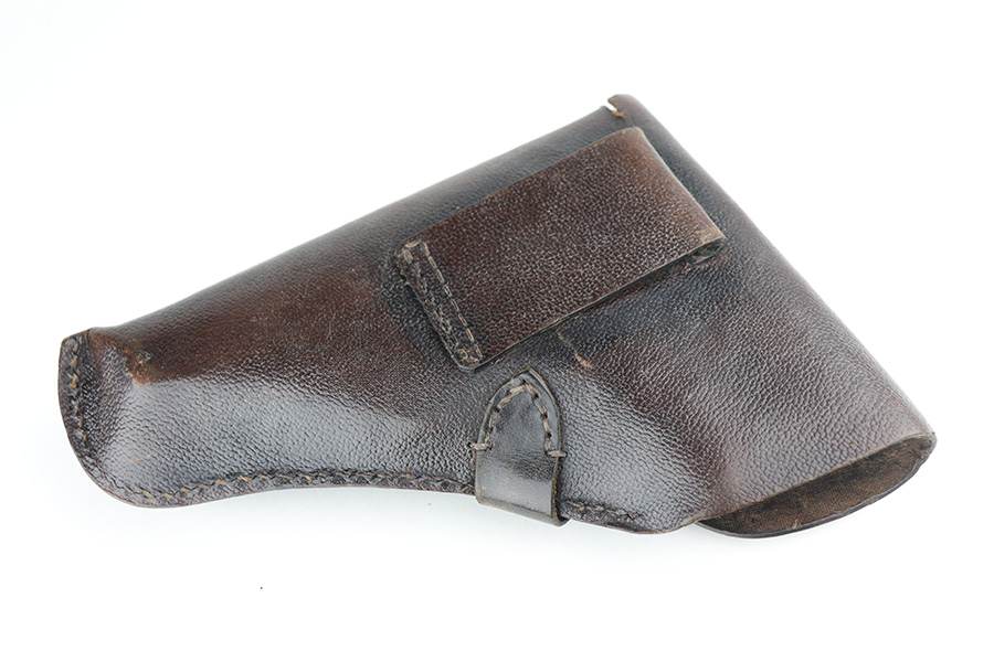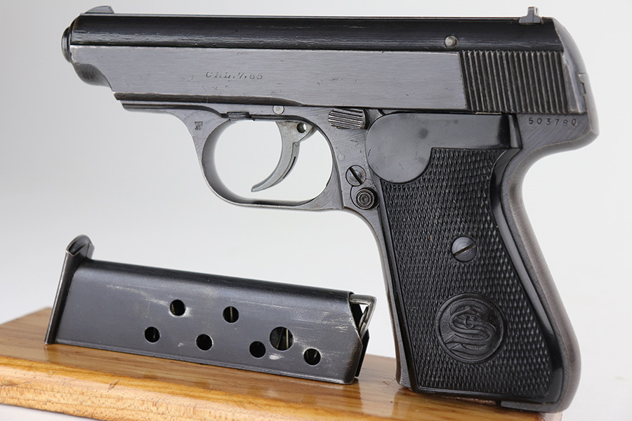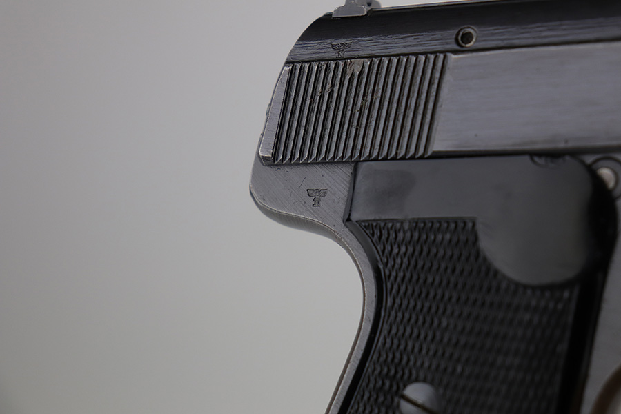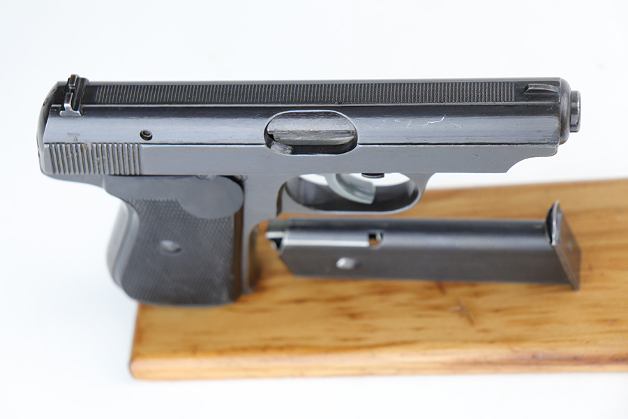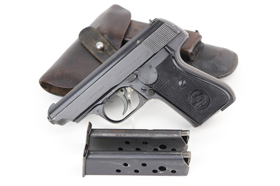 8/18/21 – This is a very nice example of a Sauer 38h rig issued to the Nazi military during WW2. It is all matching and has the proper “Eagle 37” military proof. It comes with an un-marked period-correct Ersatz holster and two proper magazines. It has excellent black bakelite grips. It has retained about 90% of its original finish. The profile views are minty, as most of the finish loss is on the straps, where there is also some light brown patina. A few very light scratches on the top of the slide and a few small dings on the right slide serrations. Mint bore.