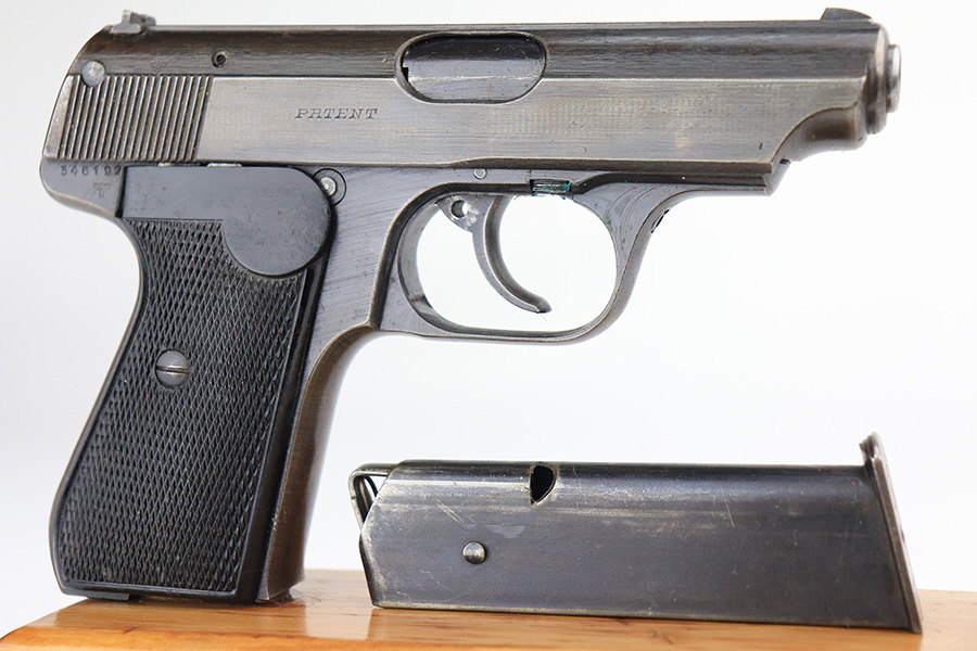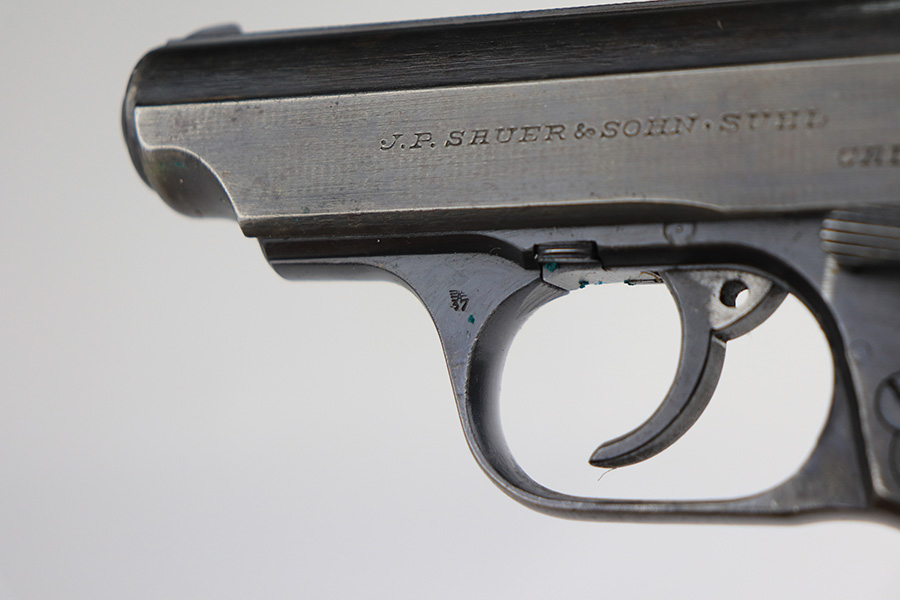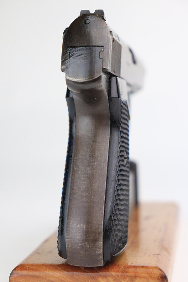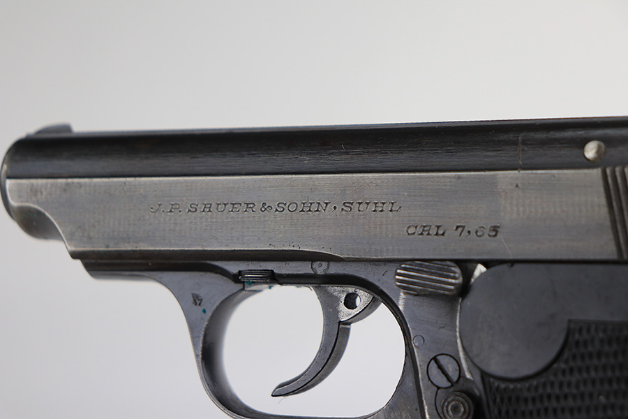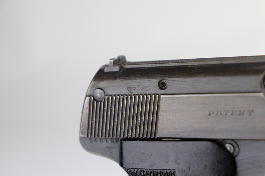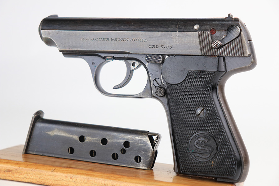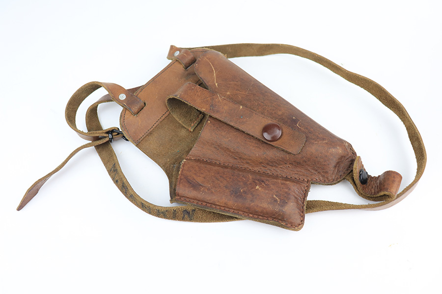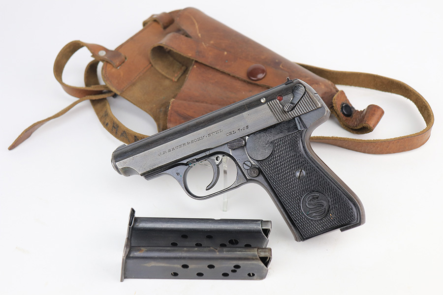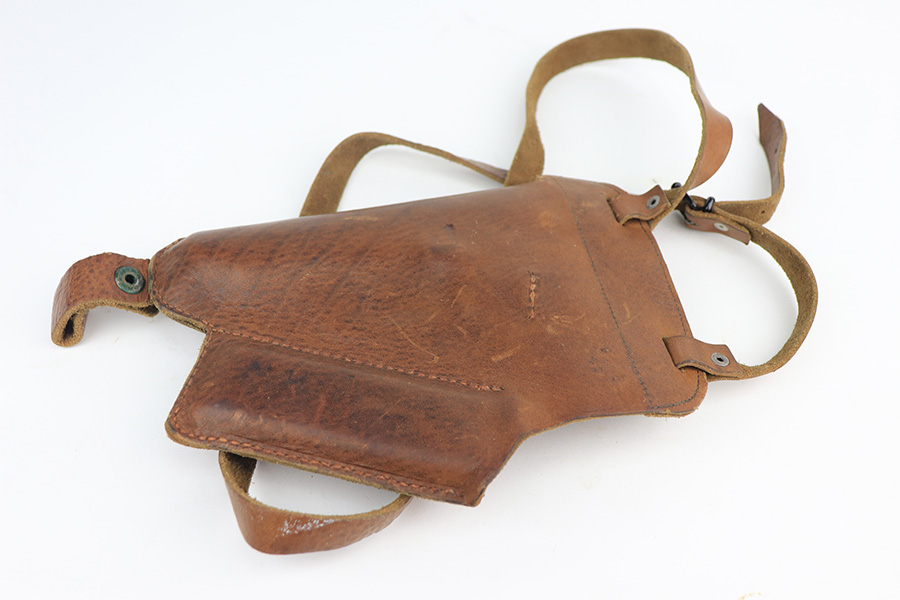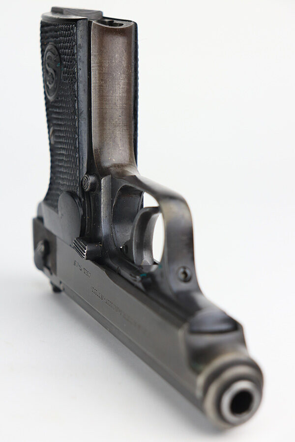 1/13/22 – This is a very nice example of a Sauer 38h issued to the Nazi military during WW2. It is all matching and has the proper “Eagle 37” Nazi military acceptance proof on the left side of the trigger guard. It comes as a rig with a scarce tan leather shoulder holster and two period-correct magazines. The gun has retained about 90% of its original finish. There is minor thinning on both sides of the slide and on the grip straps. Very light brown patina on the slide and more noticeable patina on the grip straps. A couple of scratches on the left side of the slide. Comes with period-correct black bakelite grips. The bore is mint.