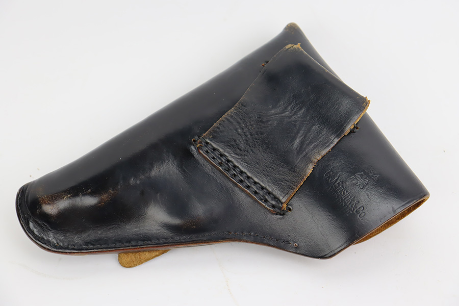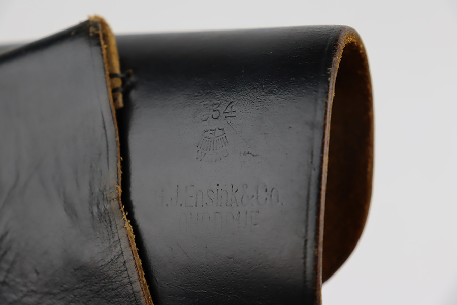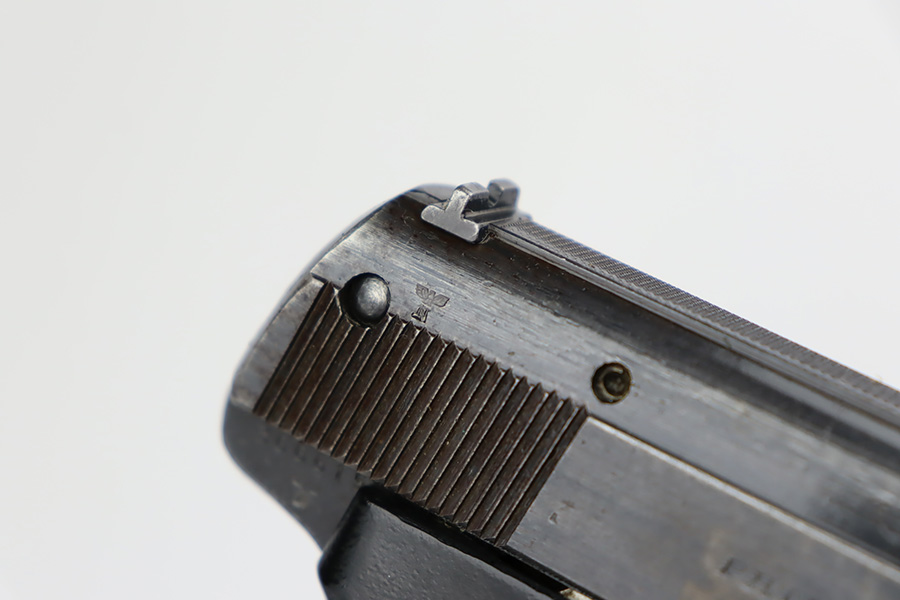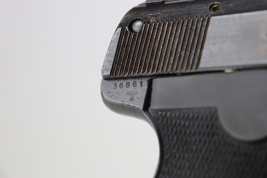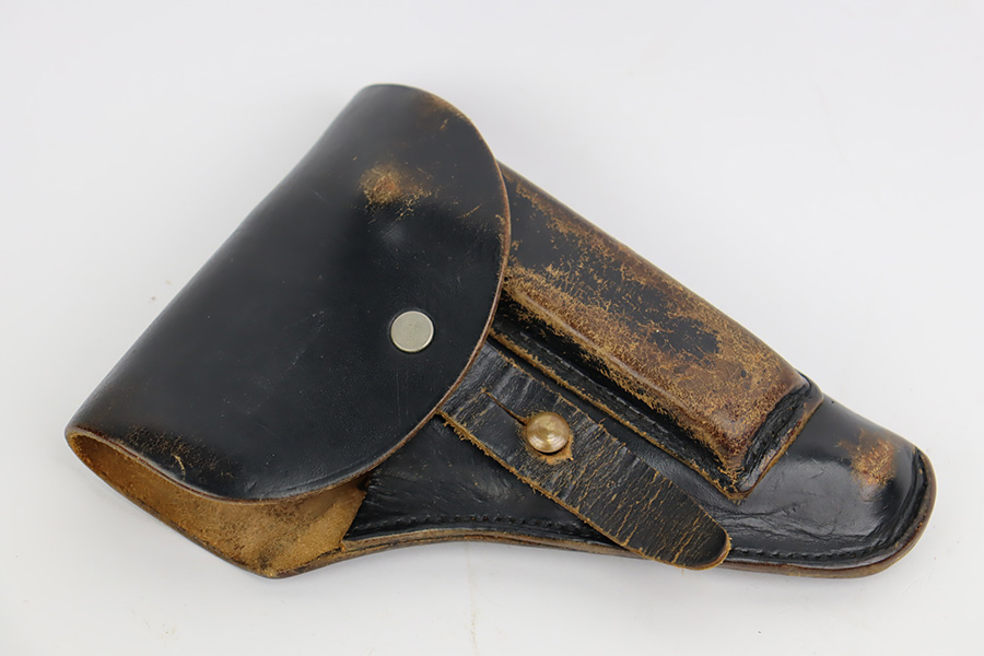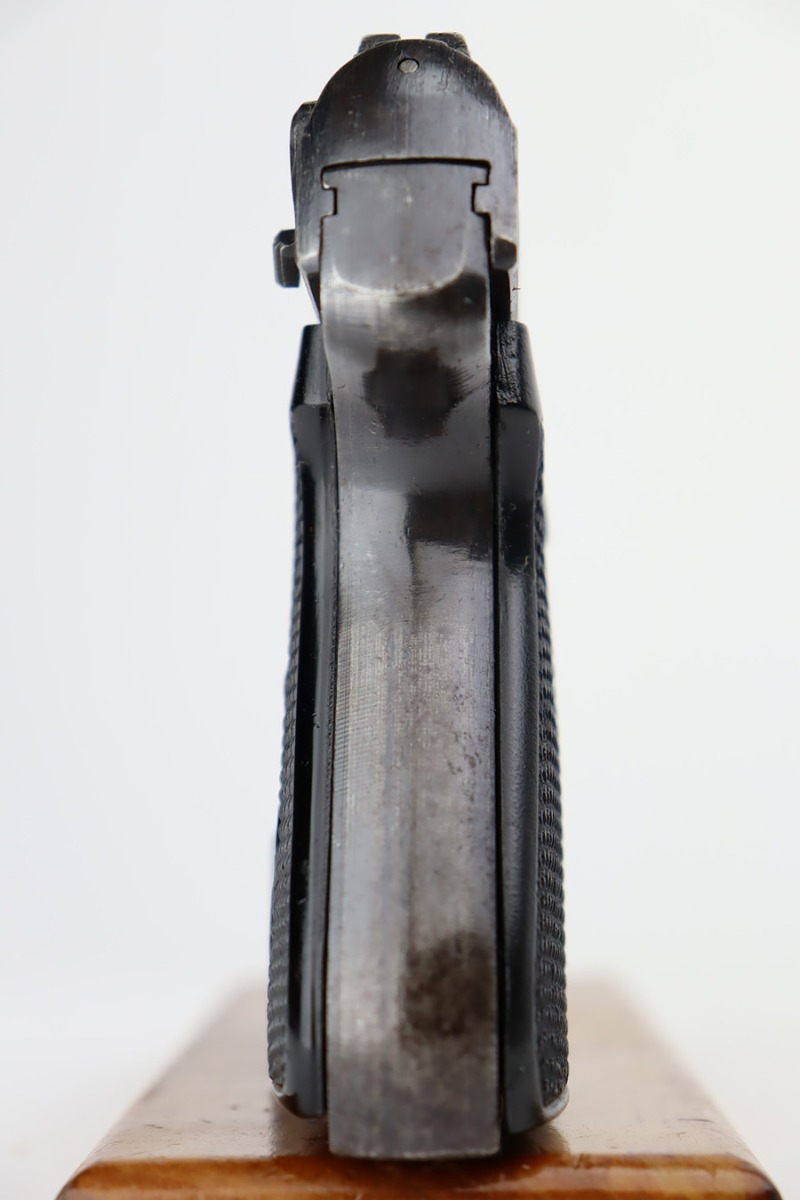 9/18/23 – This is a nice example of a Sauer 38h issued to the Nazi military during WW2. It is all matching and has the proper “Eagle 37” military acceptance proof on the left side of the trigger guard. It comes as a rig with a black leather holster, one post-war magazine, and one period-correct nickel-plated magazine (missing a piece of the base). The gun itself has retained roughly 80% of its original finish. The majority of the wear is on the grip straps, but there is also high edge wear in general and spotty wear along the right side of the slide. Fitted with excellent black bakelite grips. Mint bore.