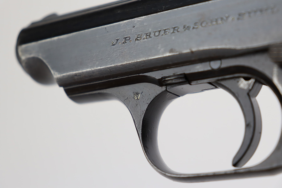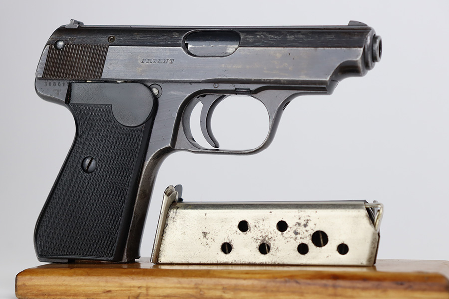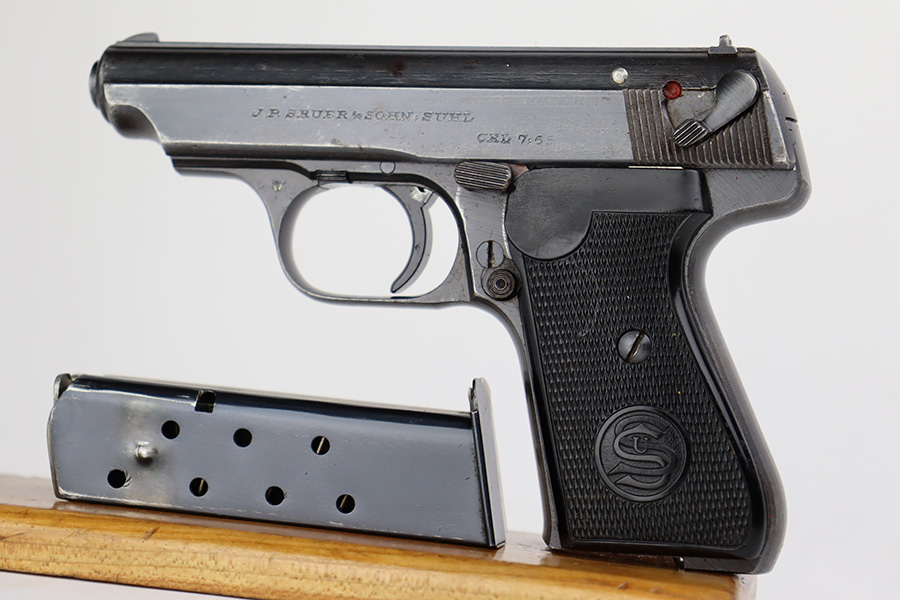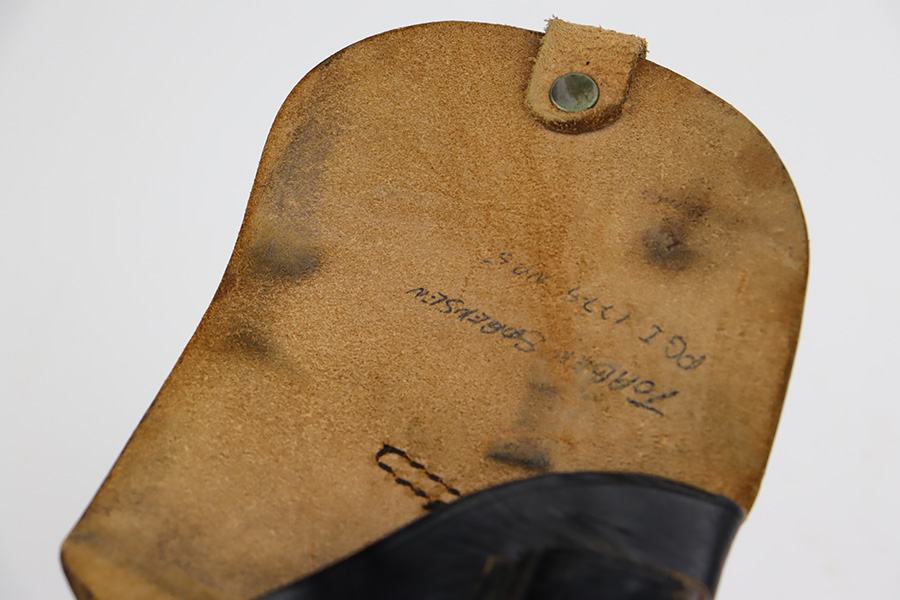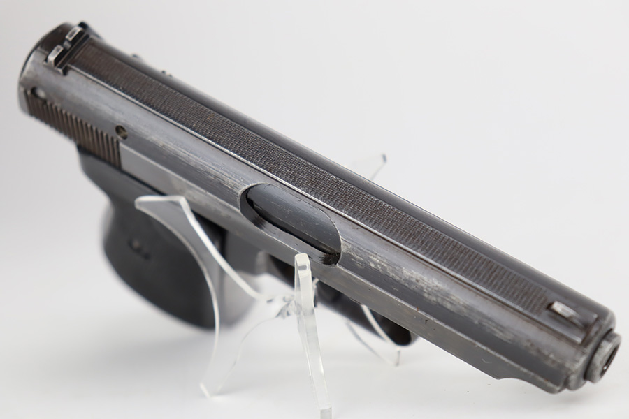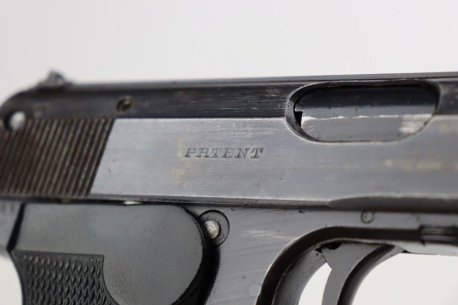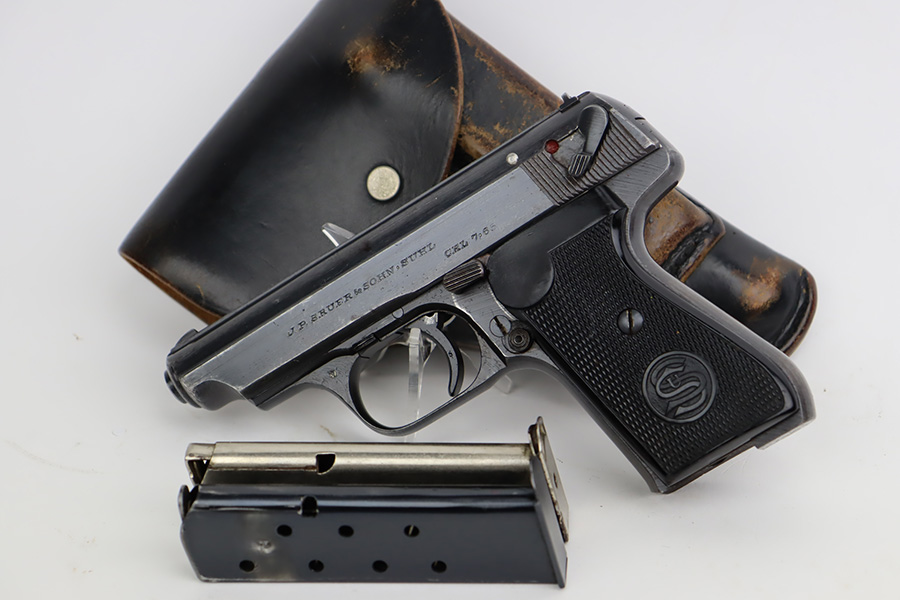9/18/23 – This is a nice example of a Sauer 38h issued to the Nazi military during WW2. It is all matching and has the proper “Eagle 37” military acceptance proof on the left side of the trigger guard. It comes as a rig with a black leather holster, one post-war magazine, and one period-correct nickel-plated magazine (missing a piece of the base). The gun itself has retained roughly 80% of its original finish. The majority of the wear is on the grip straps, but there is also high edge wear in general and spotty wear along the right side of the slide. Fitted with excellent black bakelite grips. Mint bore.