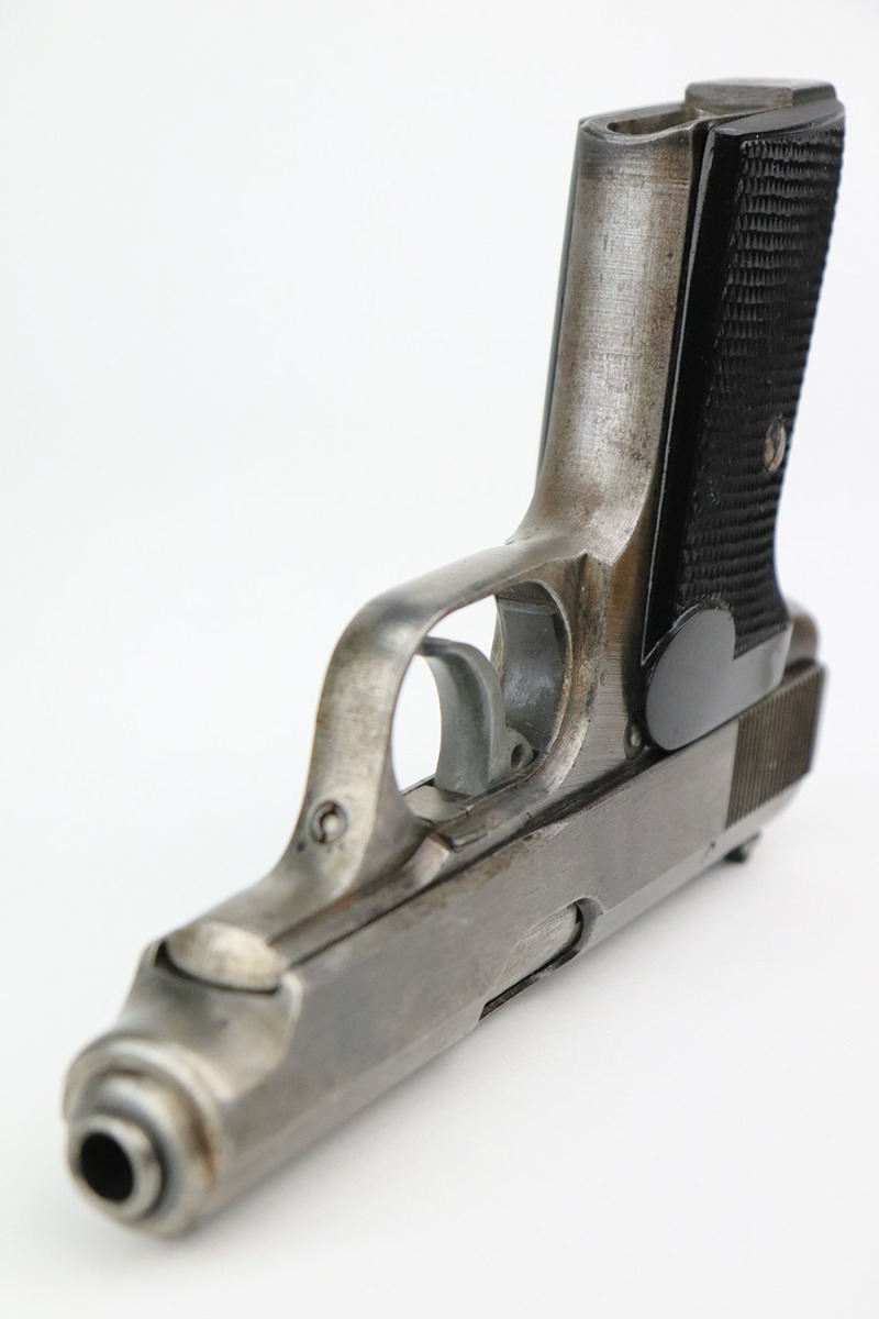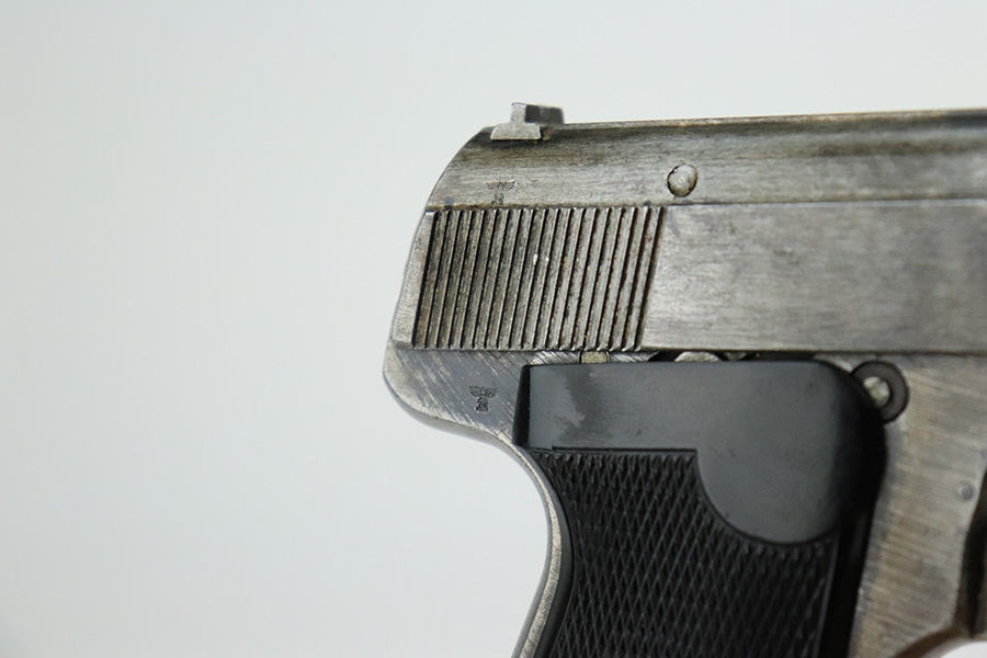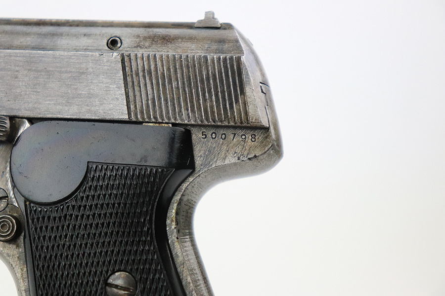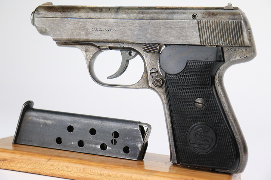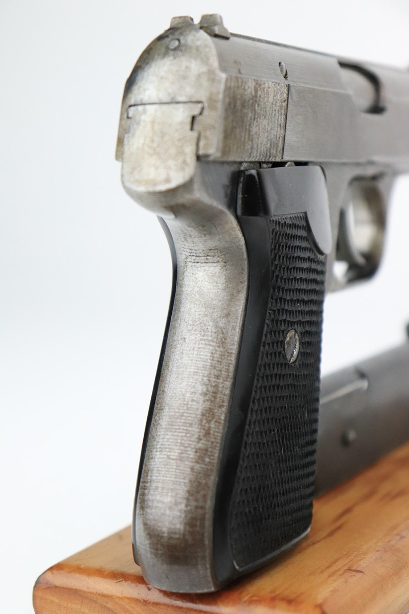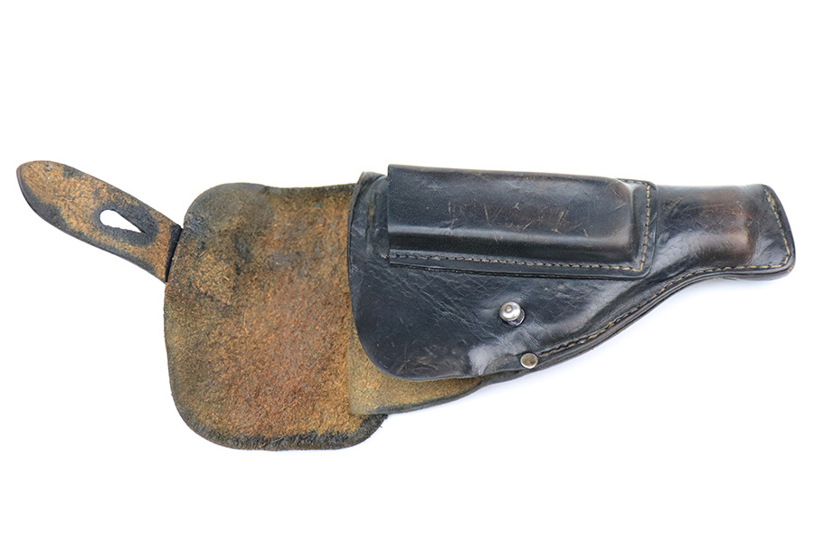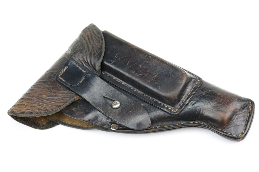 7/13/22 – This is a nice example of a Sauer 38h issued to the Nazi military during WW2. It is all matching and has the proper “Eagle 37” military acceptance proof on the left side of the trigger guard. It comes as a rig with a nice period-correct police-style holster and one proper magazine. It also comes with photocopies (not originals) of several WW2 capture documents. They have the name of the veteran who captured the gun as well as the gun’s matching serial number. The gun itself has lost virtually all of its original finish with spotty oxidation and splotchy discoloration throughout. Comes with excellent period-correct black bakelite grips. Minty bore.