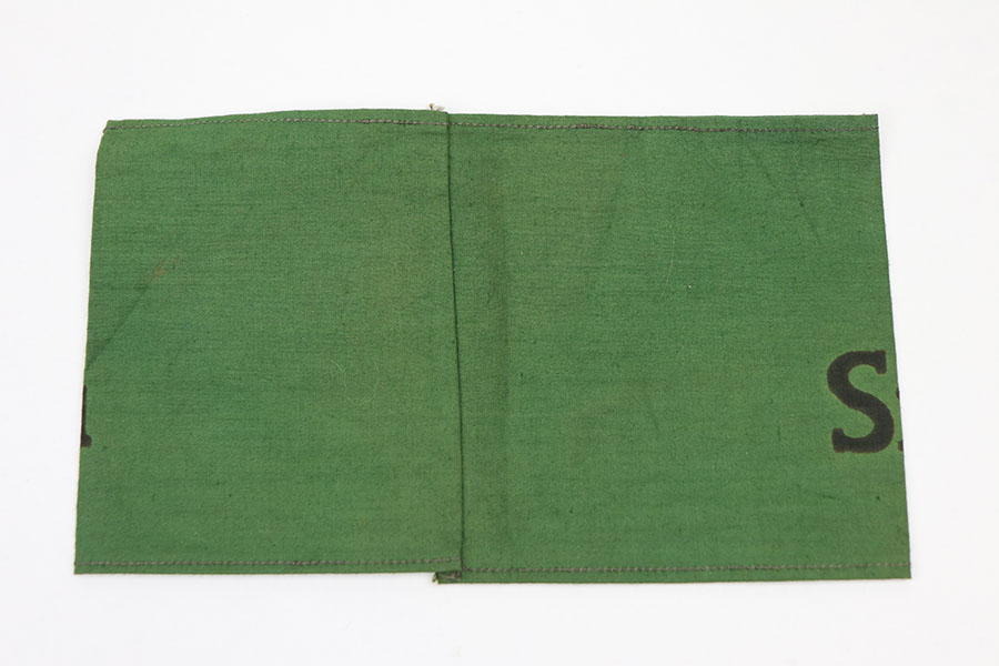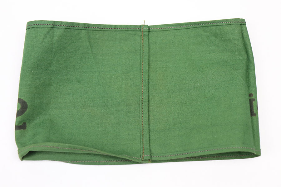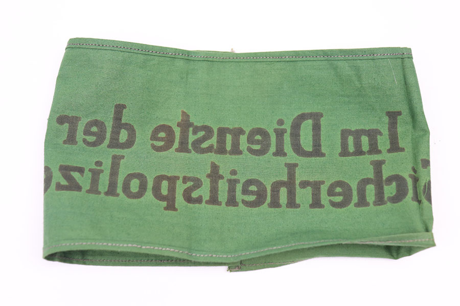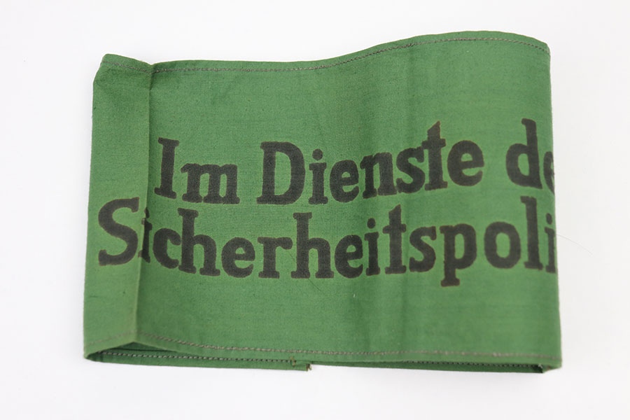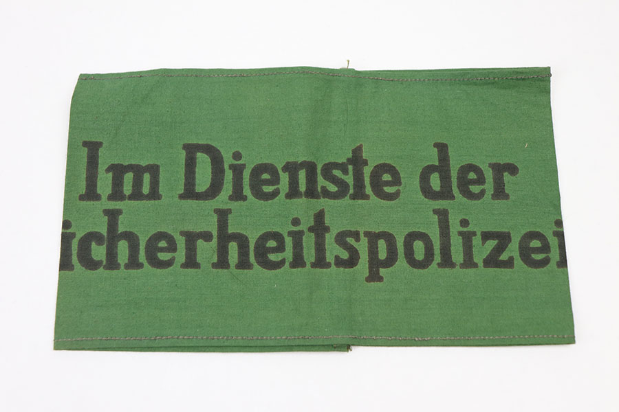 3/29/21 – This is a “Sicherheitspolizei” Armband from WW2. A scarce variation, it’s made of a thin green fabric, and has black printed lettering. The seam and edges of the armband have a thin line of tight stitching. It’s printed with the wording “Im Dienste Der Sicherheitspolizei” (In the Service of the Security Police). The Sicherheitspolizei (SiPo), formed of the combined Gestapo and Kriminalpolizei, was the state political and criminal investigation security apparatus during the Third Reich. We haven’t seen many of these, and aren’t experts but this does pass a black light test.