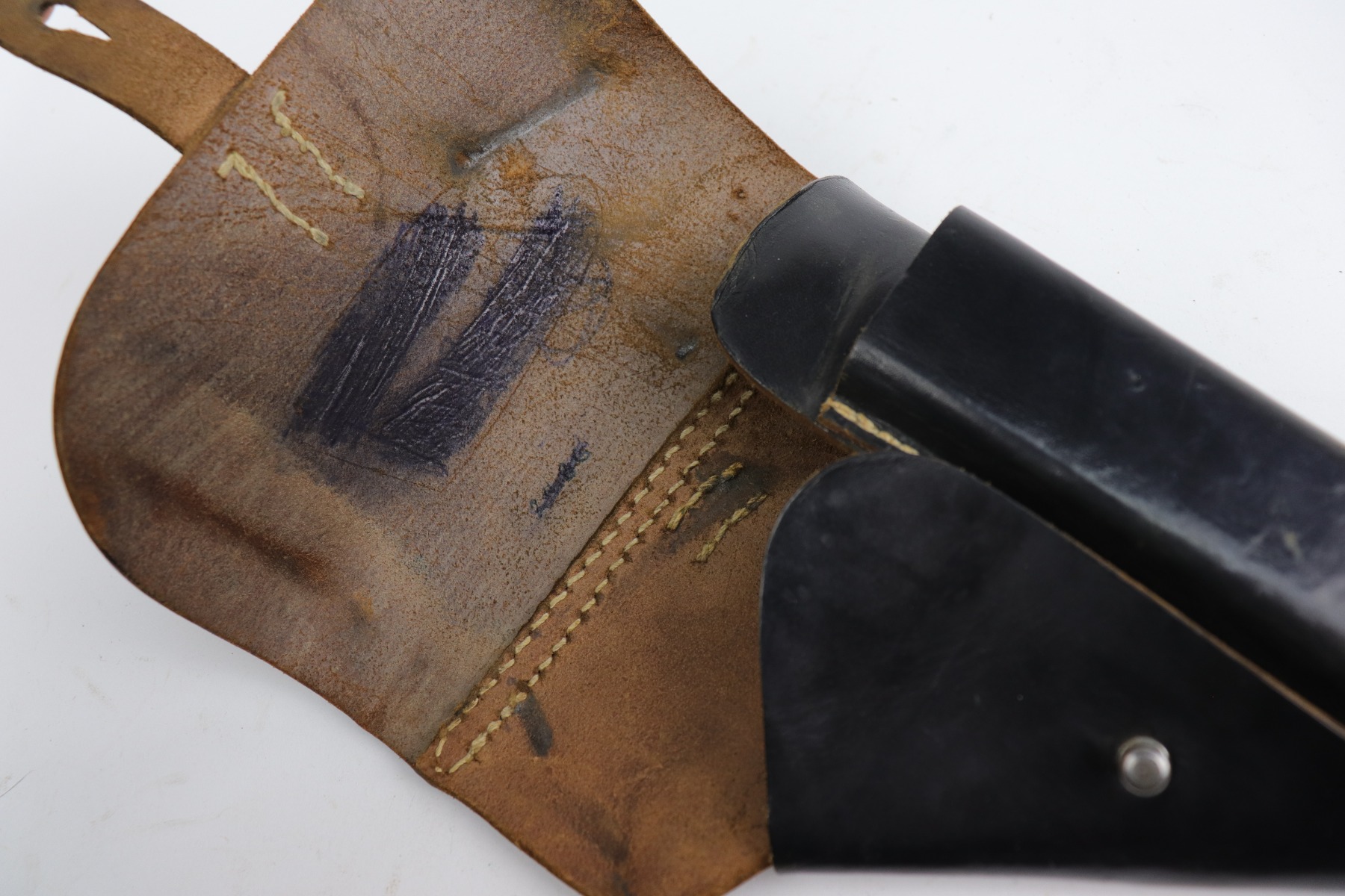 11/21/20 – This is a nice military issued softshell P.38 holster- dated 1943. The leather is soft and pliable, and the stitching is mostly intact. The maker is JOA. Closure strap is good. Detracting ink markings inside the flap. The belt loops on the back are tan in color, but this was a fairly common practice near the end of the war when materials were scarce. Waffen stamped on the back.