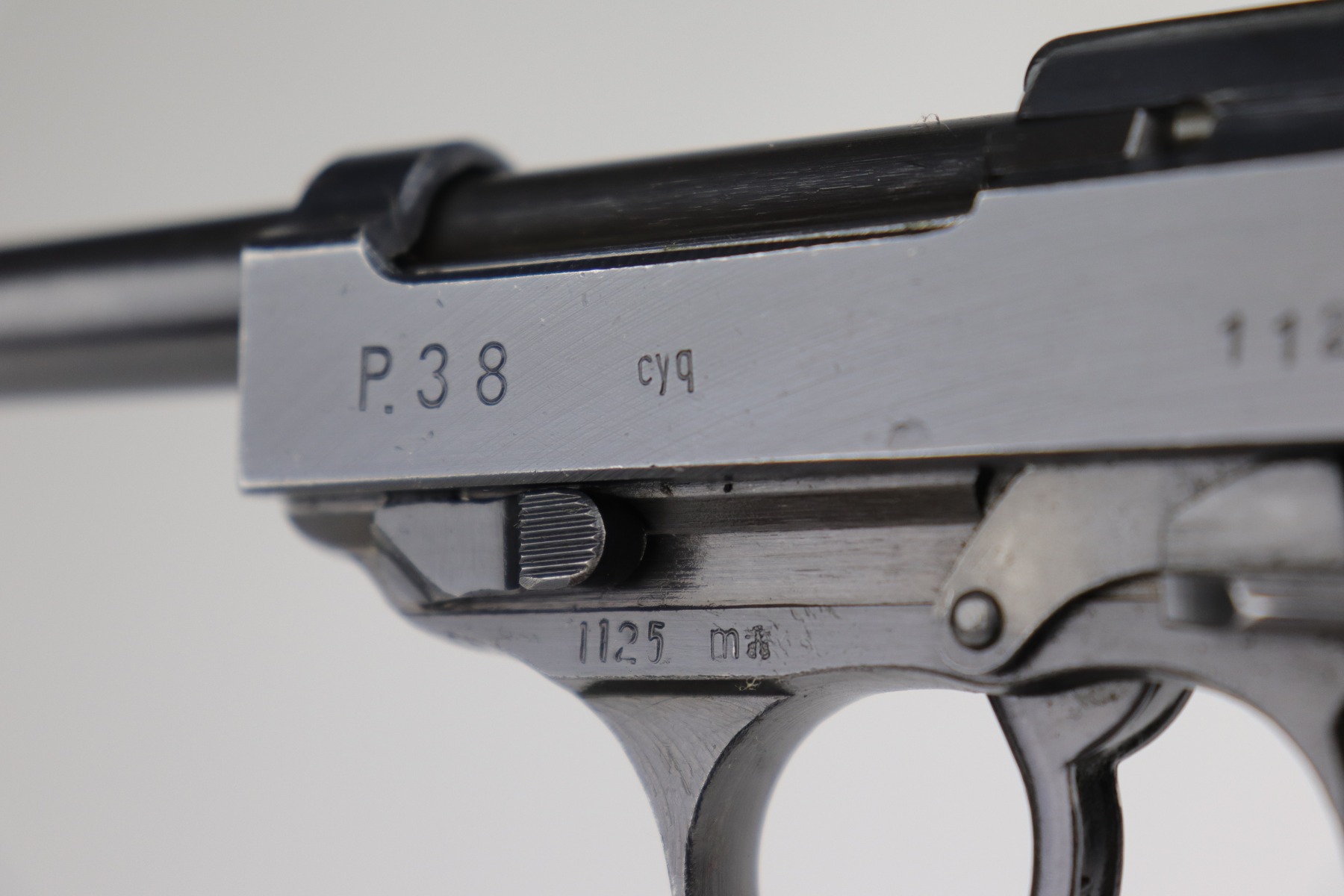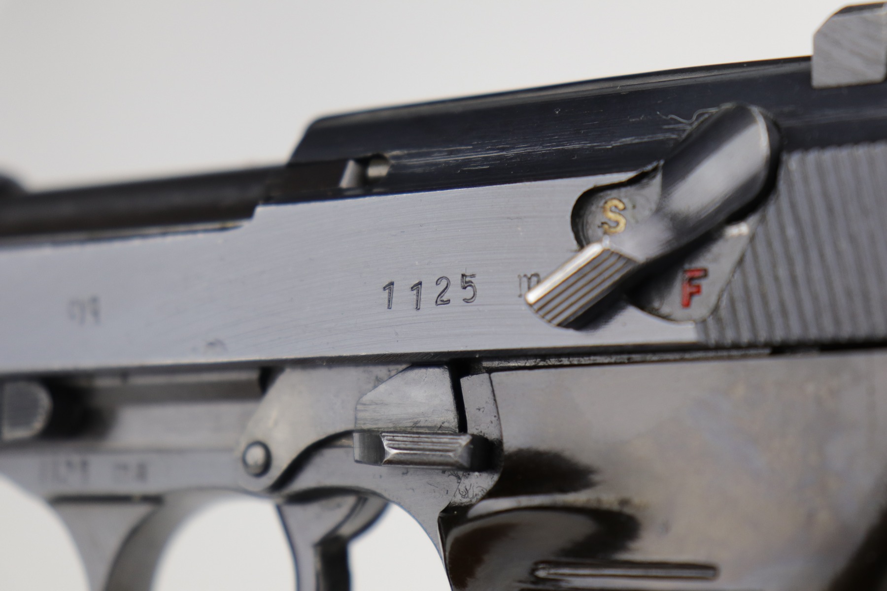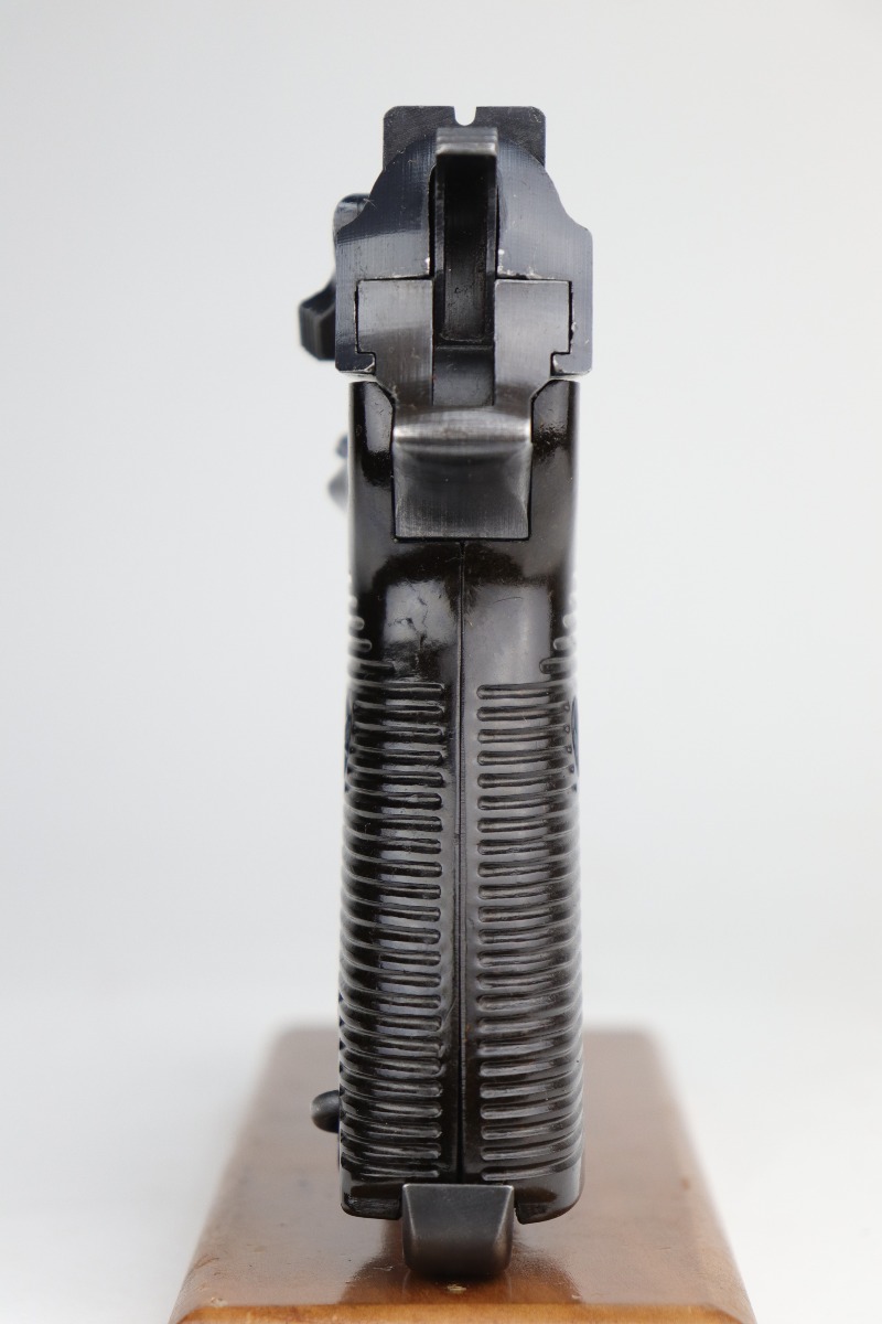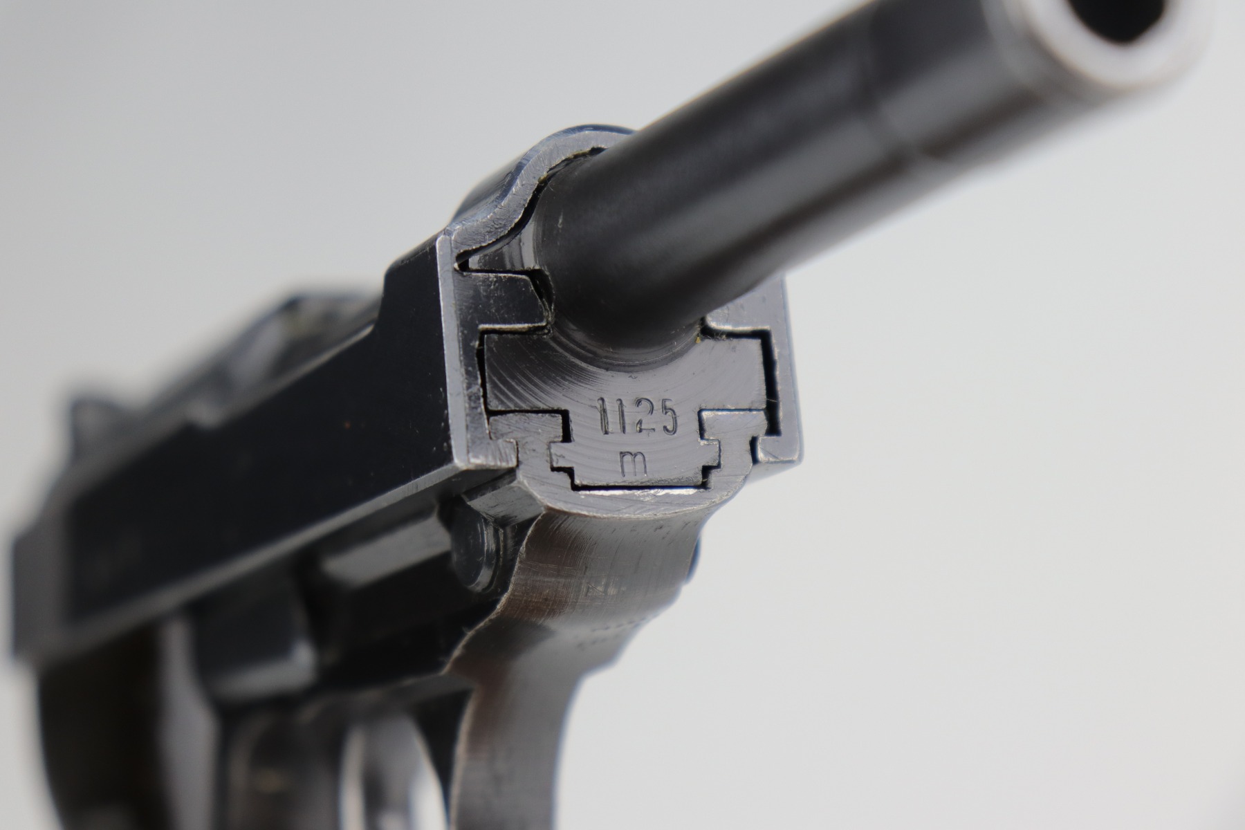 9/15/20 – This is a Spreewerk P.38 issued to the Nazi military in February of 1944. It is all matching and has the proper “Eagle 88” military acceptance proofs. This particular example has retained about 90% of its original finish. Most of the finish loss is on the front strap, but there are also a few very light scratches on the right side of the slide. The gun is fully functional, including the de-cocker. It has excellent grips and an excellent, period-correct magazine. The bore has decent rifling, but there is very light freckling in the grooves.