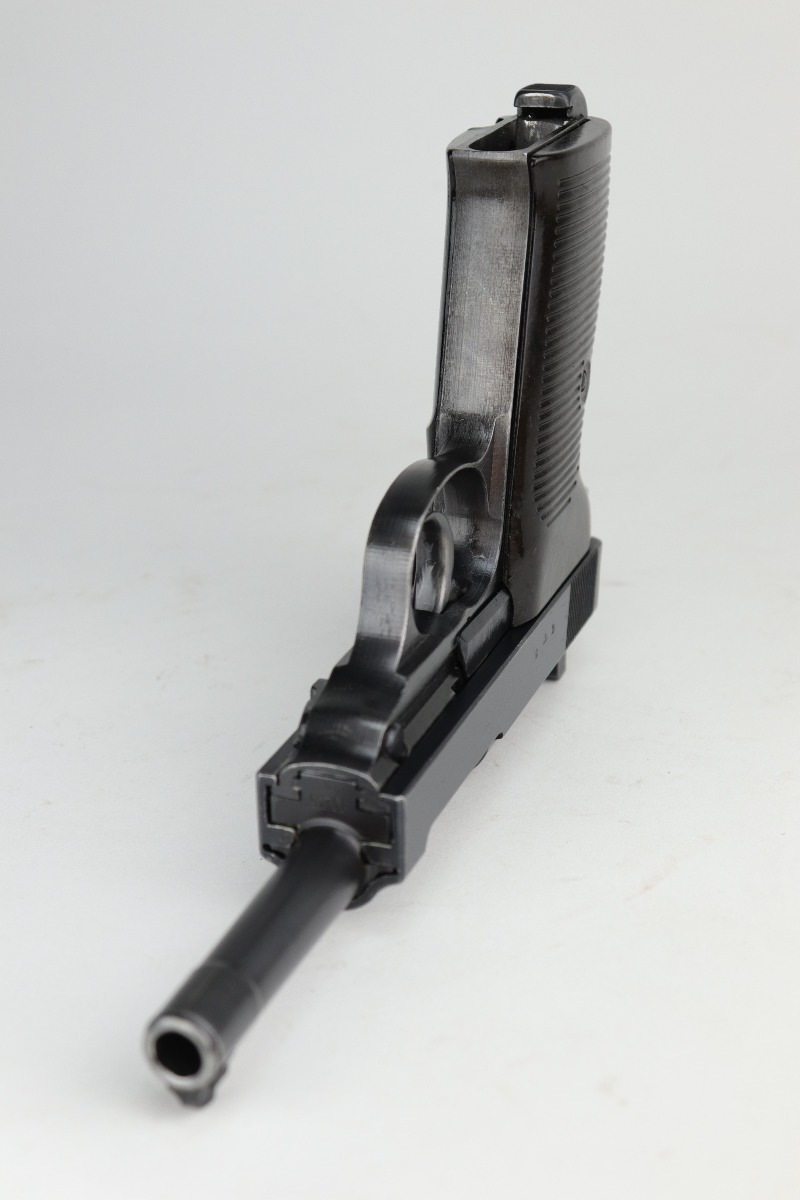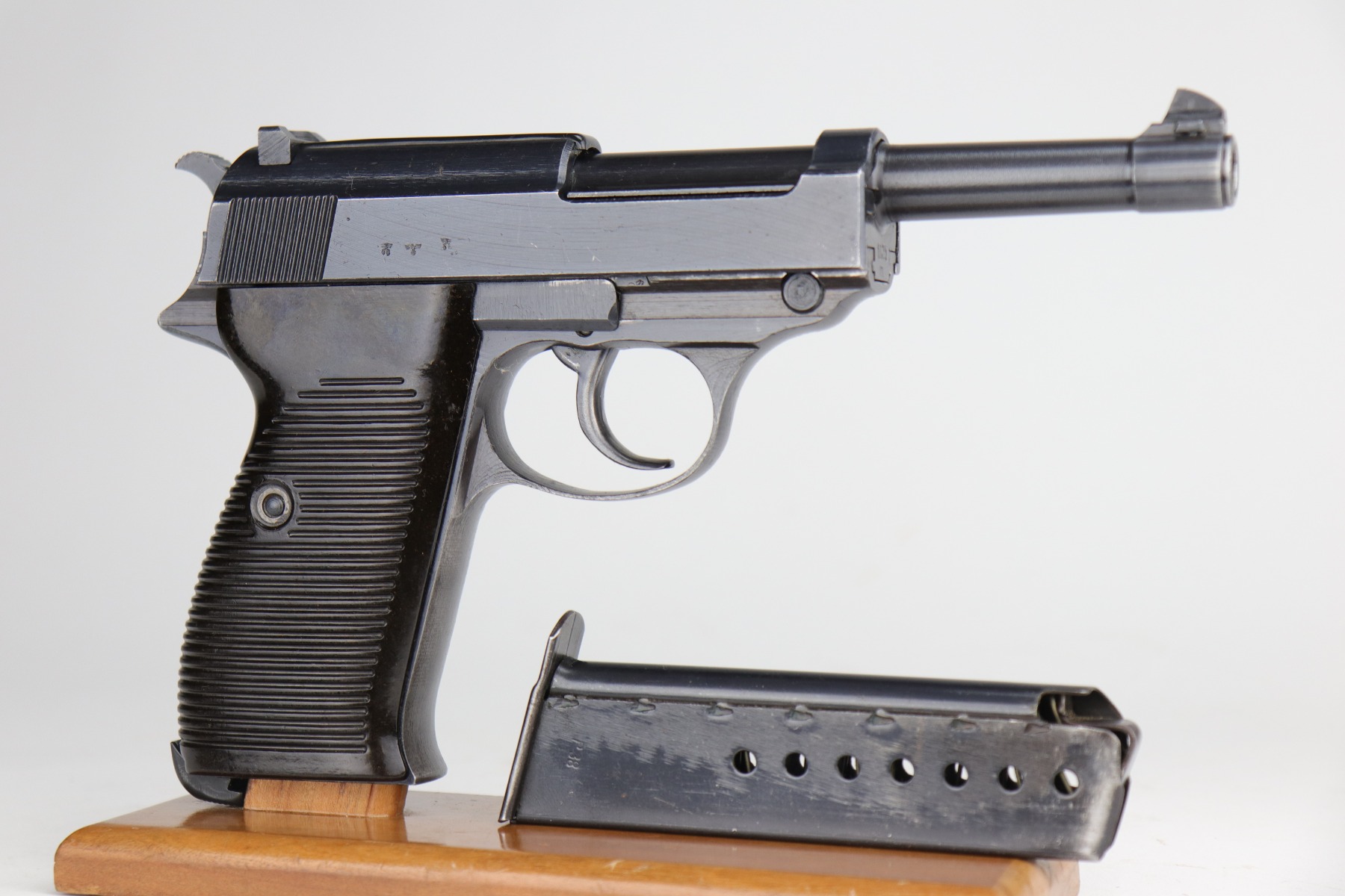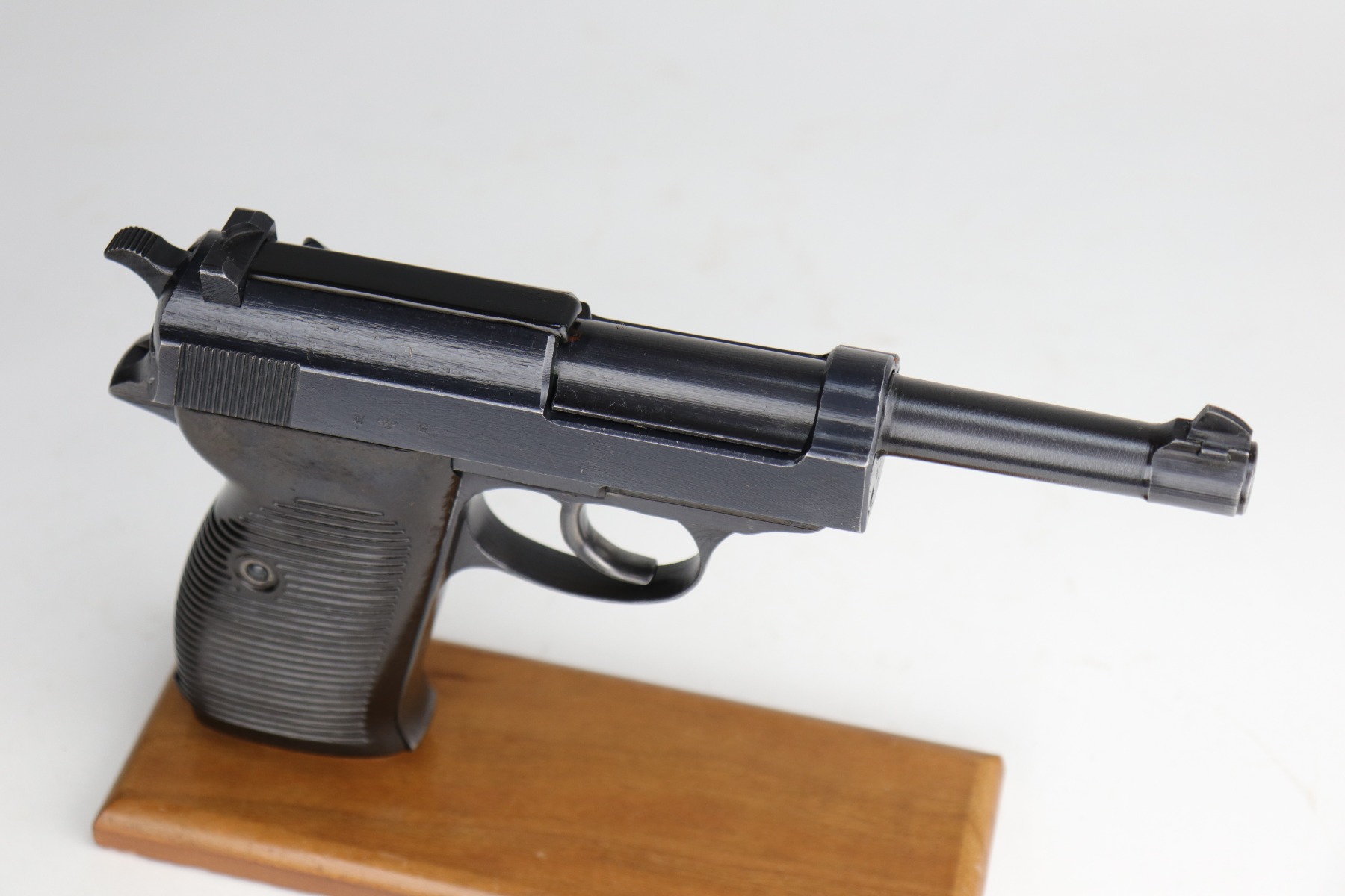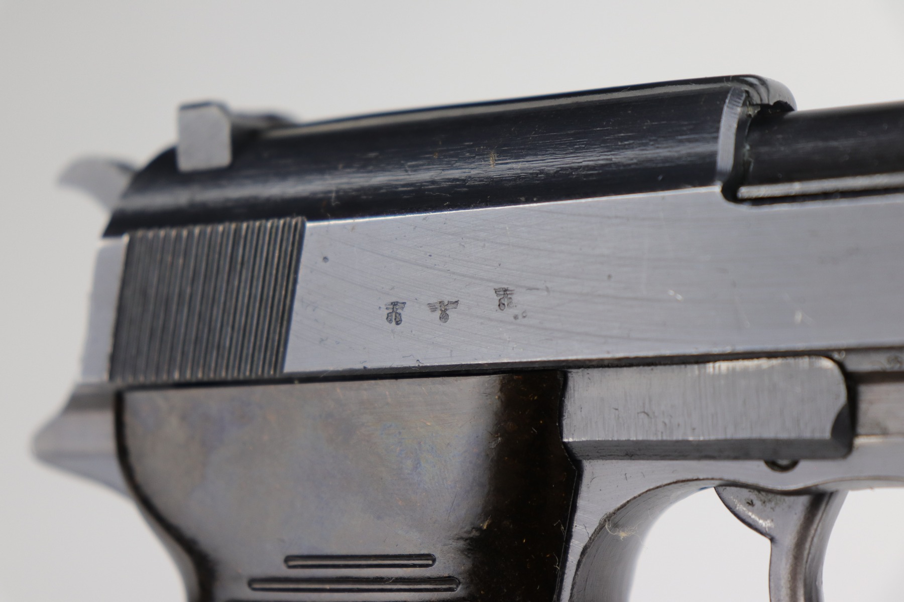 9/15/20 – This is a Spreewerk P.38 issued to the Nazi military in February of 1944. It is all matching and has the proper “Eagle 88” military acceptance proofs. This particular example has retained about 90% of its original finish. Most of the finish loss is on the front strap, but there are also a few very light scratches on the right side of the slide. The gun is fully functional, including the de-cocker. It has excellent grips and an excellent, period-correct magazine. The bore has decent rifling, but there is very light freckling in the grooves.