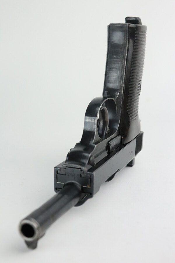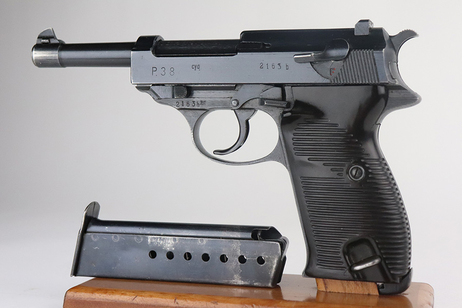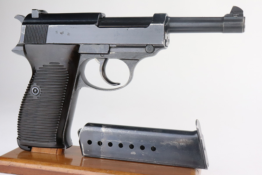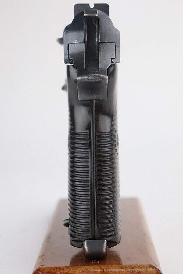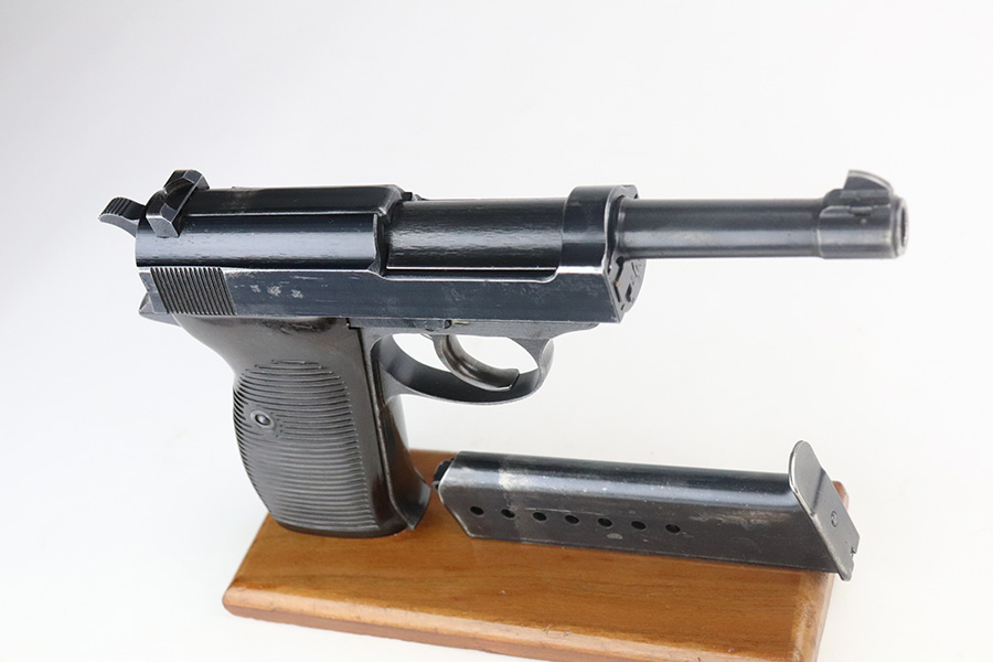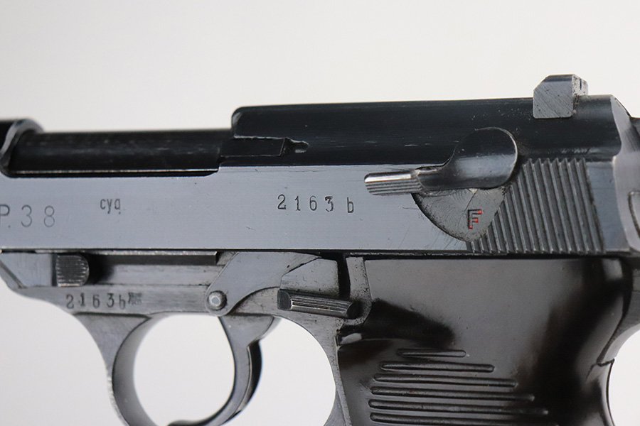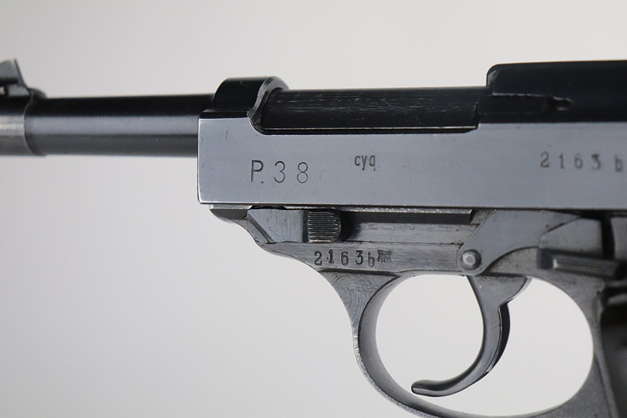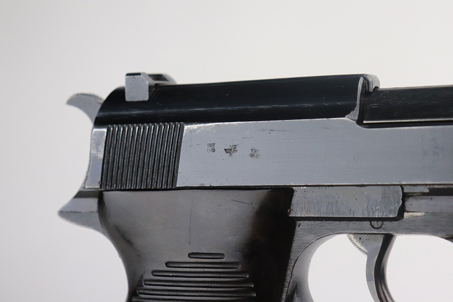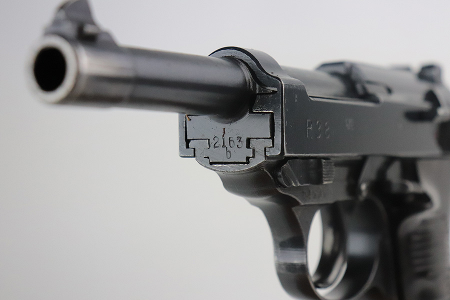 7/8/24 – This is an excellent example of a Spreewerk P.38 issued to the Nazi military in April of 1943. The gun is all matching and has the proper “Eagle 88” military proofs. The gun has retained about 96-97% of its original finish. There is very minor thinning on the front strap, and minor wear on the front edges of the slide, around the muzzle, on the top plate, and on the top of the barrel through the ejection port. Some light scratches along the slide. Comes with very nice grips. Mint bore. De-cocker is functional. Correct E/88 mag.