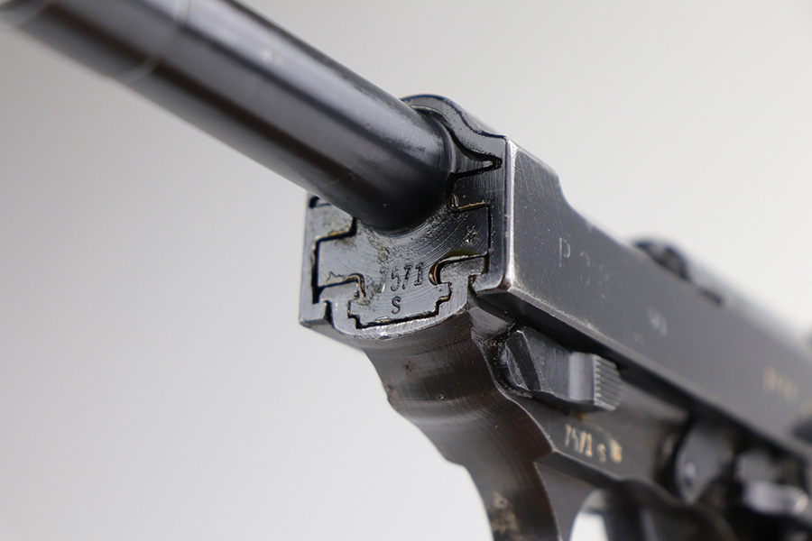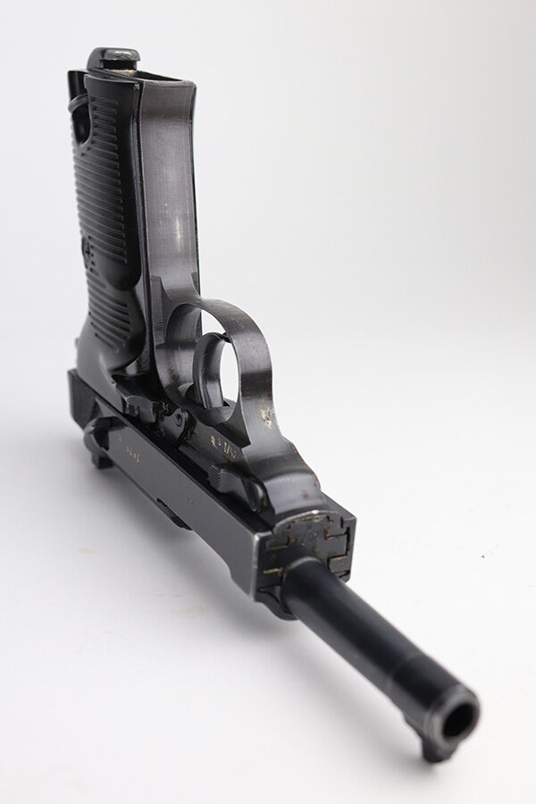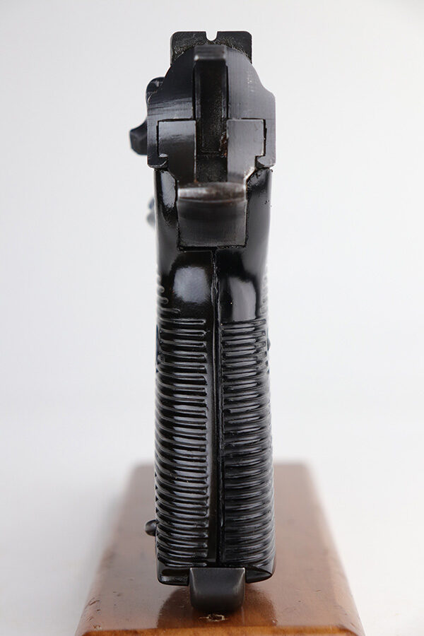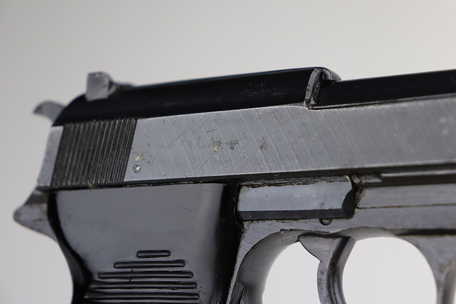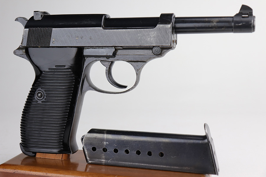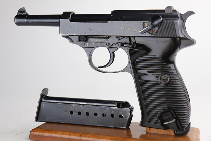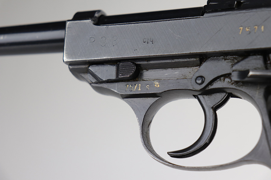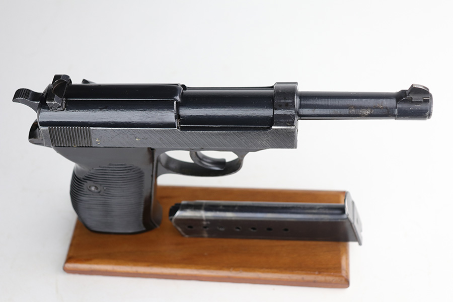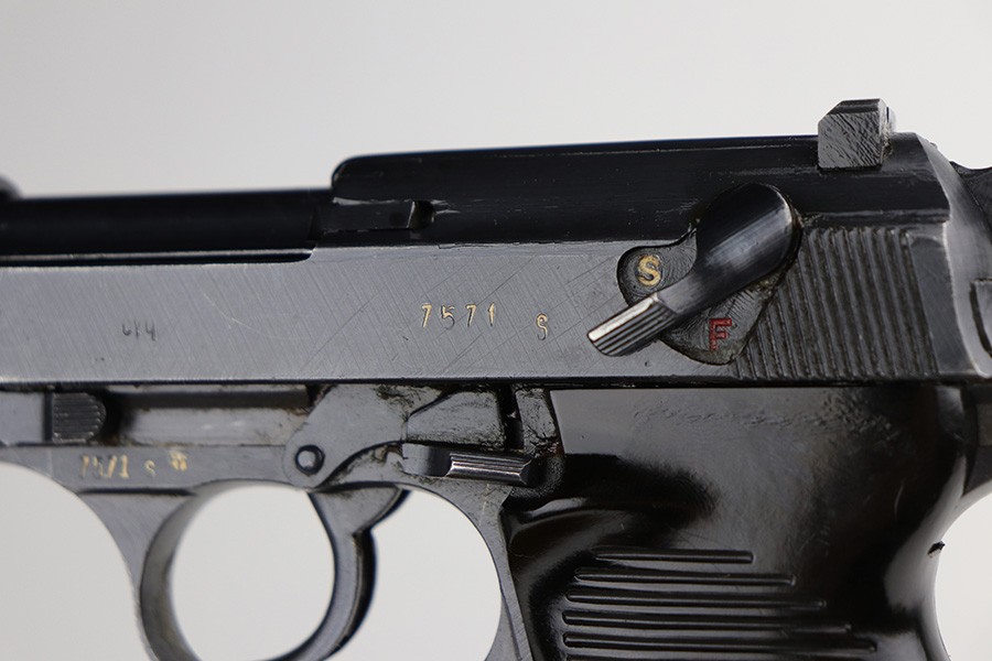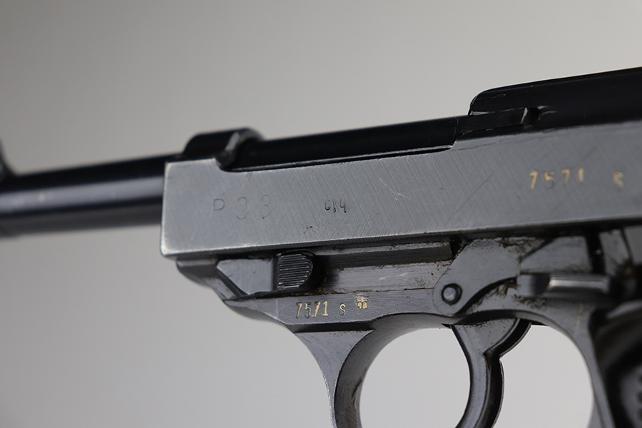 9/10/21 – This is an excellent example of a Spreewerk P.38 issued to the Nazi military in July of 1944. It is all matching and has the proper “Eagle 88” military proofs. There is an asterisk marking on the right side of the slide, indicating it failed initial inspection and was sent back to the factory for repair. The finish is a little dark, so we believe the gun has been “Russian dippped”. No “Russian X’s”. In any case, it has retained about 96% of its finish. There is minor wear on the front strap, on the front edges of the slide, and around the muzzle. There are small spots of discoloration and minor pitting on the barrel. Comes with excellent grips and an un-marked magazine. Mint bore. De-cocker is functional.