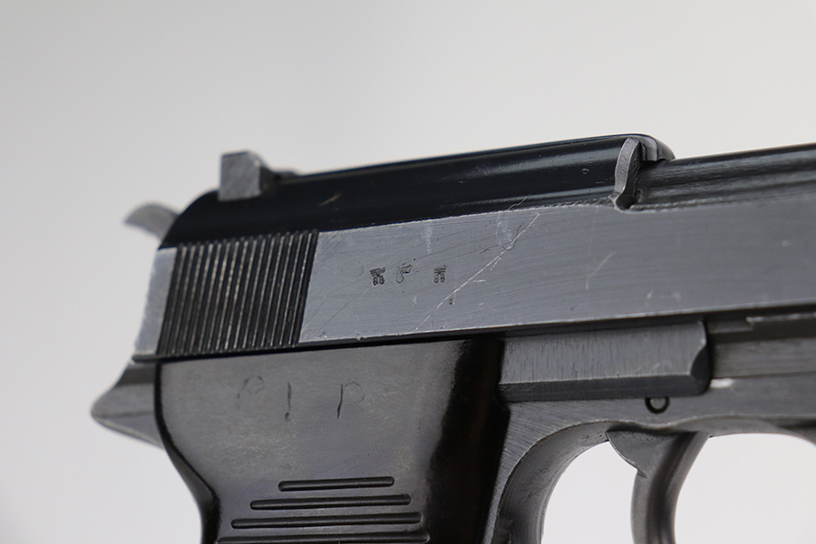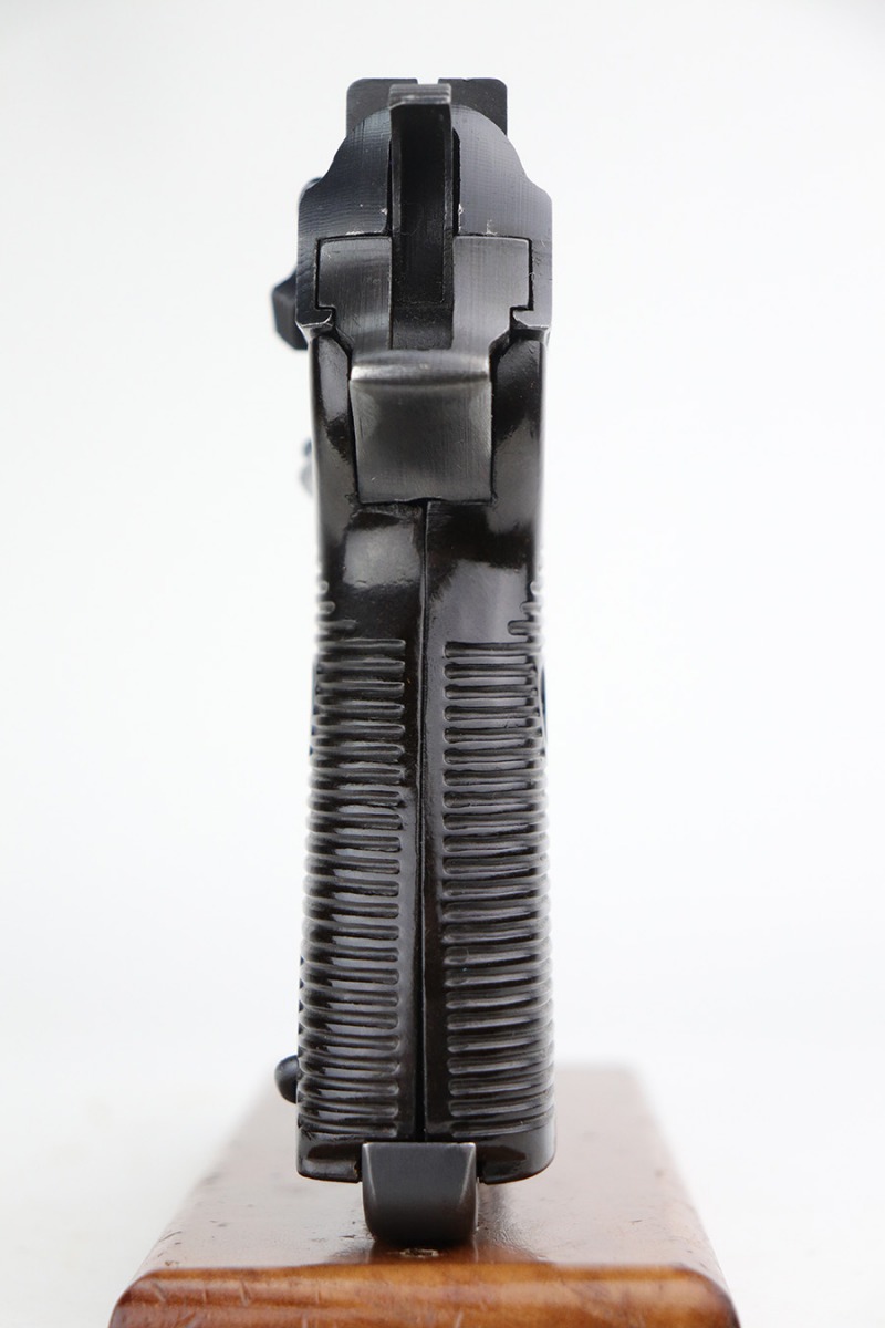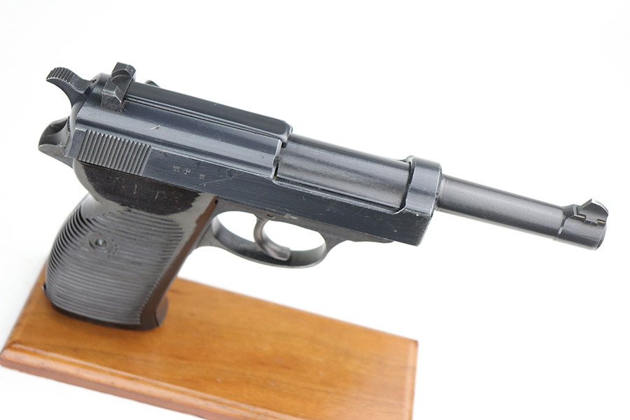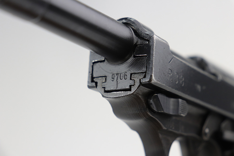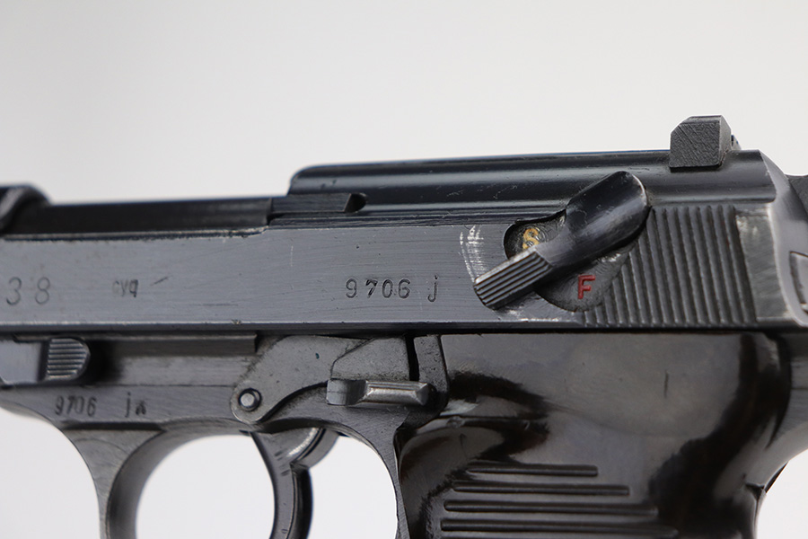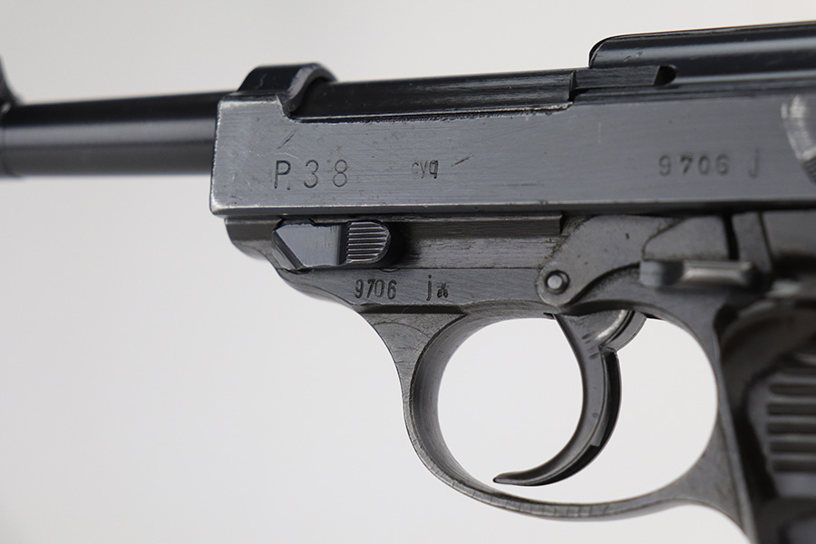 9/27/21 – This is a very nice example of a Spreewerk P.38 issued to the Nazi military in December of 1943. It is all matching and has the proper “Eagle 88” military acceptance proofs throughout. Most of the wear is on the front strap, but there is also wear at the very front edges of the slide and around the muzzle. There are light scratches and handling marks on both sides of the slide, especially on the right side. A mark on the left side of the slide from the safety lever. Comes with nice bakelite grips (looks like “PIP” scratched into the right panel) and a period-correct Walther magazine. The bore is mint. De-cocker is functional.
