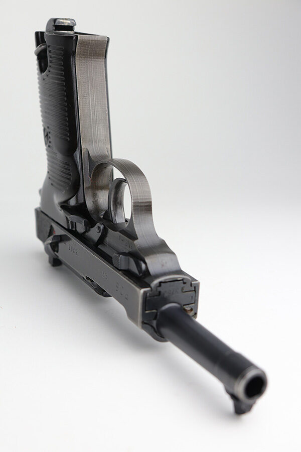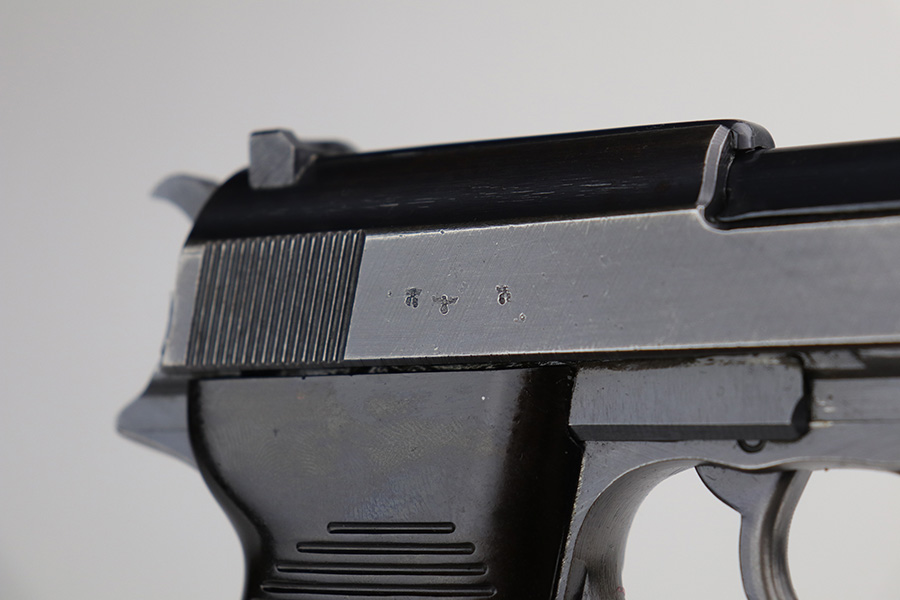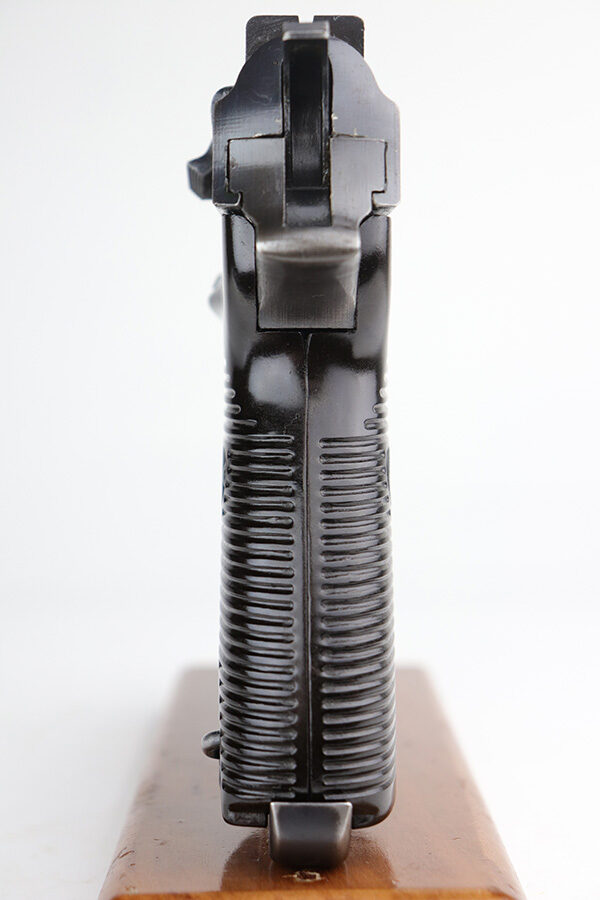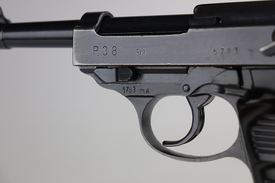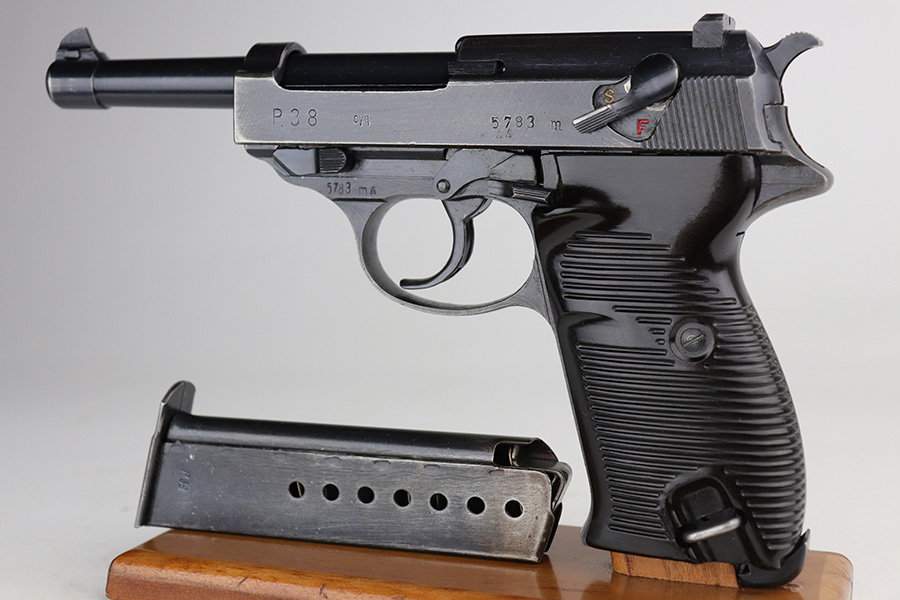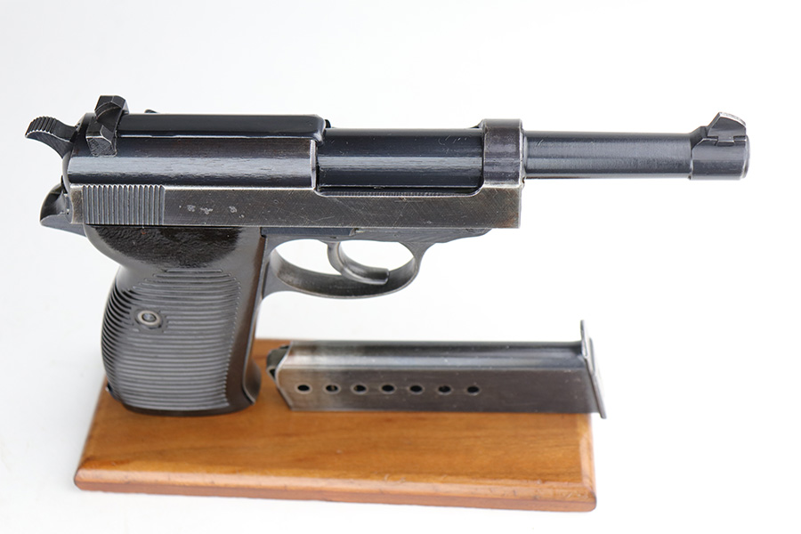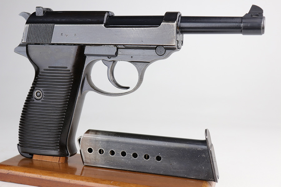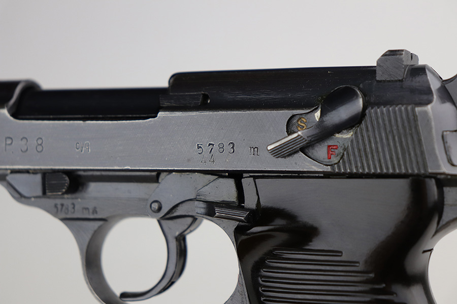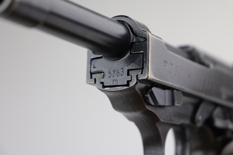 10/1/21 – This is a very nice example of a Spreewerk P.38 issued to the Nazi military in March of 1944. It is all matching and has the proper “Eagle 88” military acceptance proofs. There is a “44” marking under the serial number on the left side of the slide. We are not sure if this marking is factory or applied after. It would make most sense that this marking indicates the date of manufacture. The gun has retained about 90% of its finish. There is minor thinning on the front strap and very minor wear on the high edges of the slide and around the muzzle. A few very light scratches on the right side of the slide. Comes with excellent bakelite grips and a period-correct jvd magazine. The bore is excellent – shiny with strong rifling. De-cocker is functional.