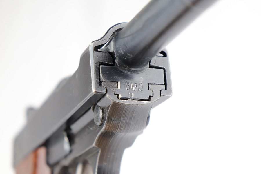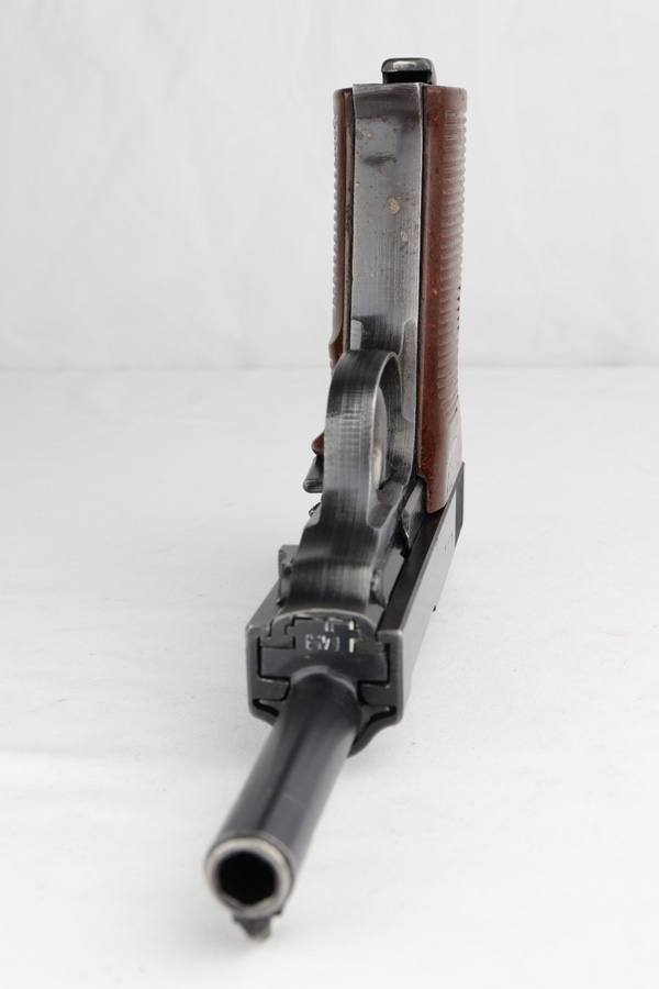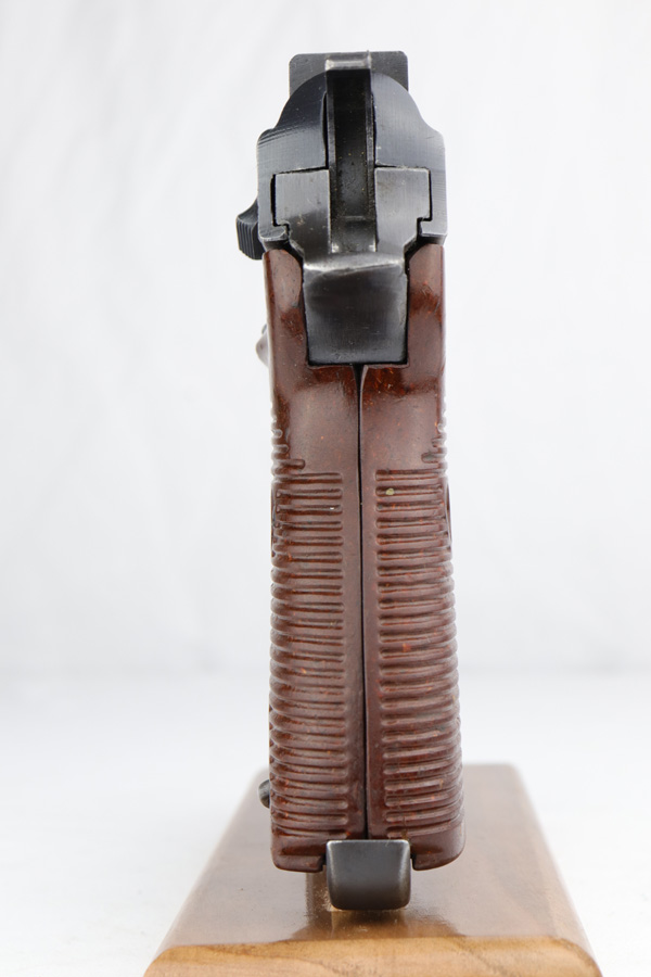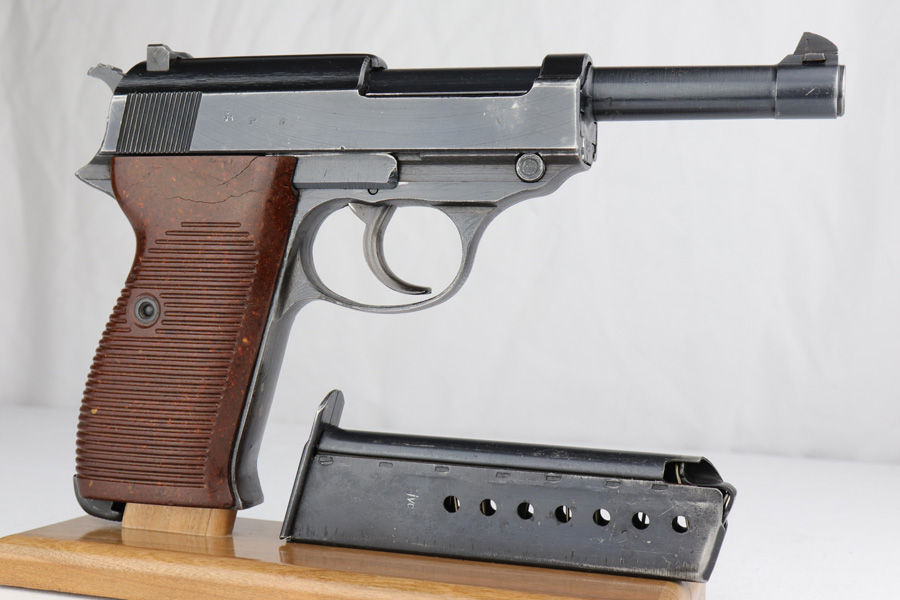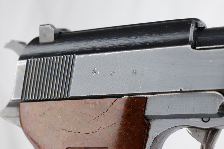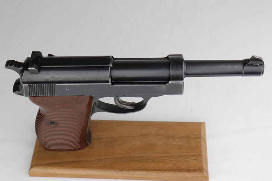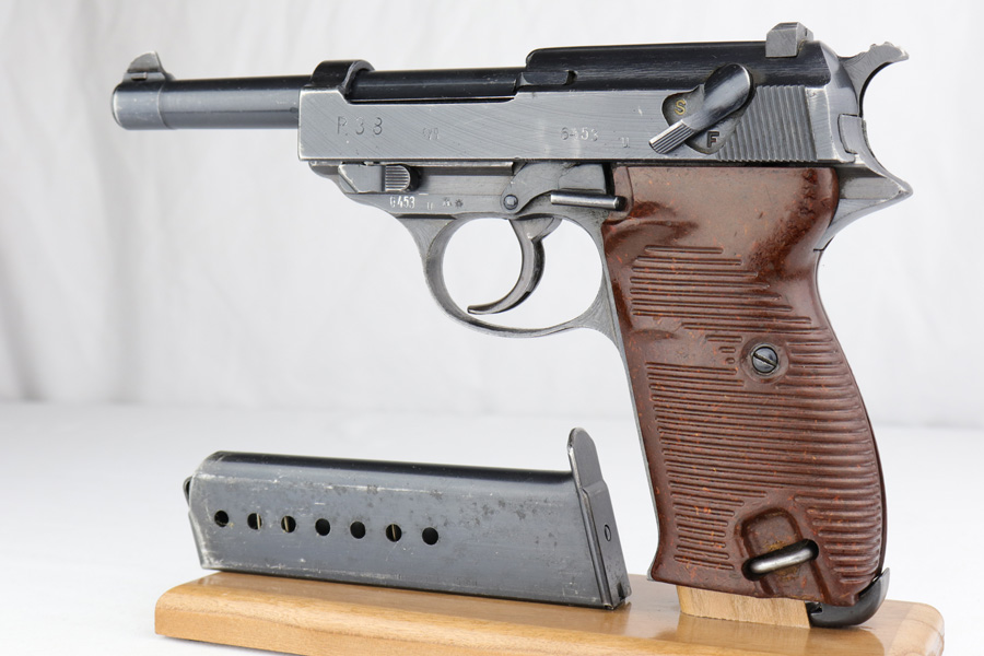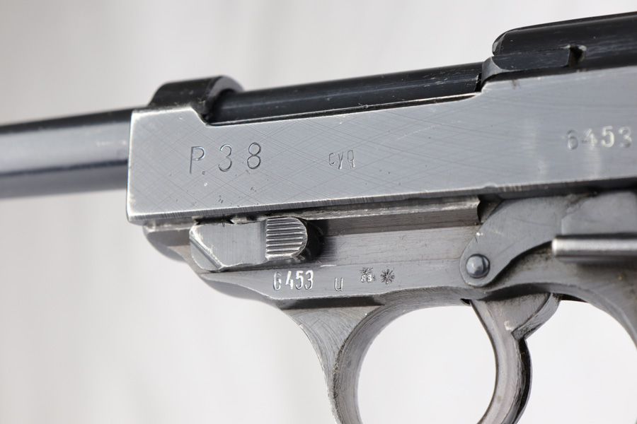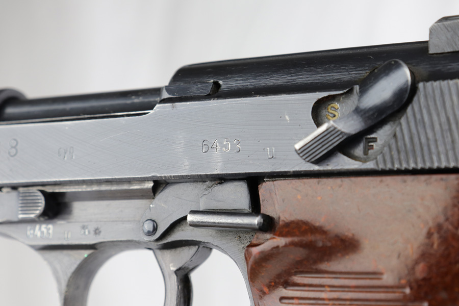 3/21/19 – This is a nice, all matching and original Spreewerk P.38 from September of 1944. Very nice profile view aside from minor muzzle and edge wear, but some thinning of the front strap/trigger guard, and a casting flaw in the metal (very common for these pistols). Minty bore. Excellent red grips. Good mechanics, including functioning de-cocker.