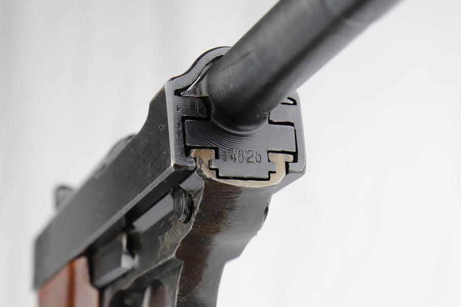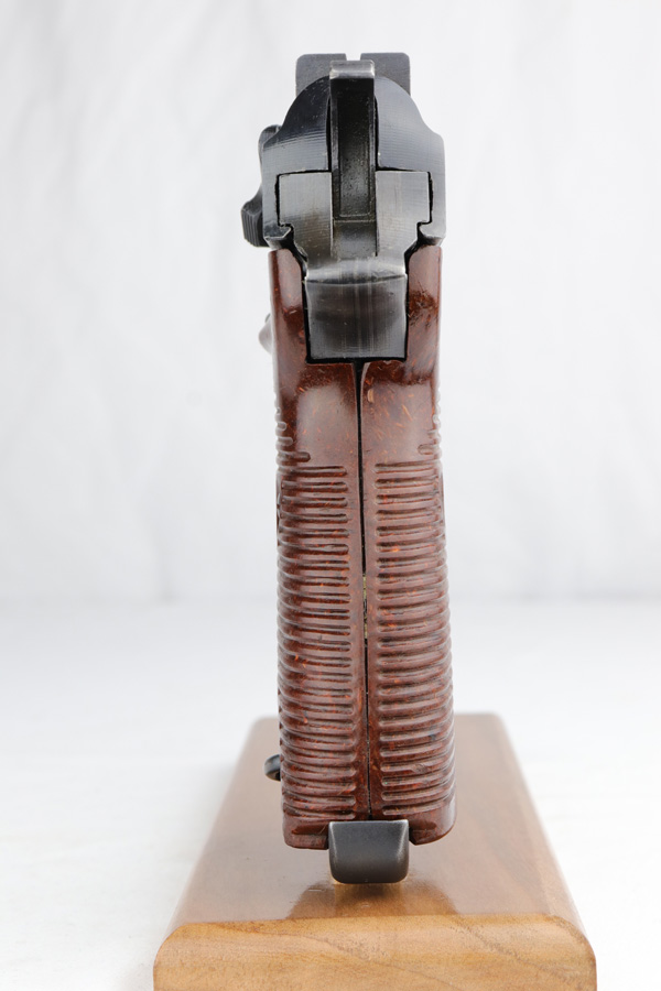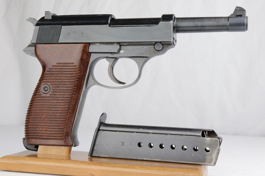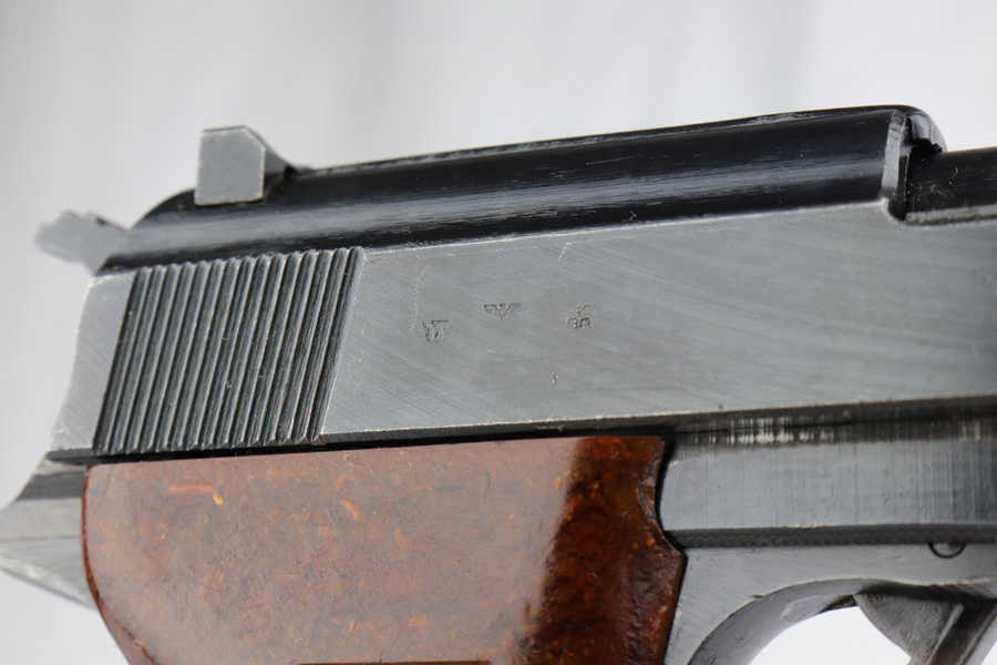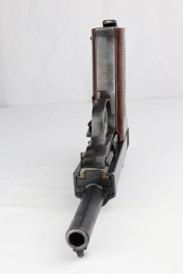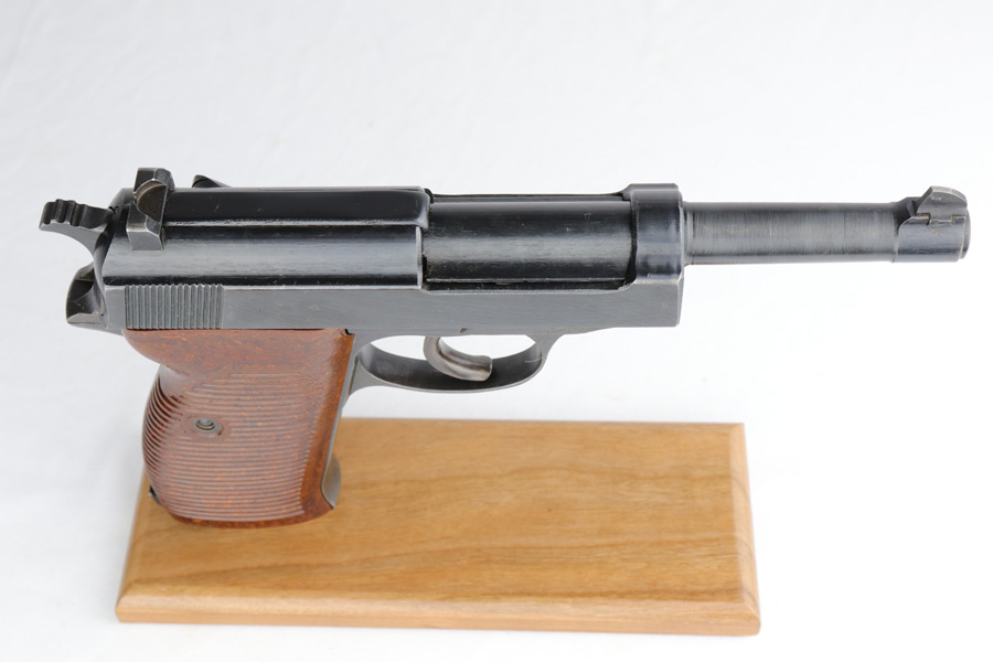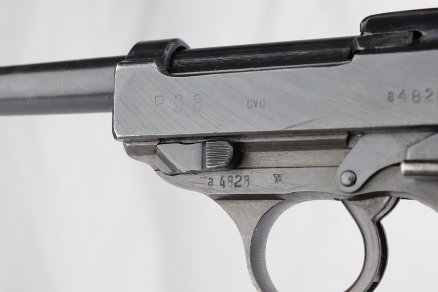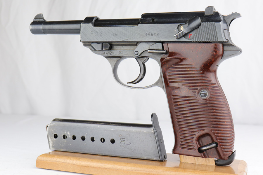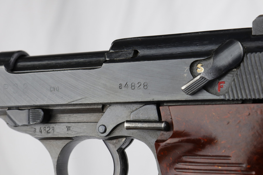3/15/19 – This is an excellent example of a late-war Spreewerk P.38, made in March of 1945. The original finish rates at 95-97%, and the pistol has all matching numbers. Minor muzzle wear and some thinning of the front strap. Late war features such as cog hammer present. Excellent red grips. Terrific bore.