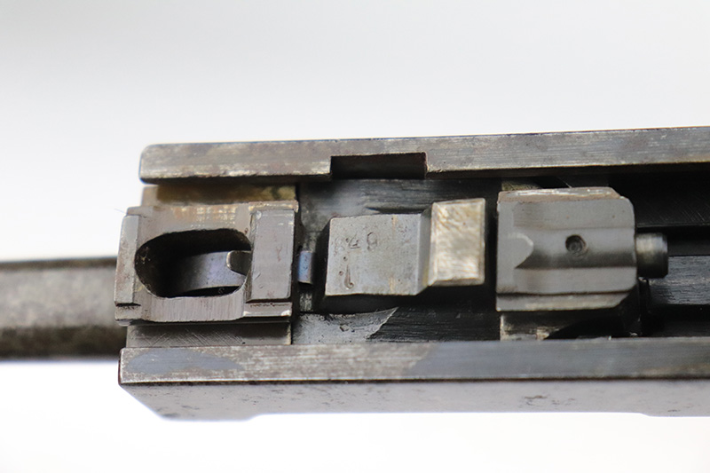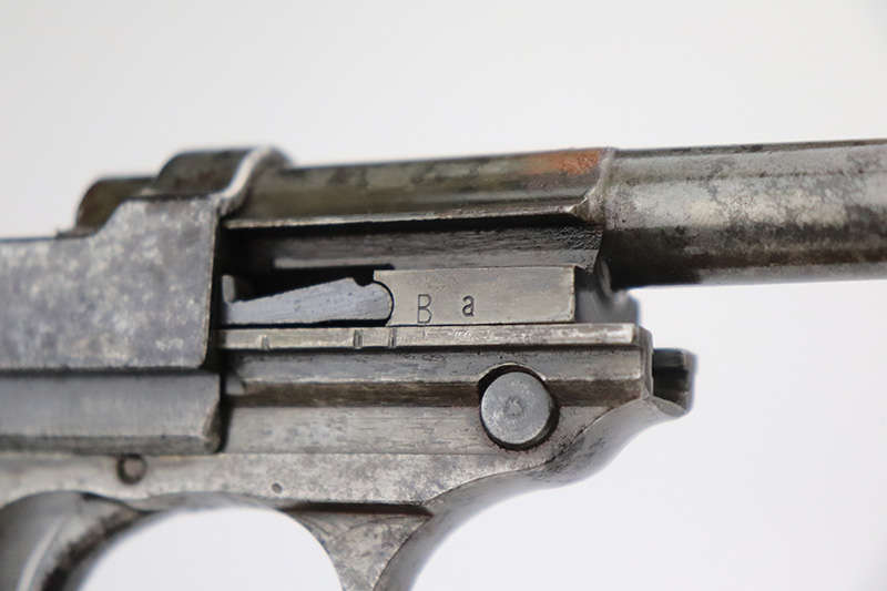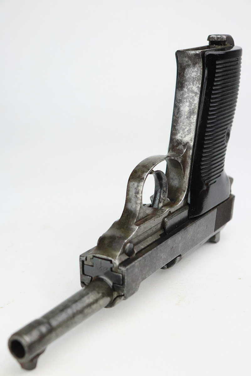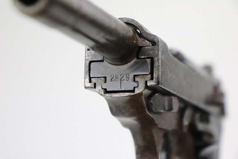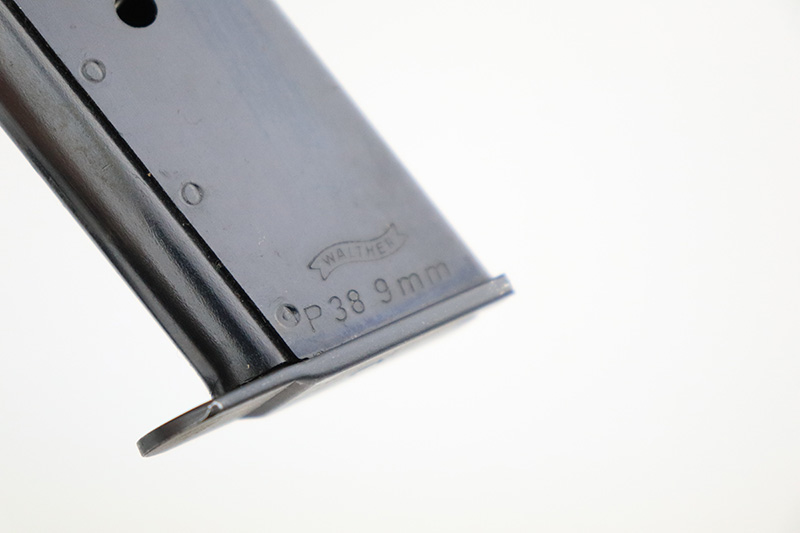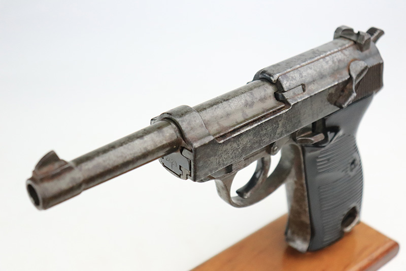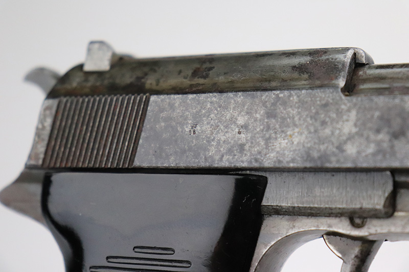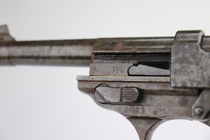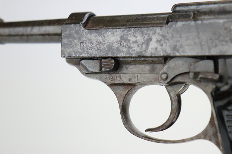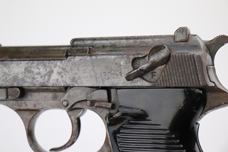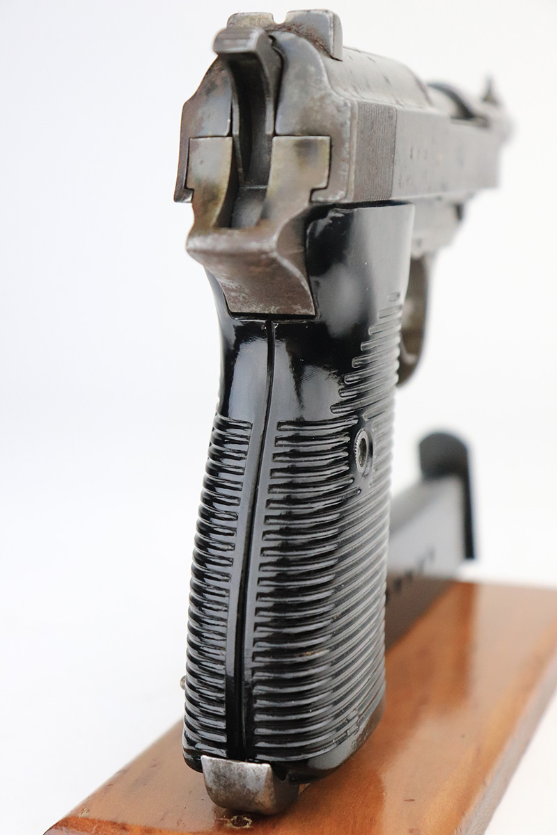 9/20/22 – This is a Spreewerk P.38 issued to the Nazi military in January of 1944. It is all matching and has the proper “Eagle 88” military acceptance proofs throughout. It has lost virtually all of its original finish and there is heavy spotty oxidation covering the whole gun. Comes with nice black plastic grips and a post-war magazine. The bore has strong rifling, but there is some light spotty oxidation around the muzzle end. De-cocker is not functional.