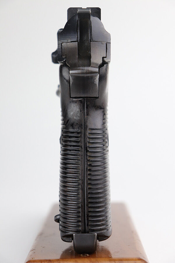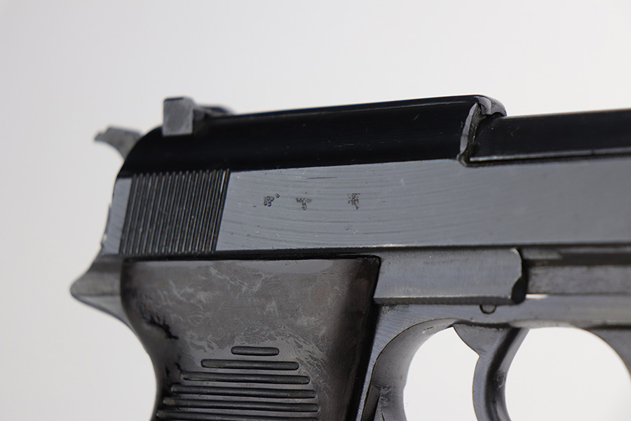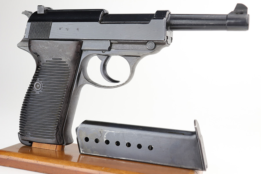9/14/21 – This is a beautiful, near-mint example of a late Spreewerk P.38 issued to the Nazi military near the end of WW2, in February of 1945. It has a late-war “a” prefix serial number, it is all matching, and has the proper “Eagle 88” military proofs. It has retained more than 98% of its finish. There are a few light scuffs on the barrel. Light spotty oxidation on the front strap and on the barrel. Some tiny handling marks on the right side of the slide. Comes with excellent grips and a period-correct jvd magazine. Mint bore. De-cocker is functional.